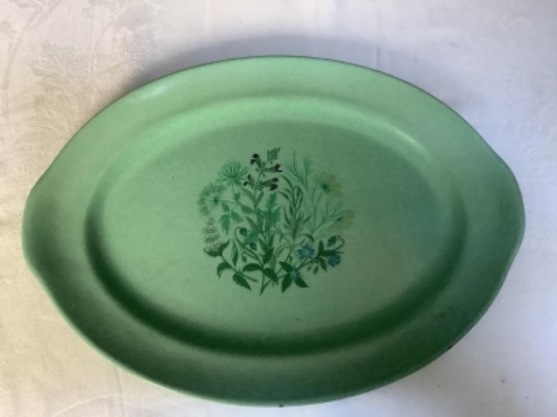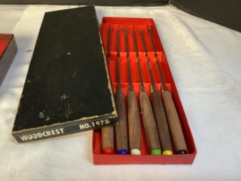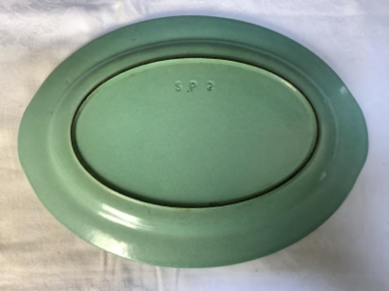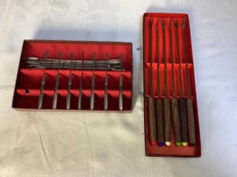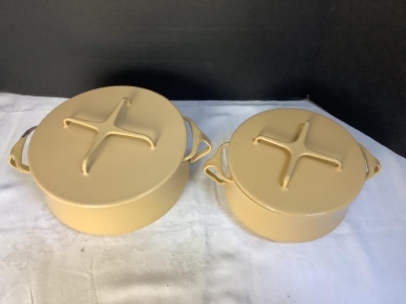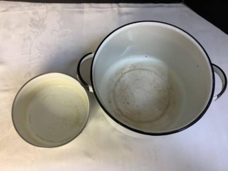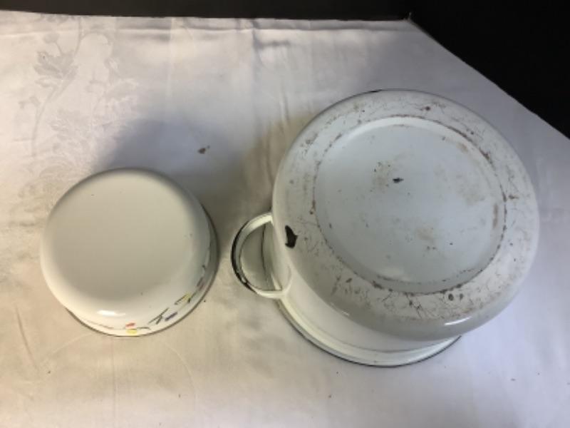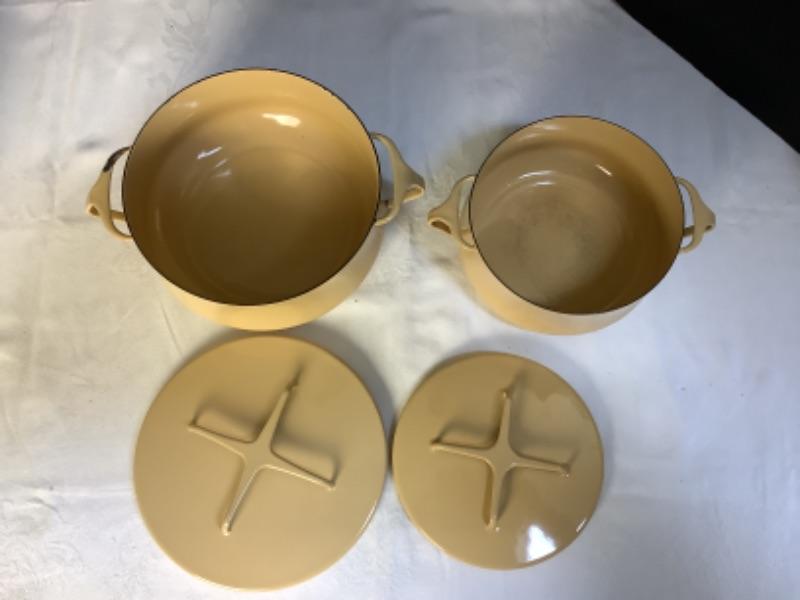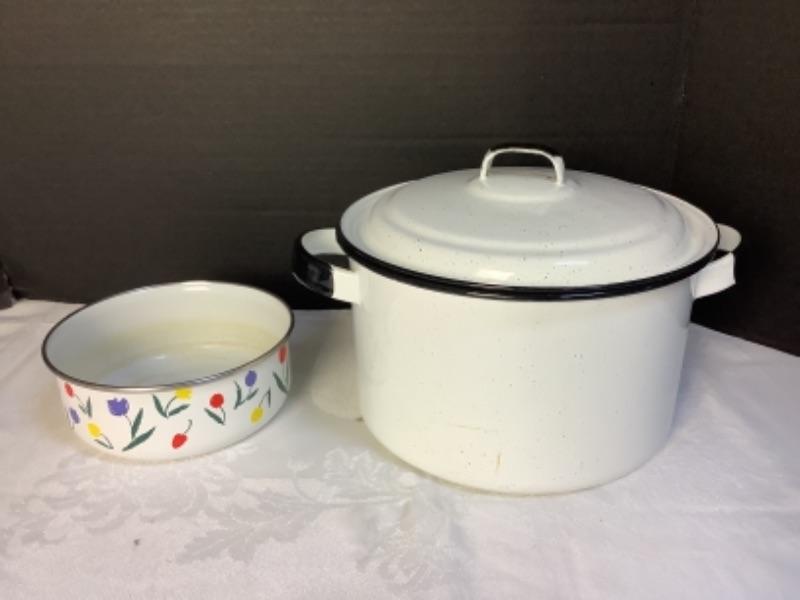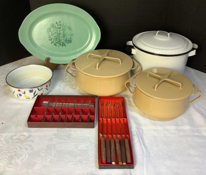 Two Dansk enamelware Dutch ovens with lids- 9” round x 4” deep and 7-1/2” round x 3-1/2” deep, bigger pot has a few chips in the enamel, White and black enamel pot, small enamel pot with tulips on it has some damage inside (see photos), Enamel cast iron platter with floral design stamped SP2 on bottom 13” long 9-1/2”Woodcrest no.1978 fondue forks and Klamath fondue forks