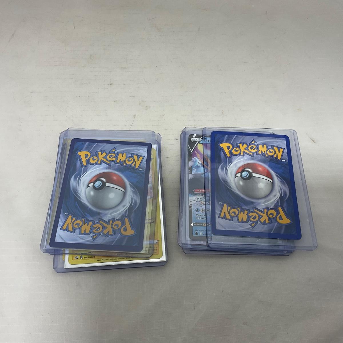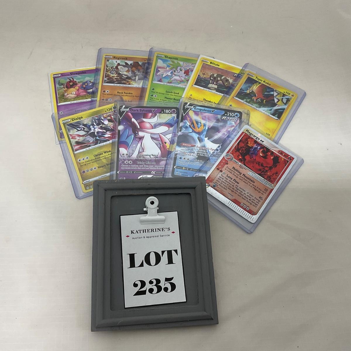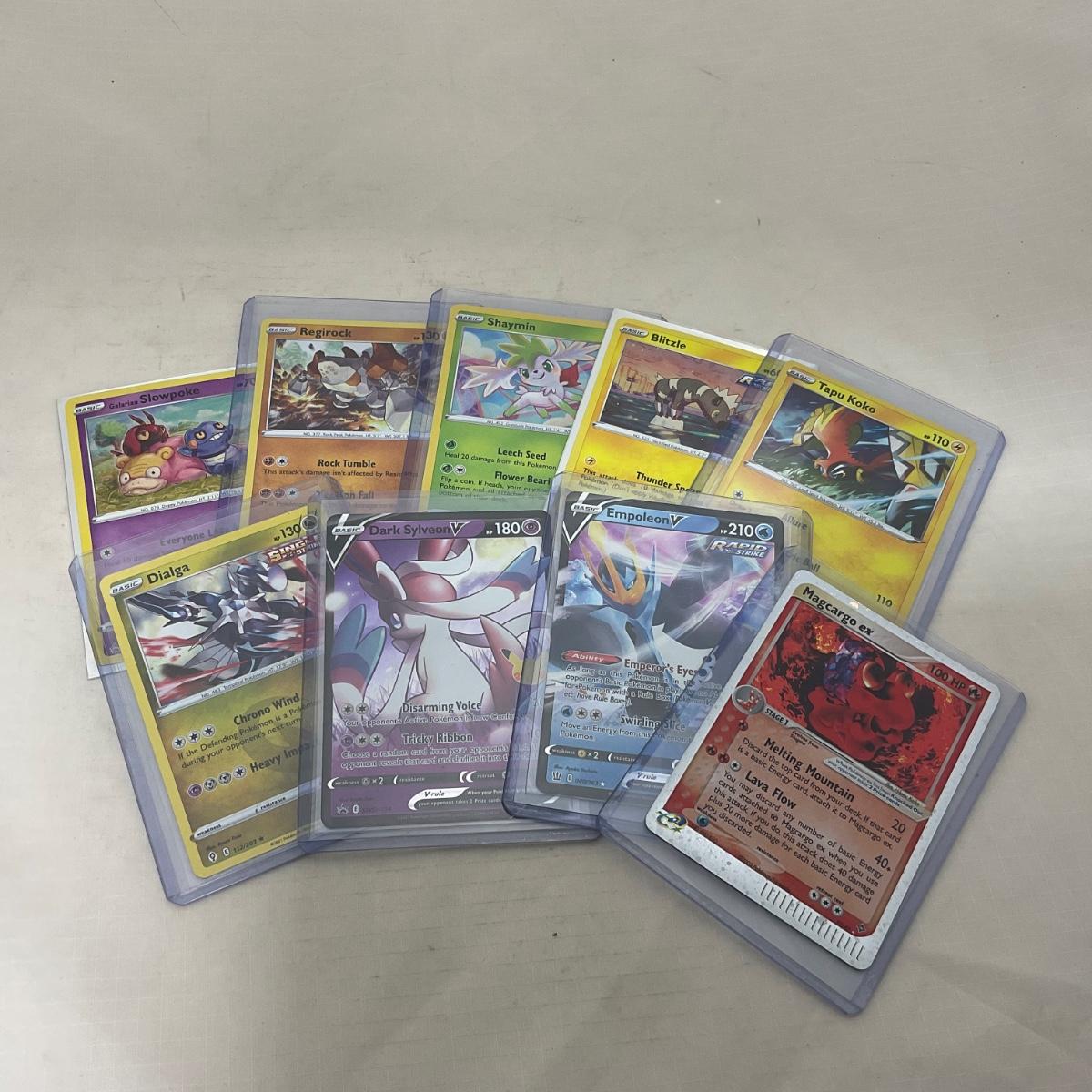 Nine Pokemon Rare and Ultra Rare Cards. With sleeves included. Please see photos for details and condition. ::: Shipping is available on this lot. If you require shipping you must let us know at the close of the auction. We will coordinate with you after the item has been won. Shipping fees will include insurance up to or exceeding the value of all items being mailed. If you have any questions regarding this lot please contact the auctioneer either via this website, by direct email or by phone. PICK UP TIMES and other important information can be found in the TERMS and DESCRIPTION of the auction. Please take a look for pertinent information. Thanks!