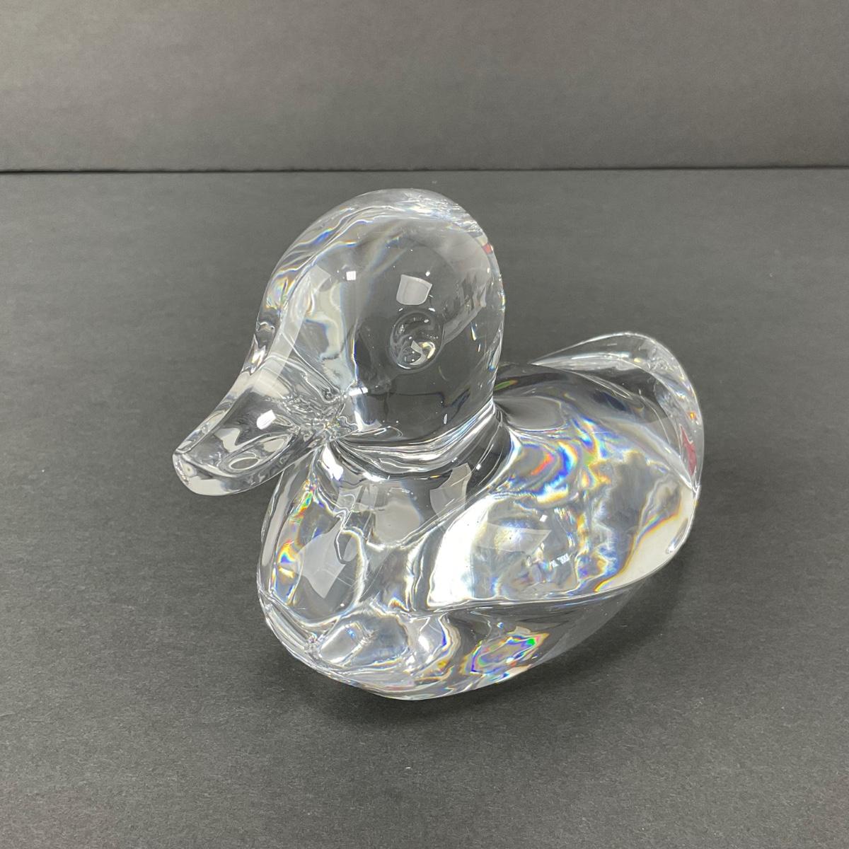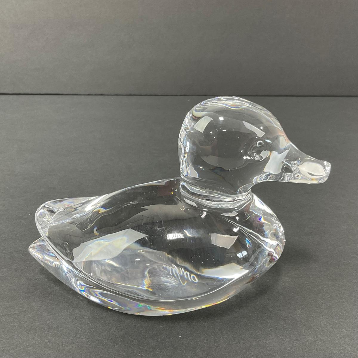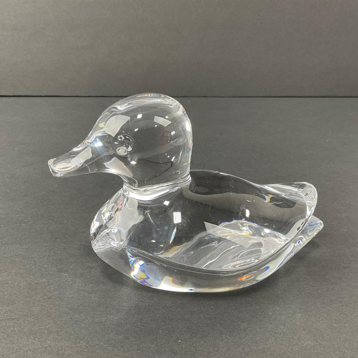 One marked Orrefors Swedish art glass crystal duck figure. This piece has no damage, and appears to be in great shape with no visable chips, cracks, or broken pieces. Please see photos for details and condition. Any condition statement is given as a courtesy to a client, is an opinion, and should not be treated as a statement of fact. Reference to condition written, oral or within a condition report shall not be regarded as a full account of condition and may not include all defects, alterations, or restorations. Absence of a condition report does not imply a lot is flawless or lacking imperfections or damage. Katherine’s Auction & Appraisal Service shall have no responsibility for any error or omission. Returns shall not be accepted on the basis of condition. ::: Shipping is available on this lot. If you require shipping you must let us know at the close of the auction. We will coordinate with you after the item has been won. Shipping fees will include insurance up to or exceeding the value of all items being mailed. If you have any questions regarding this lot please contact the auctioneer either via this website, by direct email or by phone. PICK UP TIMES and other important information can be found in the TERMS and DESCRIPTION of the auction. Please take a look for pertinent information. Thanks!