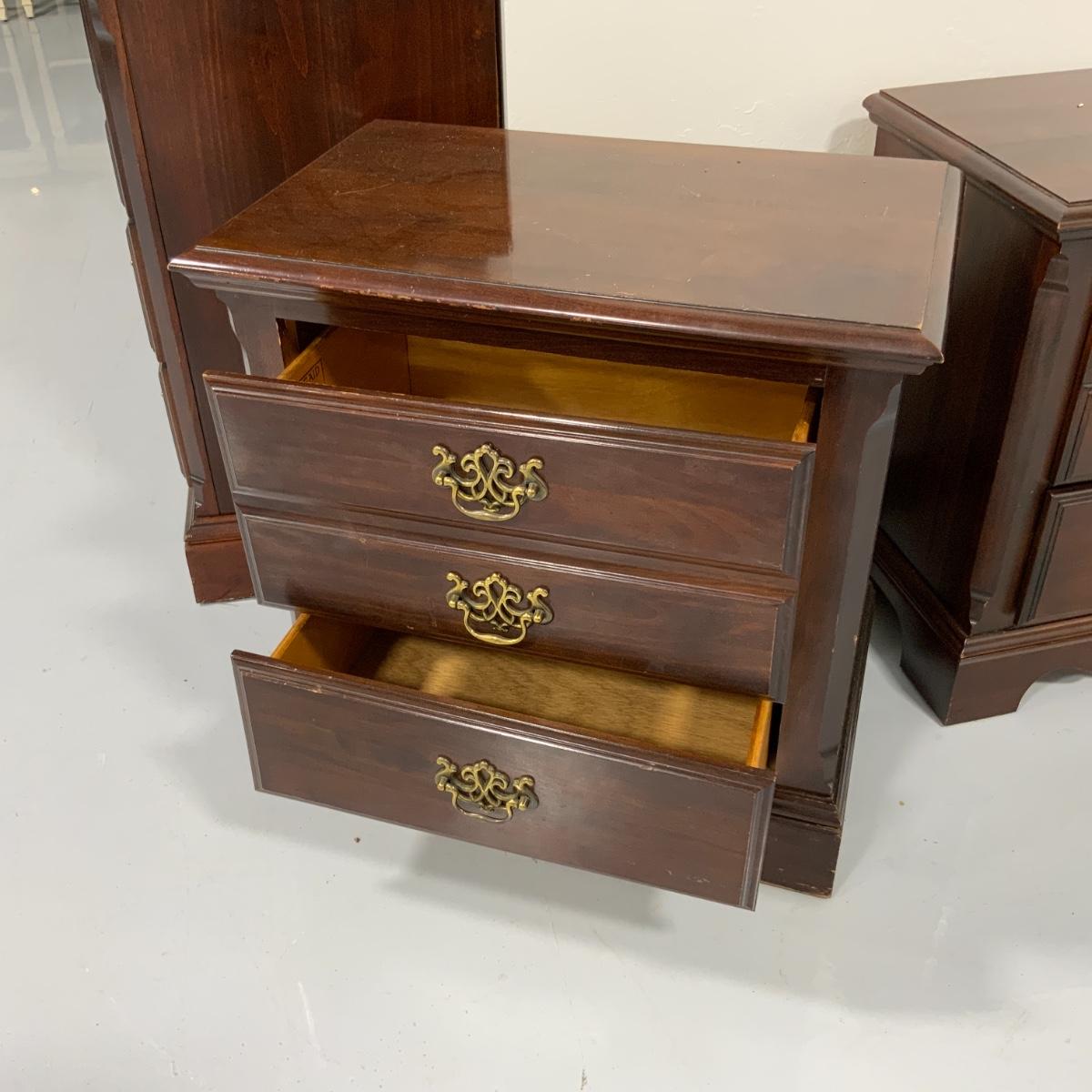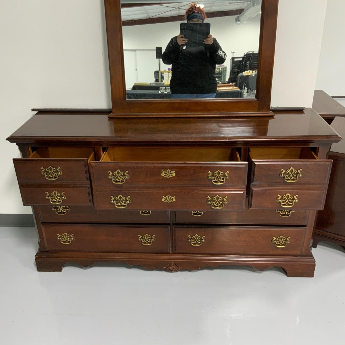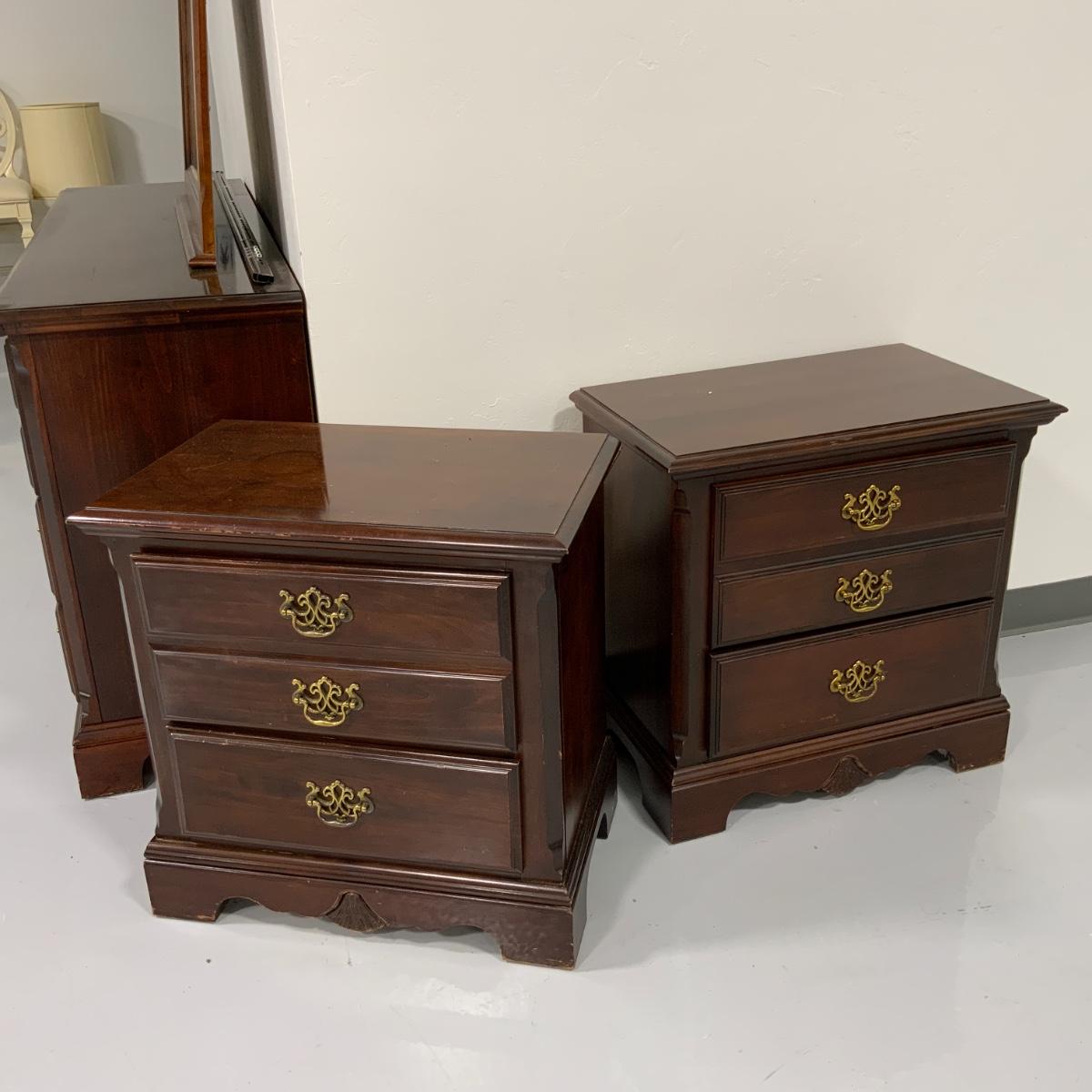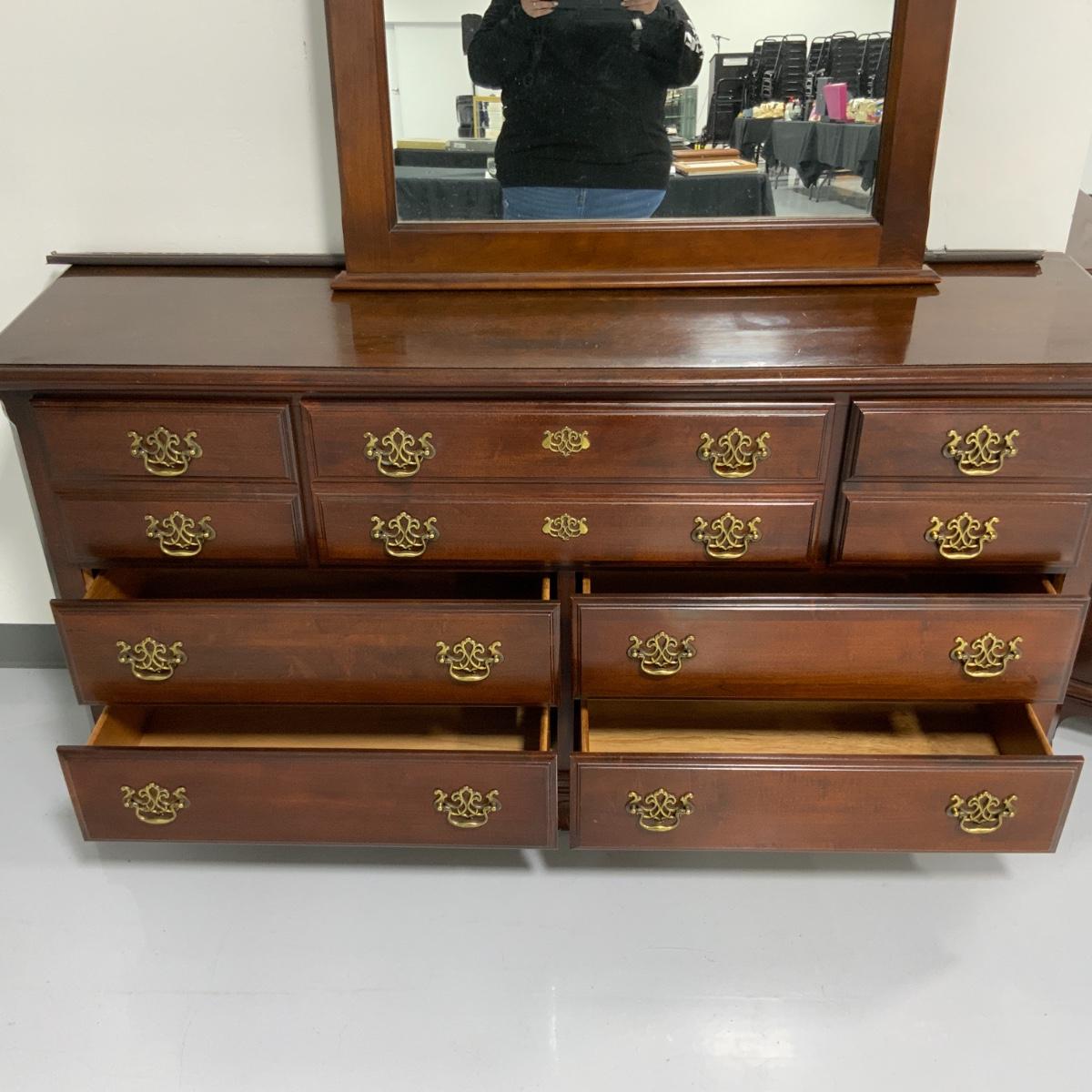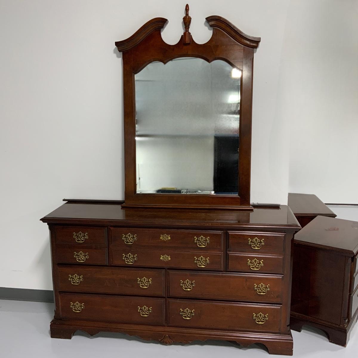 From the Estate of Peter and Alice Radovanovich: Beautiful Kinkade Seven Drawer Dresser with Mirror that can be hung on the wall or mounted on top of the dresser. Two matching side tables too! I forgot to jot down these measurements before I am going to post the auction, so if you’re reading this let me know and I’ll update the listing as soon as possible. Please see photos for details and condition. ::: Shipping is NOT available on this lot. If you have any questions regarding this lot please contact the auctioneer either via this website, by direct email or by phone. PICK UP TIMES and other important information can be found in the TERMS and DESCRIPTION of the auction. Please take a look for pertinent information. Thanks!
