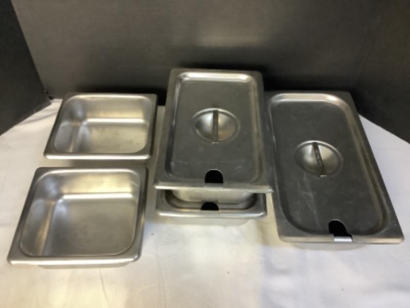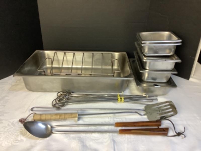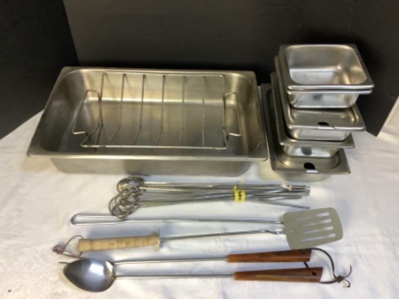 6 stainless steel steam table pans, 3 have lids and 3 do not, various sizes, roasting rack, skewers, 2 long handle meat forks, long handle spatula and long handle spoon