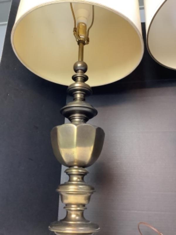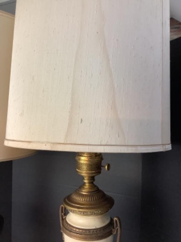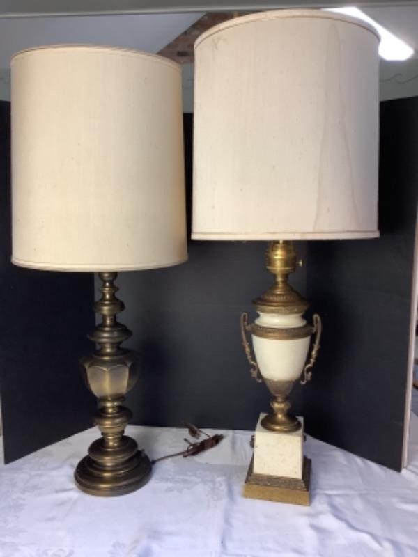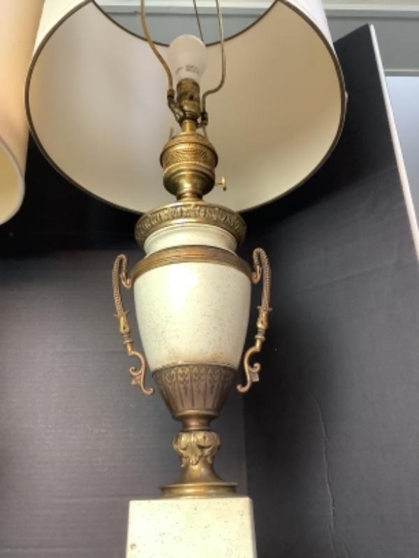 Brass table lamp with lamp shade measures 38” high including lamp shade,Metal and Brass Urn style lamp with lamp shade measures 40” high including lamp shade- lamp shade has a water stain (see photos)