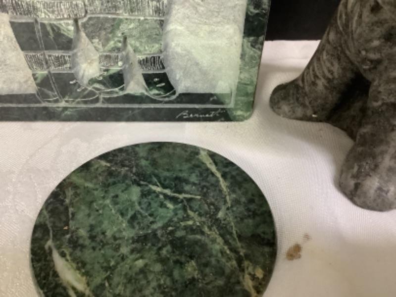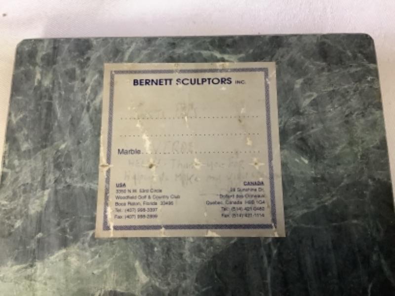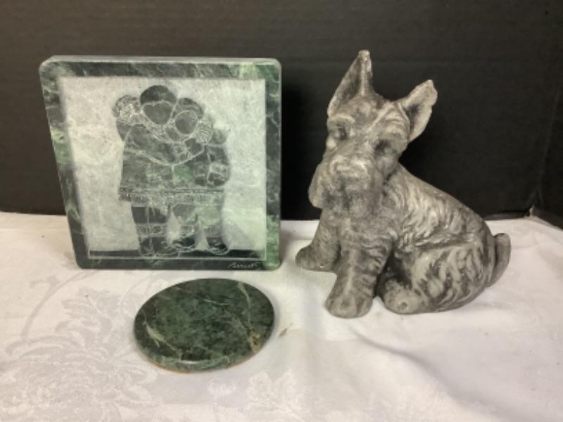 Signed green marble arcing “Just Pals” by Bernett Sculptors 7” x 7” , Carves Scottish Terrier 7-1/2” tall