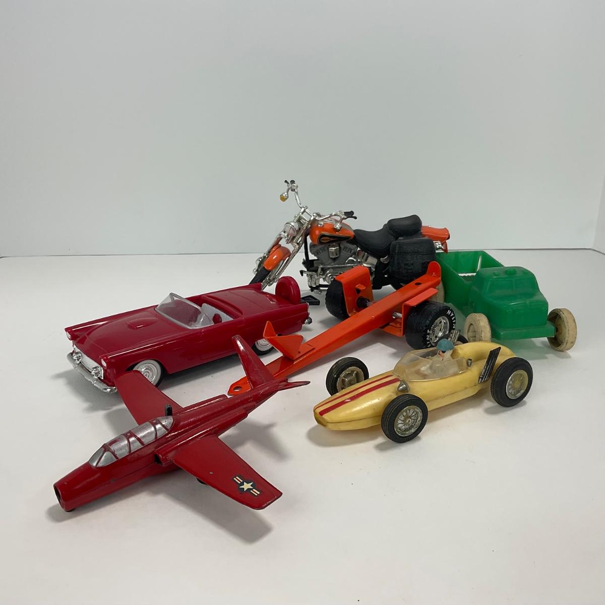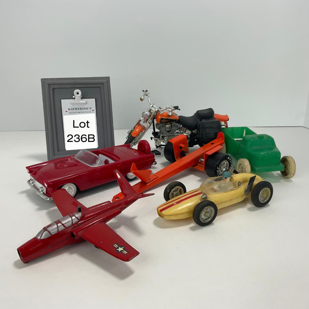 Six vintage toy vehicles or pieces of transportation. There is some wear and love with these piece. Please see photos for details and condition. ::: Shipping is available on this lot. If you require shipping you must let us know at the close of the auction. We will coordinate with you after the item has been won. Shipping fees will include insurance up to or exceeding the value of all items being mailed. If you have any questions regarding this lot please contact the auctioneer either via this website, by direct email or by phone. PICK UP TIMES and other important information can be found in the TERMS and DESCRIPTION of the auction. Please take a look for pertinent information. Thanks!