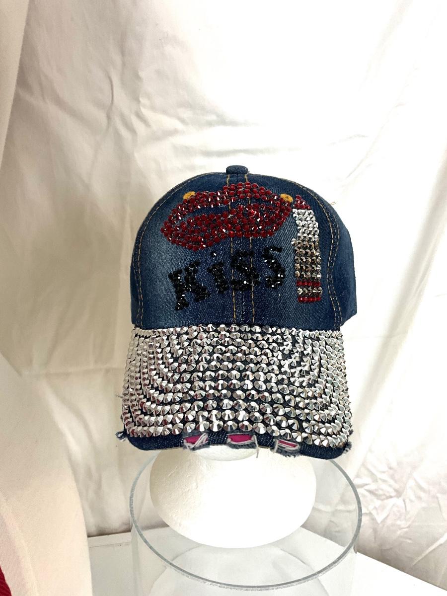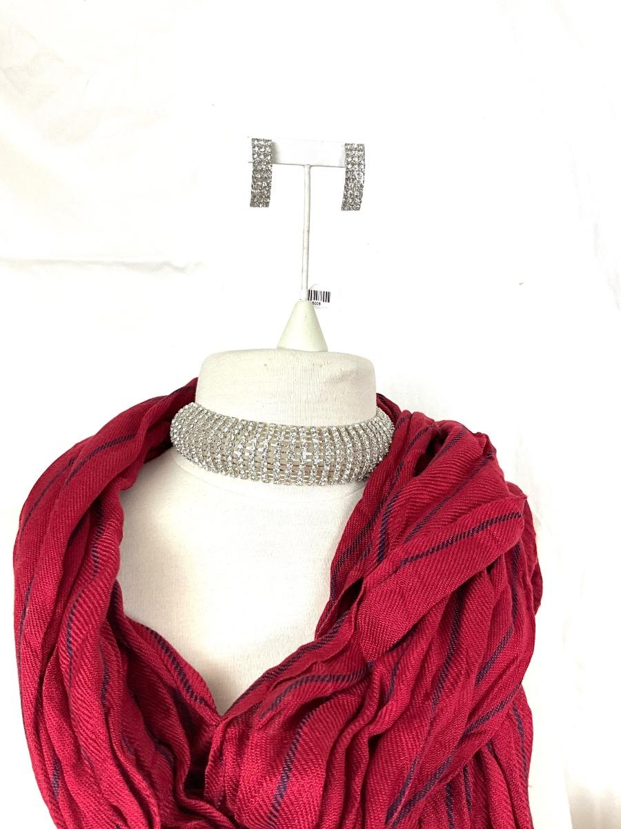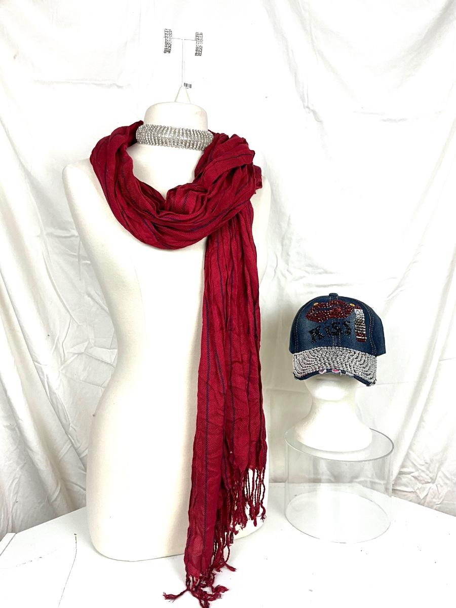 237 "KISS" Studded Rhinestone Cap with Rhinestone Choker and Earring Set, Red Scarf
