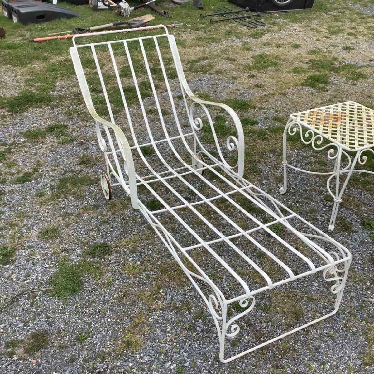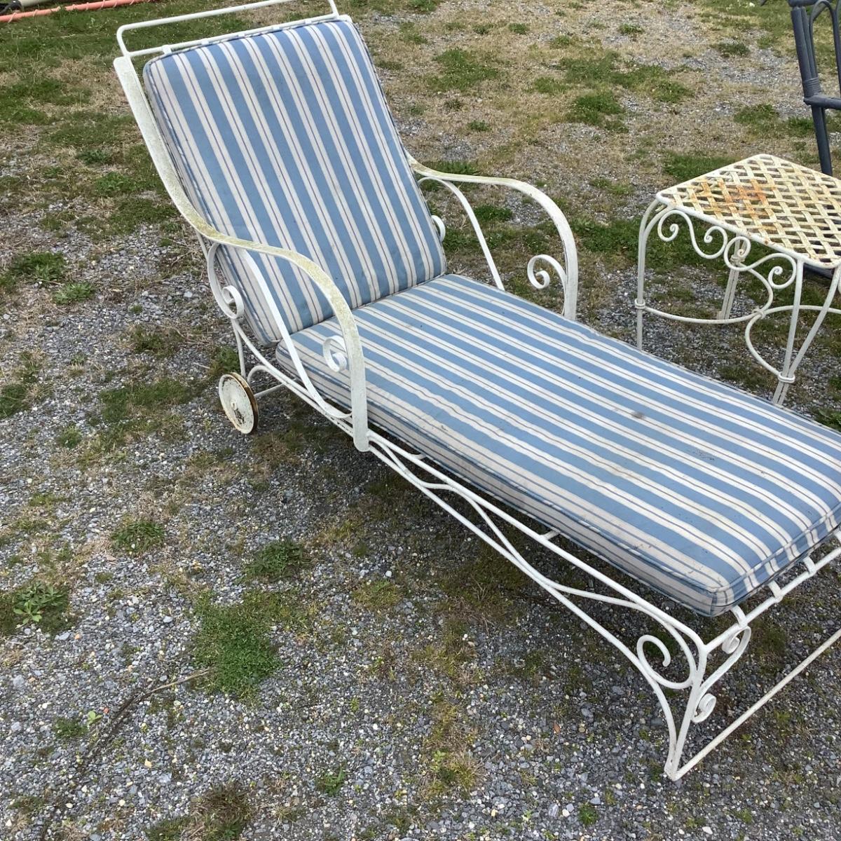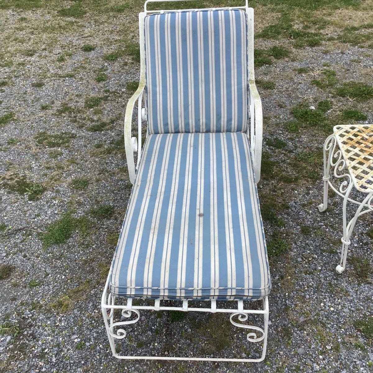 237 Antique Metal Patio Chaise Lounge Chair with Blue Striped Cushions
