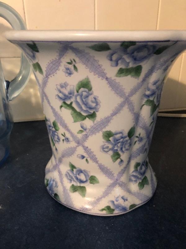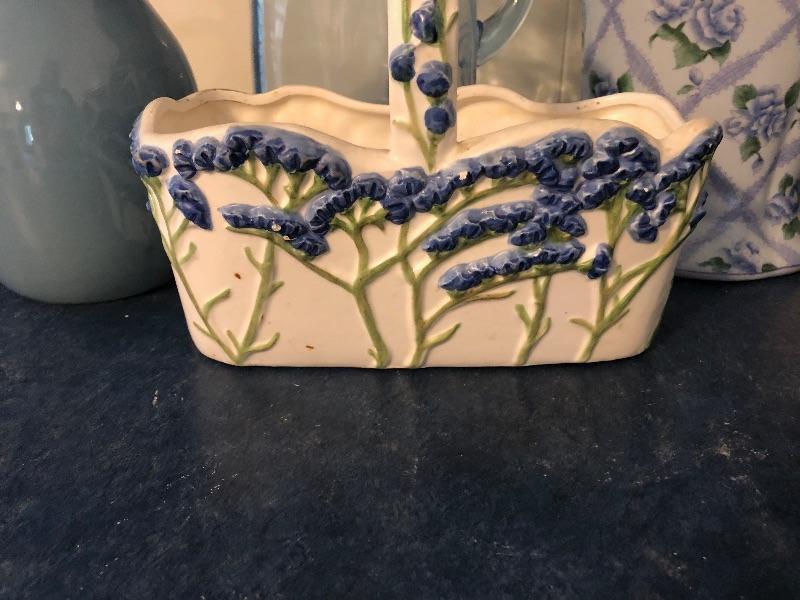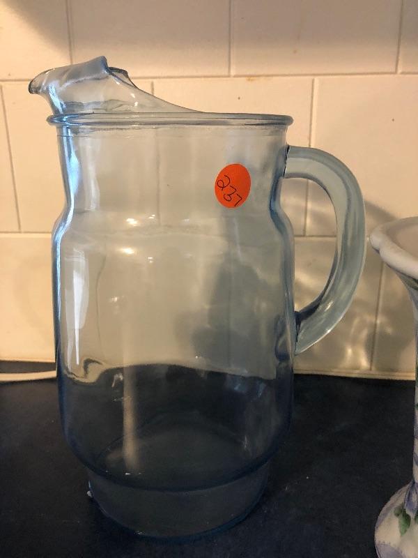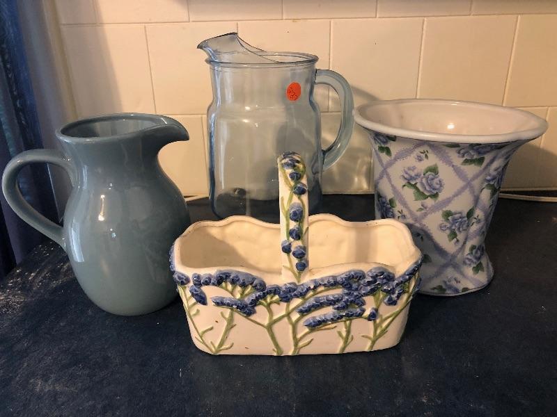 Includes two glass pitchers, blue floral basket, and vase. Great condition. This is an ONSITE Auction all items will need to be picked up on location. Please see auction description for pick up procedures