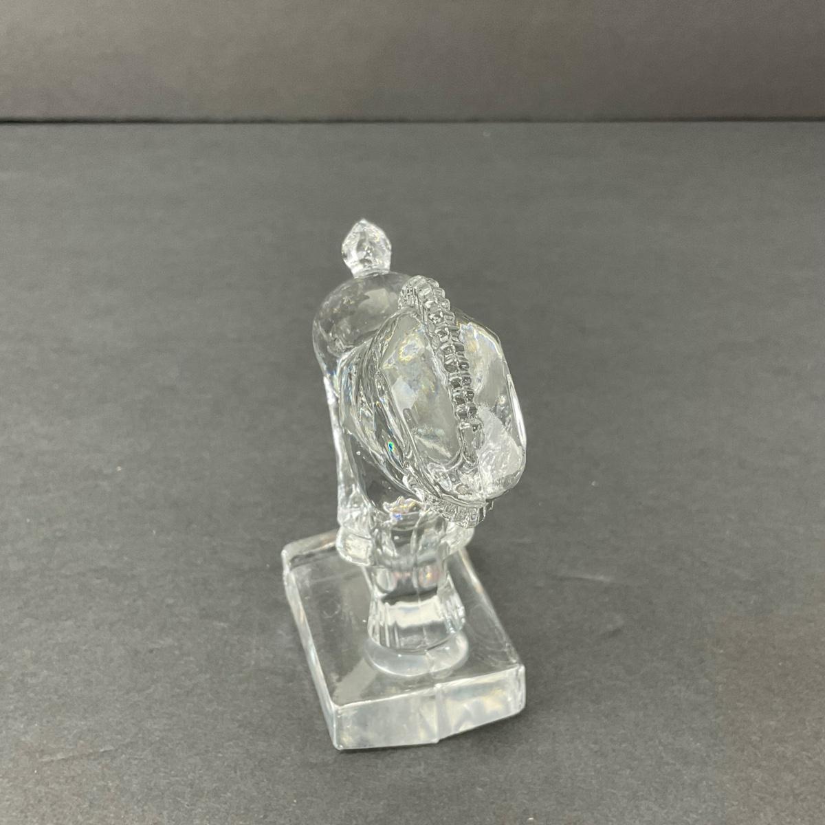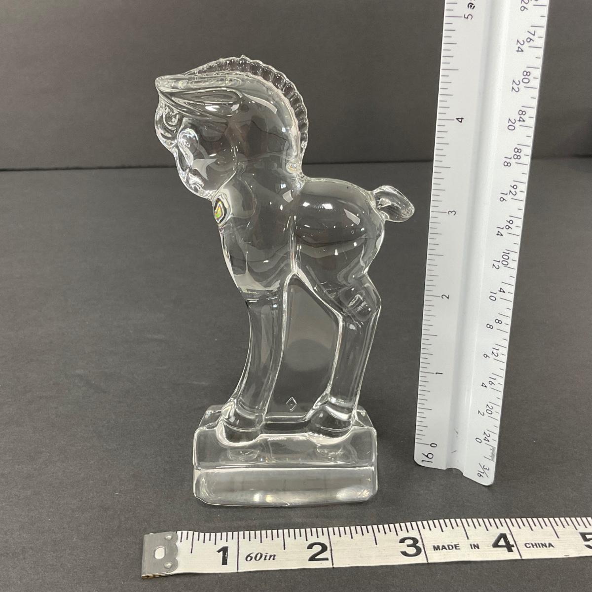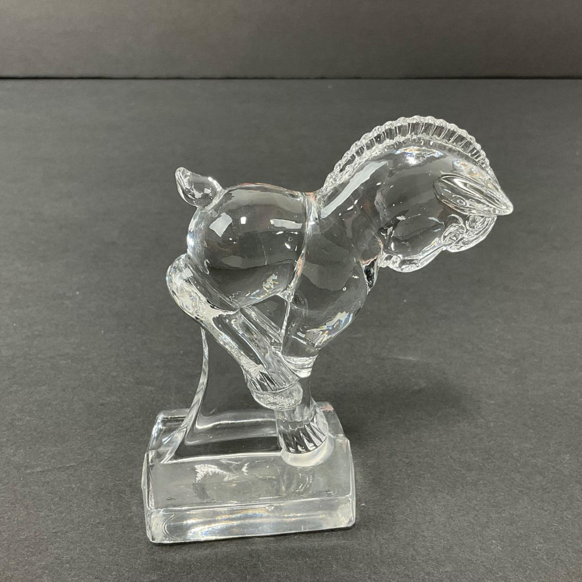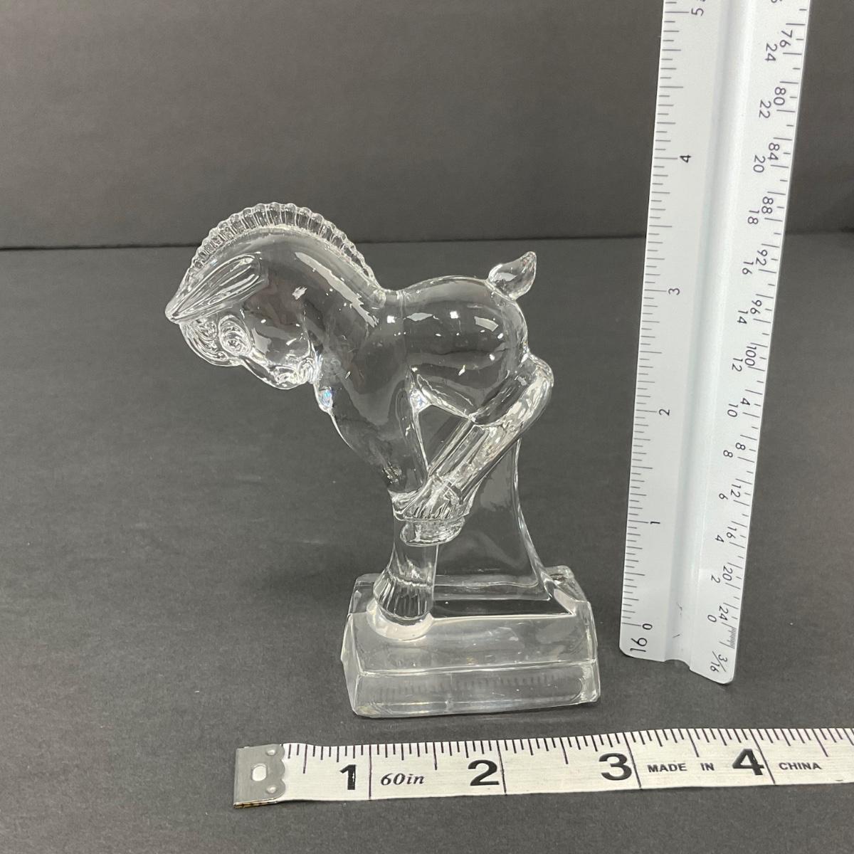 Three art glass Heisey colt figures one standing, one kicking, and one rearing. These pieces appear to have some chipping and damage on there bottom bases. Please see photos for details and condition. Any condition statement is given as a courtesy to a client, is an opinion, and should not be treated as a statement of fact. Reference to condition written, oral or within a condition report shall not be regarded as a full account of condition and may not include all defects, alterations, or restorations. Absence of a condition report does not imply a lot is flawless or lacking imperfections or damage. Katherine’s Auction & Appraisal Service shall have no responsibility for any error or omission. Returns shall not be accepted on the basis of condition. ::: Shipping is available on this lot. If you require shipping you must let us know at the close of the auction. We will coordinate with you after the item has been won. Shipping fees will include insurance up to or exceeding the value of all items being mailed. If you have any questions regarding this lot please contact the auctioneer either via this website, by direct email or by phone. PICK UP TIMES and other important information can be found in the TERMS and DESCRIPTION of the auction. Please take a look for pertinent information. Thanks!