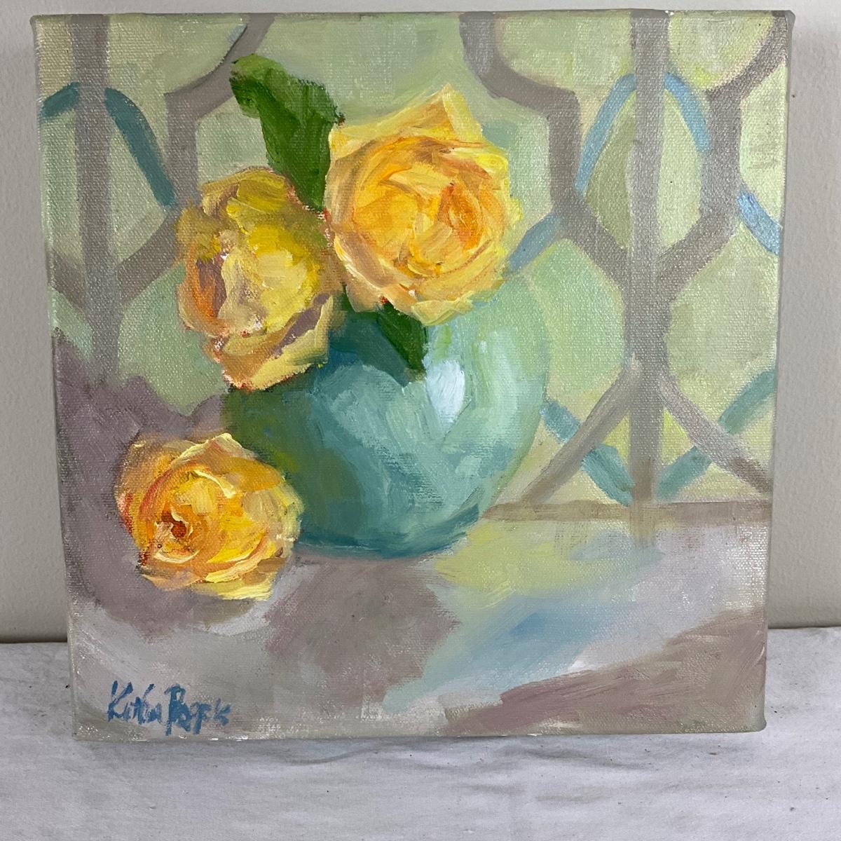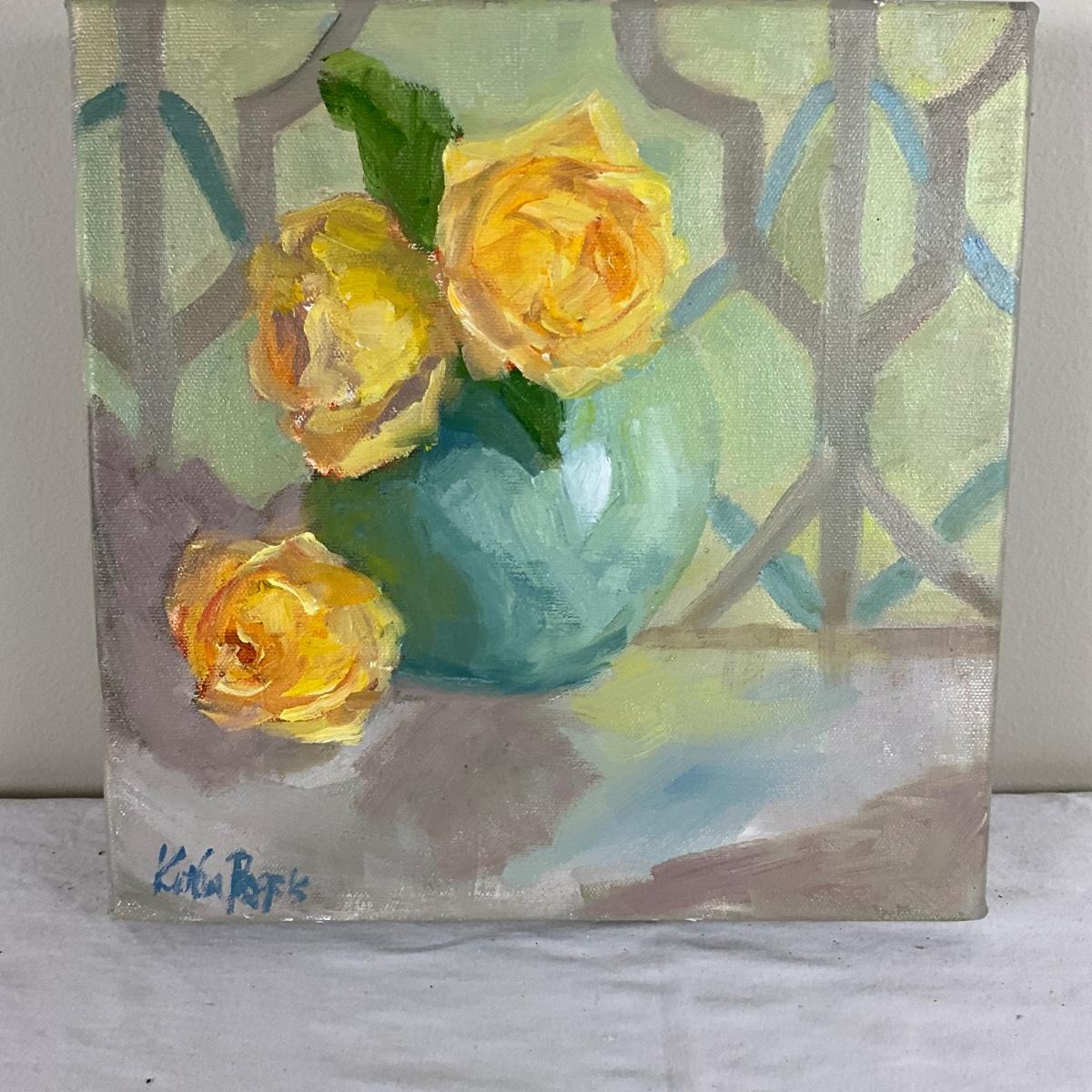 237 Original Oil Painting Yellow Flowers with Blue Vase by Kathie Rogers