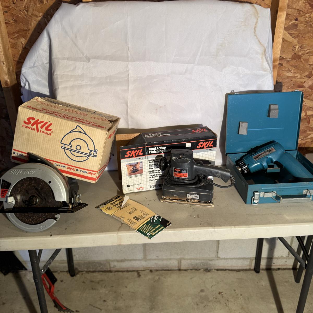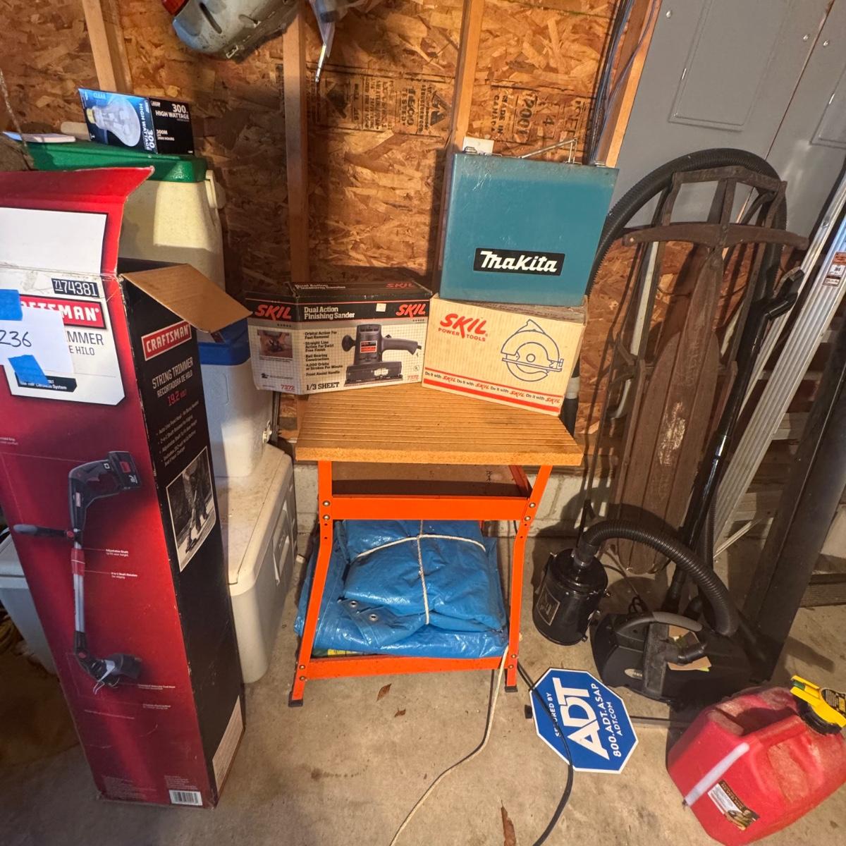 NOTE: The Mikita has not been tested and doesn’t not come with plug-in charger-“May” need new battery?? Included work table comes with tarp.