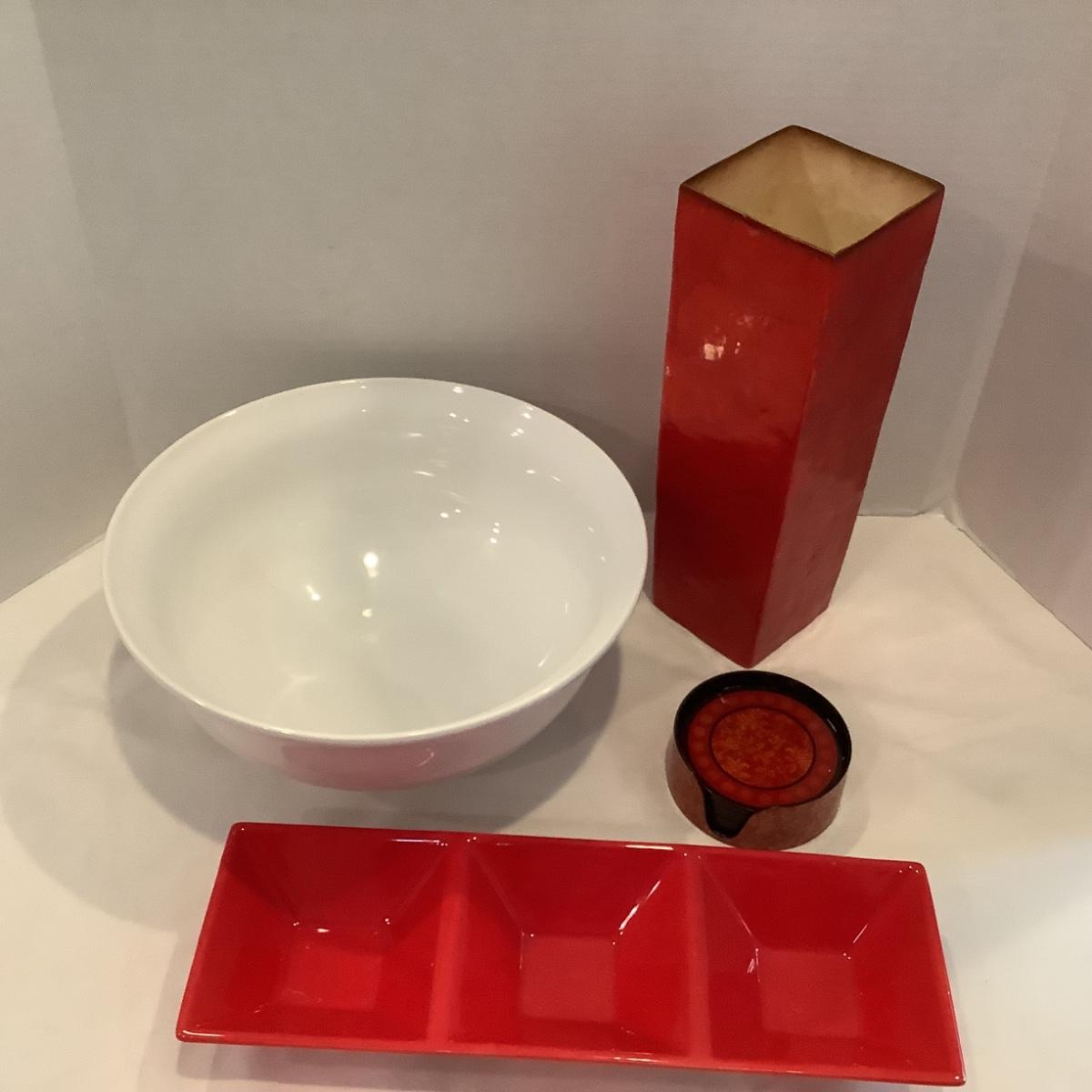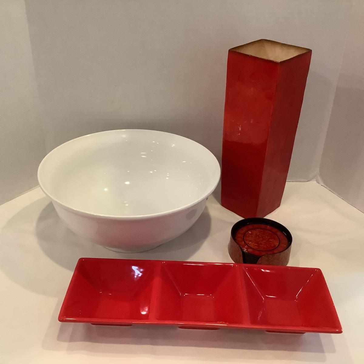 237 Red and White Decorative Bowls Lacquered Vase and Coasters