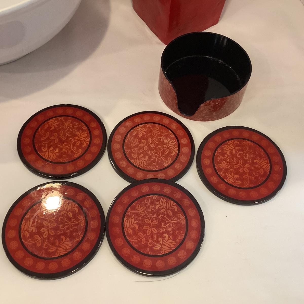 Red vase and coasters are lacquered.