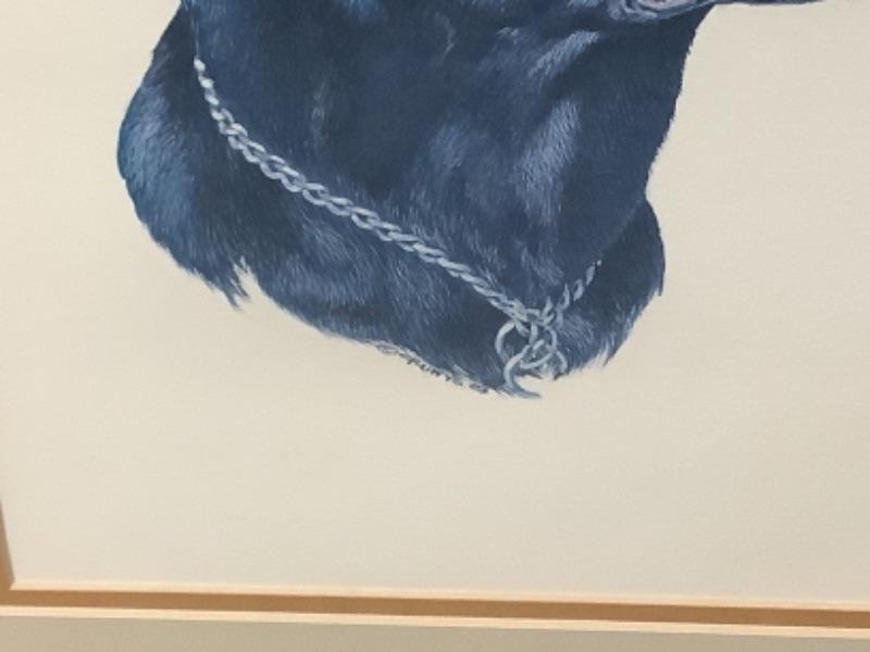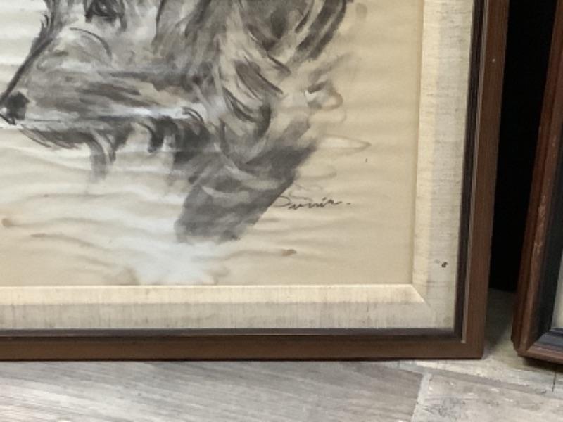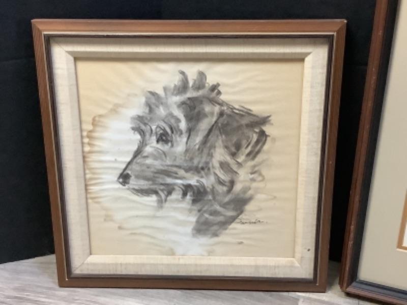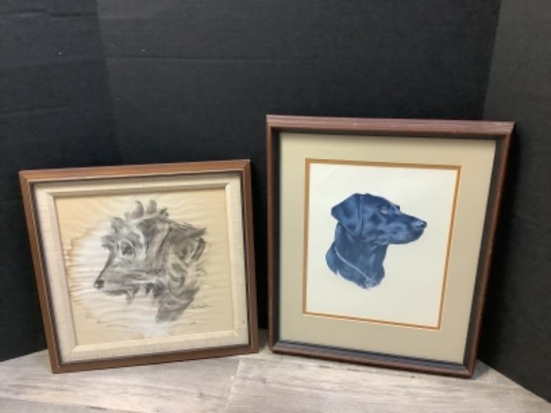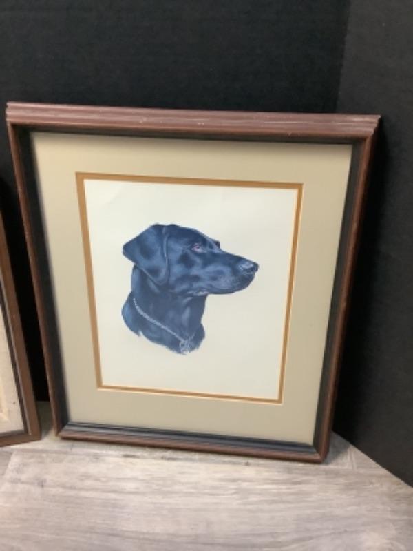 Framed dog sketch is signed see photos for signature, has water damage, measures 15” x15”, Black Labrador print measures 17-1/2” x 15”