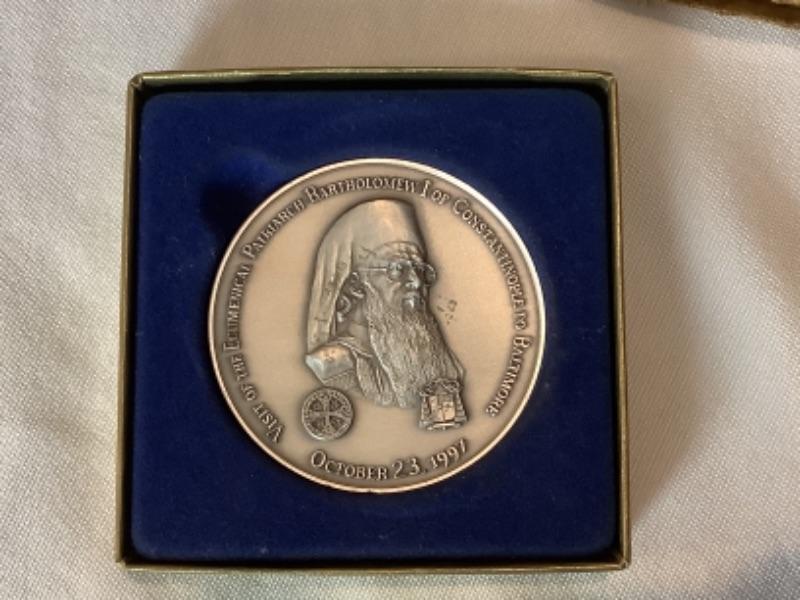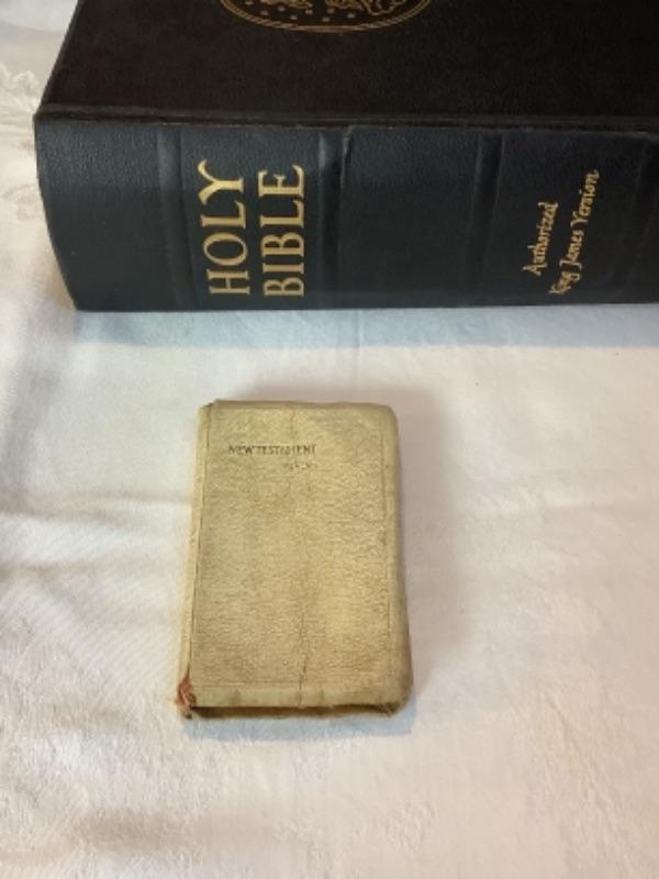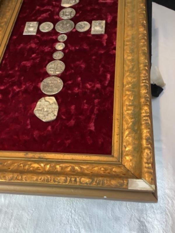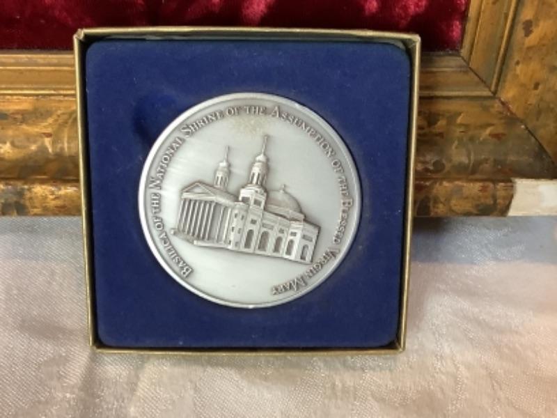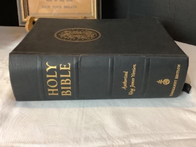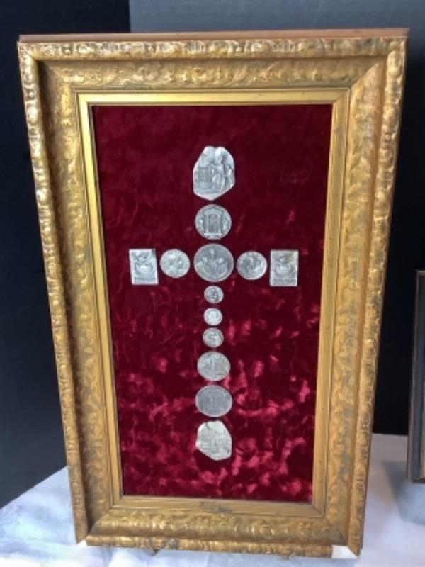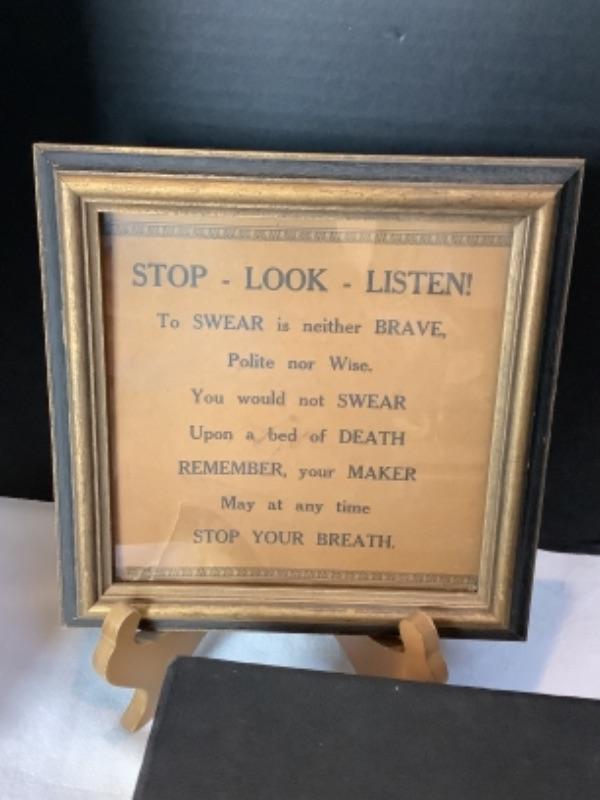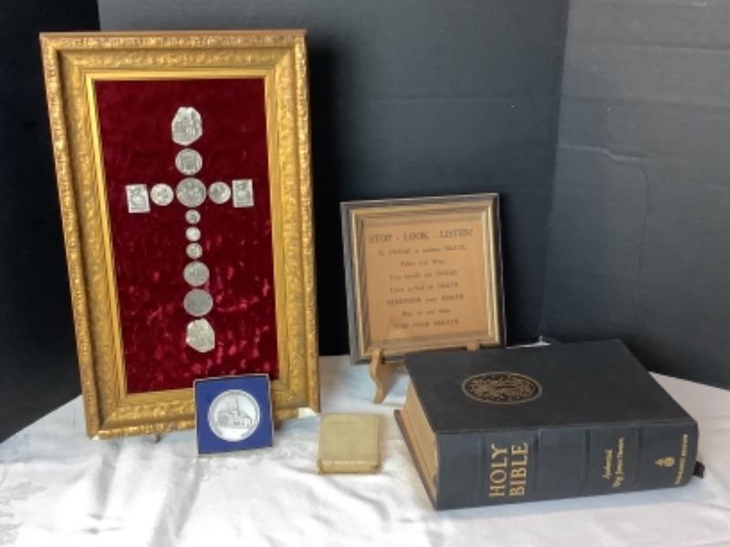 Religious medal framed cross art measures approximately 19” x 11”, has a small chip in the frame (see photos), Basilica of the national shrine of the assumption of the blessed Medal, Framed “Stop, Look< Listen” sign, large Holy Bible and pocket size Holy Bible