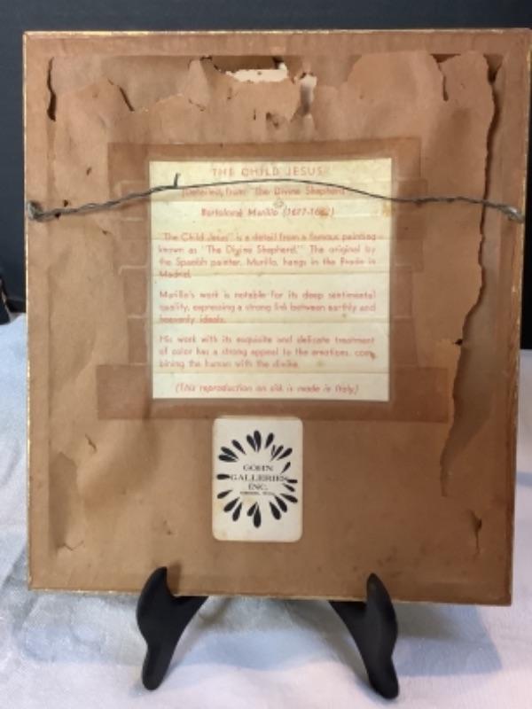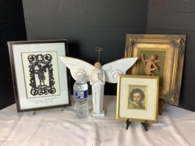 Galleries II wood carved angel 12-1/2” tall, Bartolome’ Murille framed “The Child Jesus” on silk reproduction 7-3/4” x 6-3/4”, Framed 3D cherub 12-1/2” x 10-1/2”, Barbara Buckingham 1994 Cherub Paper Cutting number 2 of 10 measures 13” x 10”