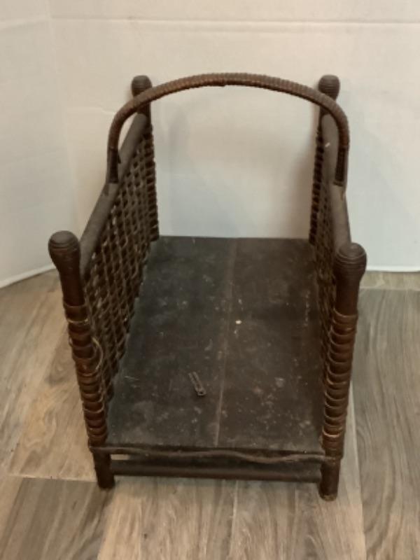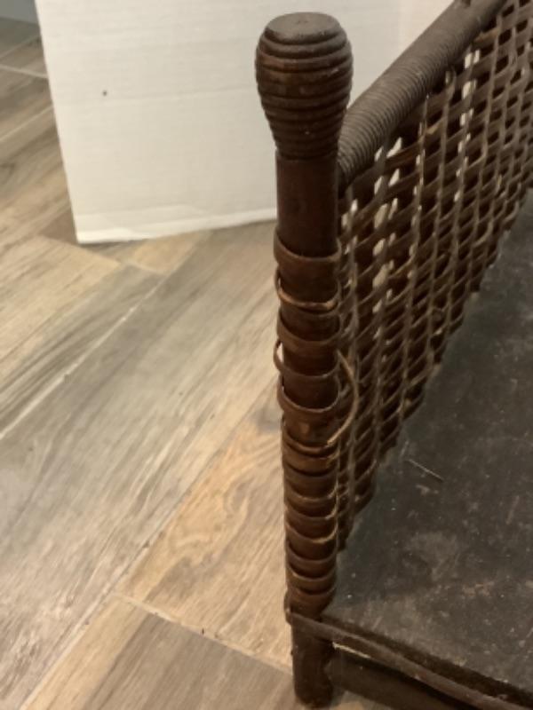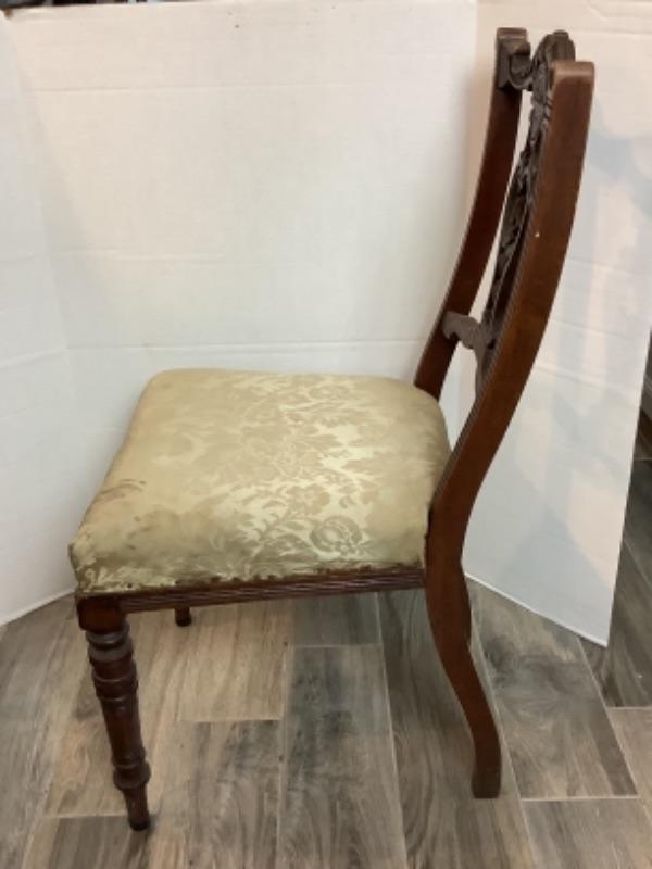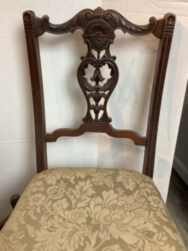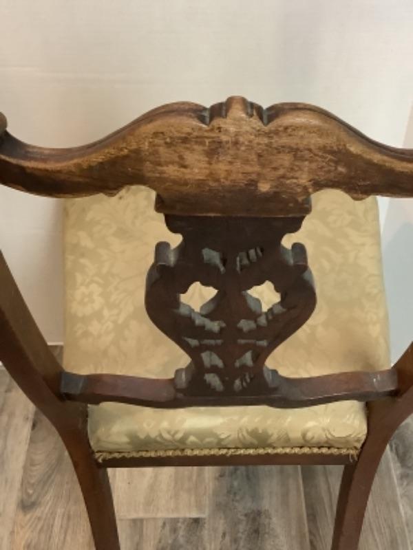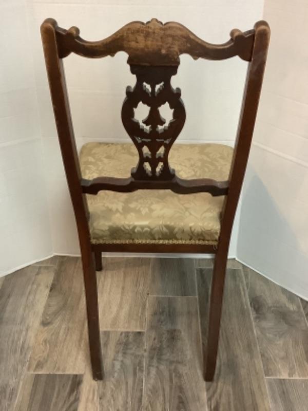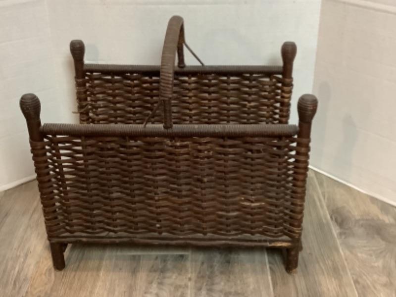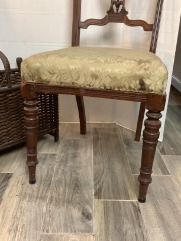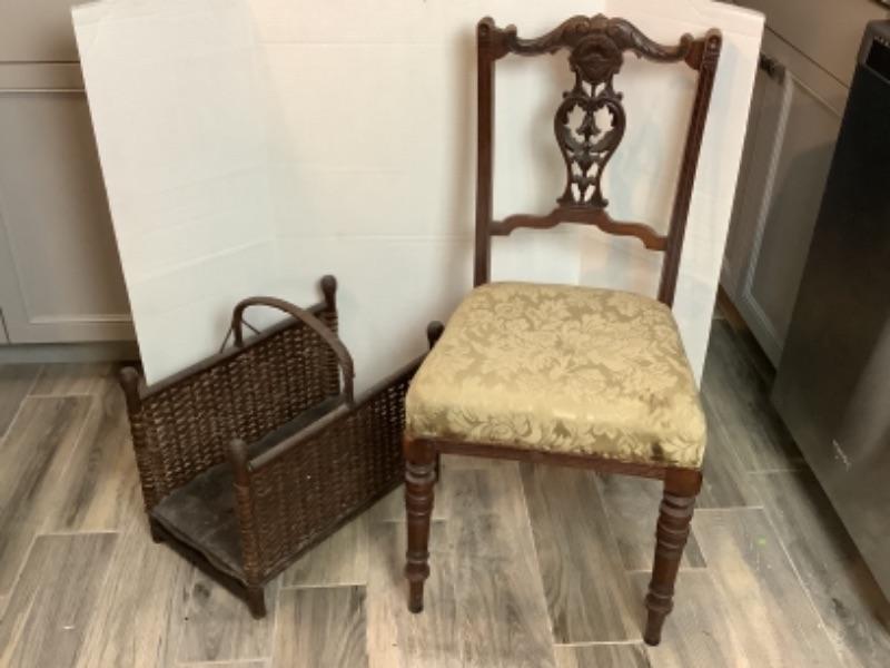 Victorian upholstered chair needs repair please see photos for any damage, Victorian magazine basket has a spot that is unraveling (see photos) measures 17” tall 12” wide and 19” long