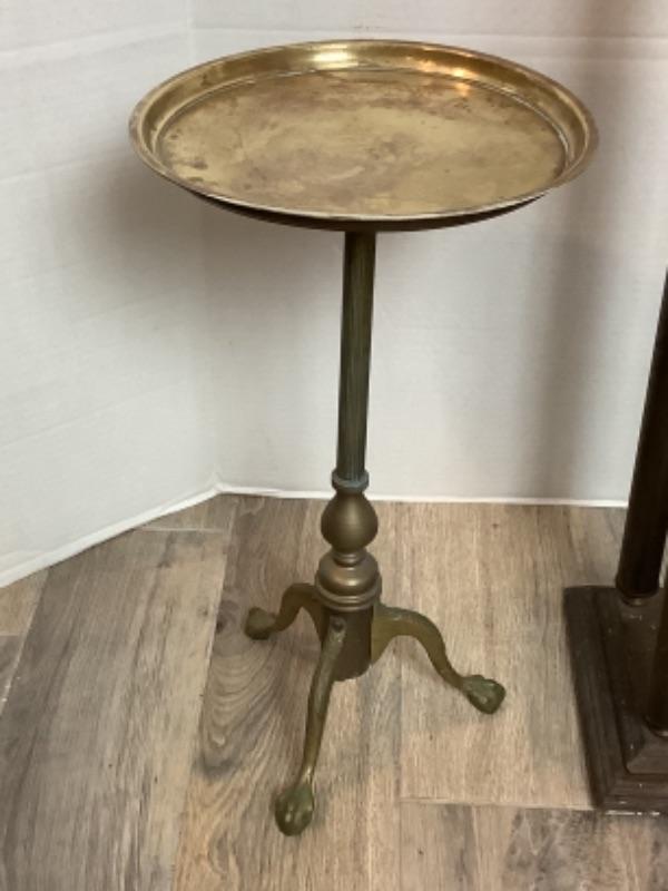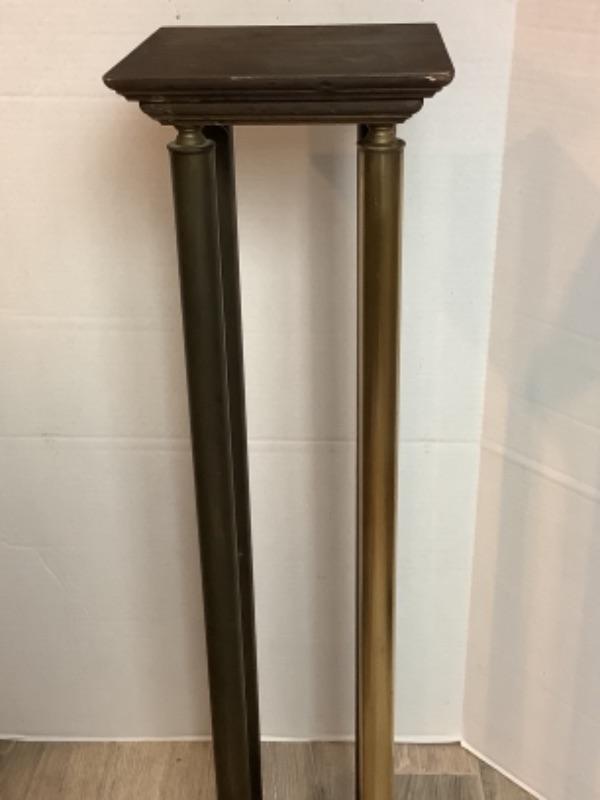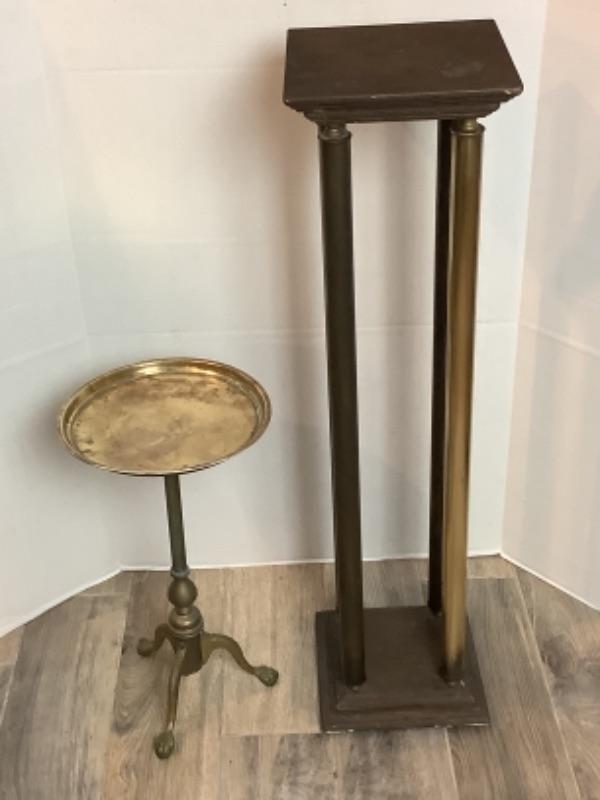 Square plant stand is made of wood and brass, brass needs polishing, as you can see in the photos it will clean up beautifully, measures 35” high and 9” x 9”, Round brass plant stand measures 19” high and 10” round