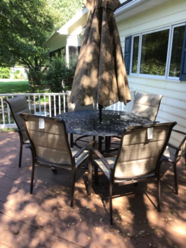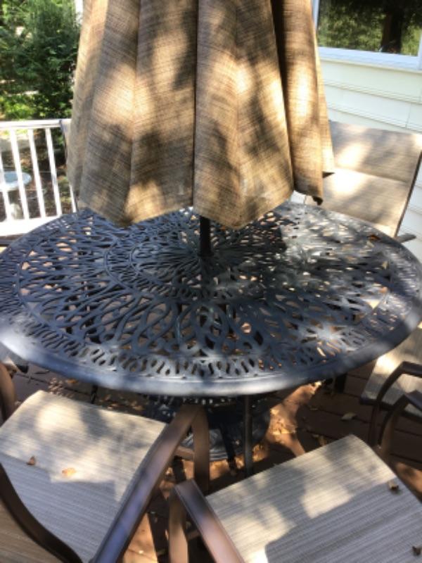Hampton Bay 8pc Cast Aluminum Patio Set with Umbrella and Like new cover (not pictured)
