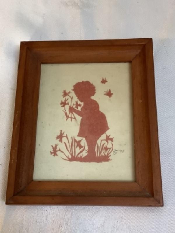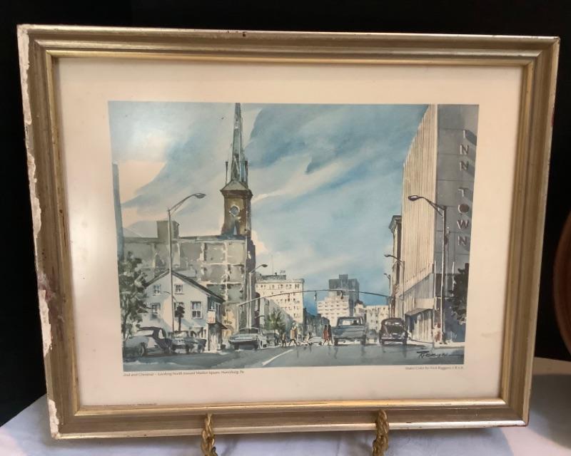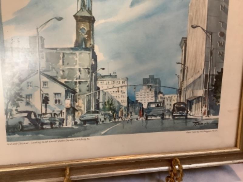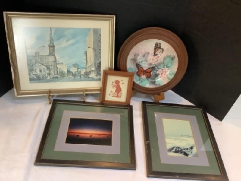 Framed Nick Ruggieri watercolor print “2nd and Chestnut”, framed Lena Liu Monarch Butterfly decorative plate, 2 framed photographs and a small framed silhouette of a girl