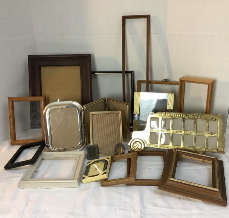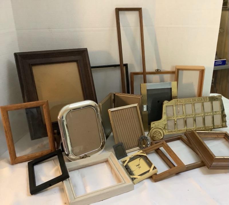 Lot of picture frames different shapes and sizes, some do not have backs or glass in them