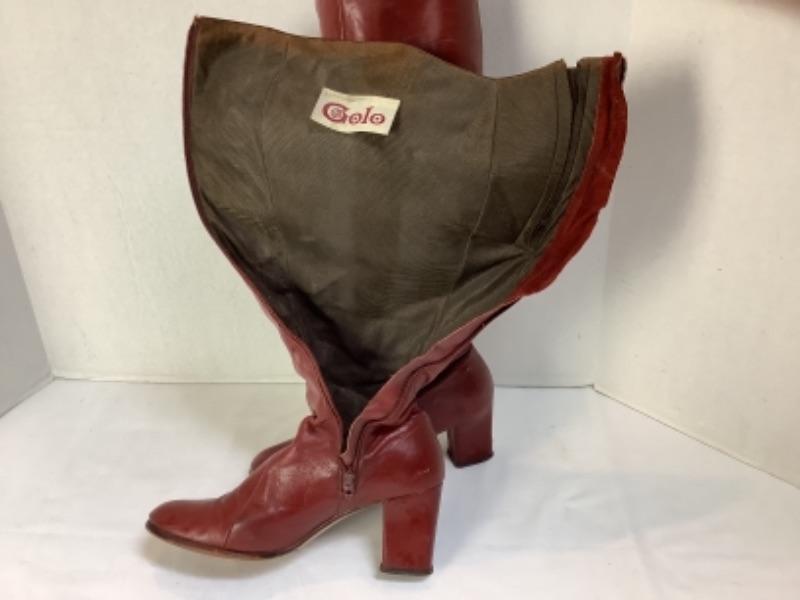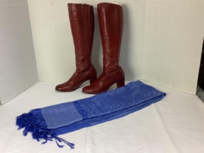 Vintage Muscalus Furs Harrisburg Pa. Ladies wWhite Mink Coat in great condition, no size indicated on coat. PAir of vintage red leather boots by Golo, no size indicated on boots. Beautiful blue Pashmina mad in Florence Italy in excellent condition