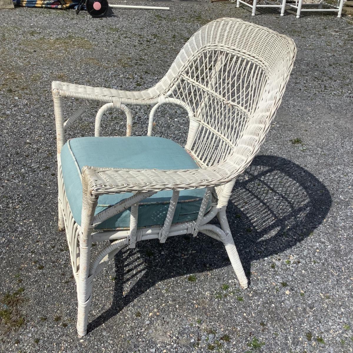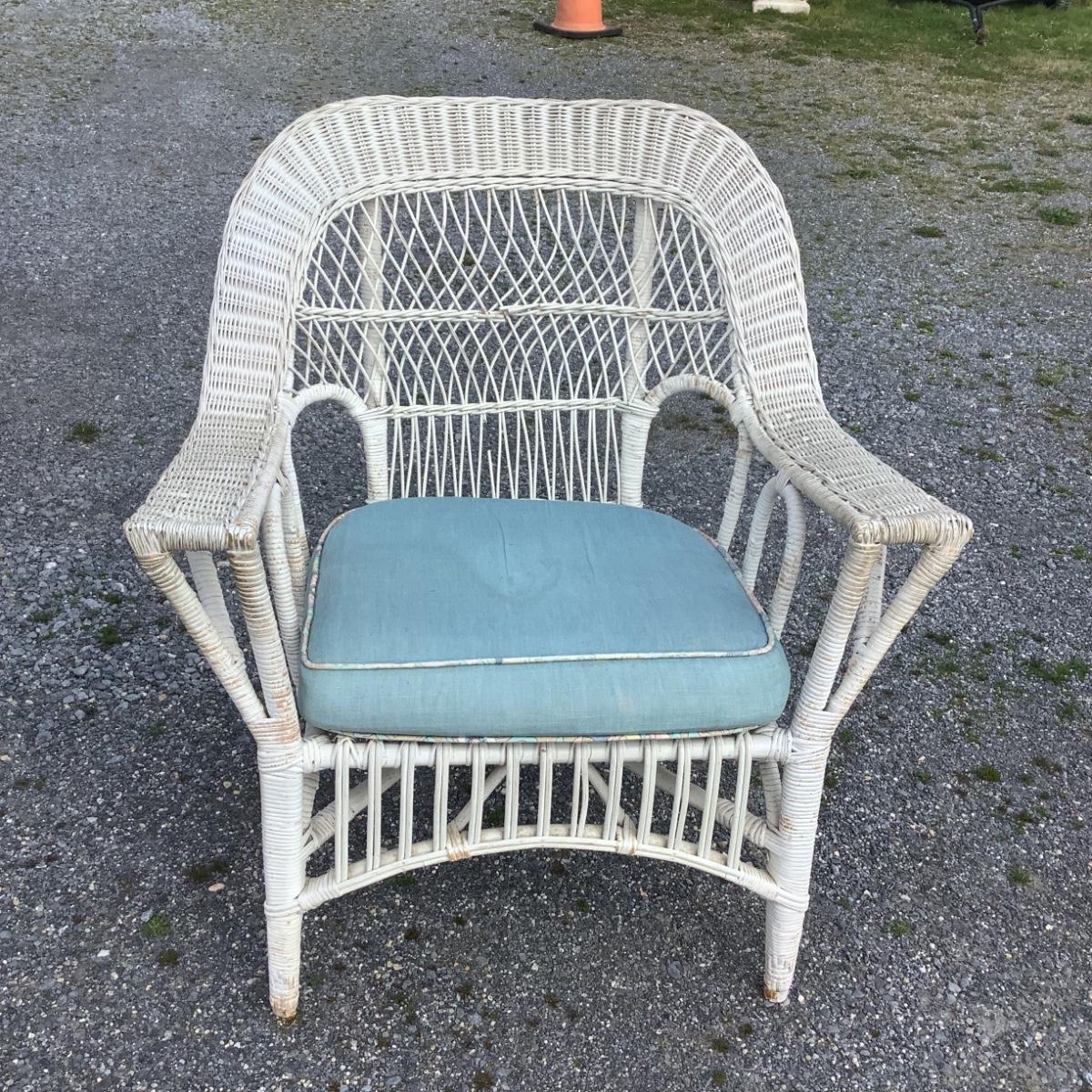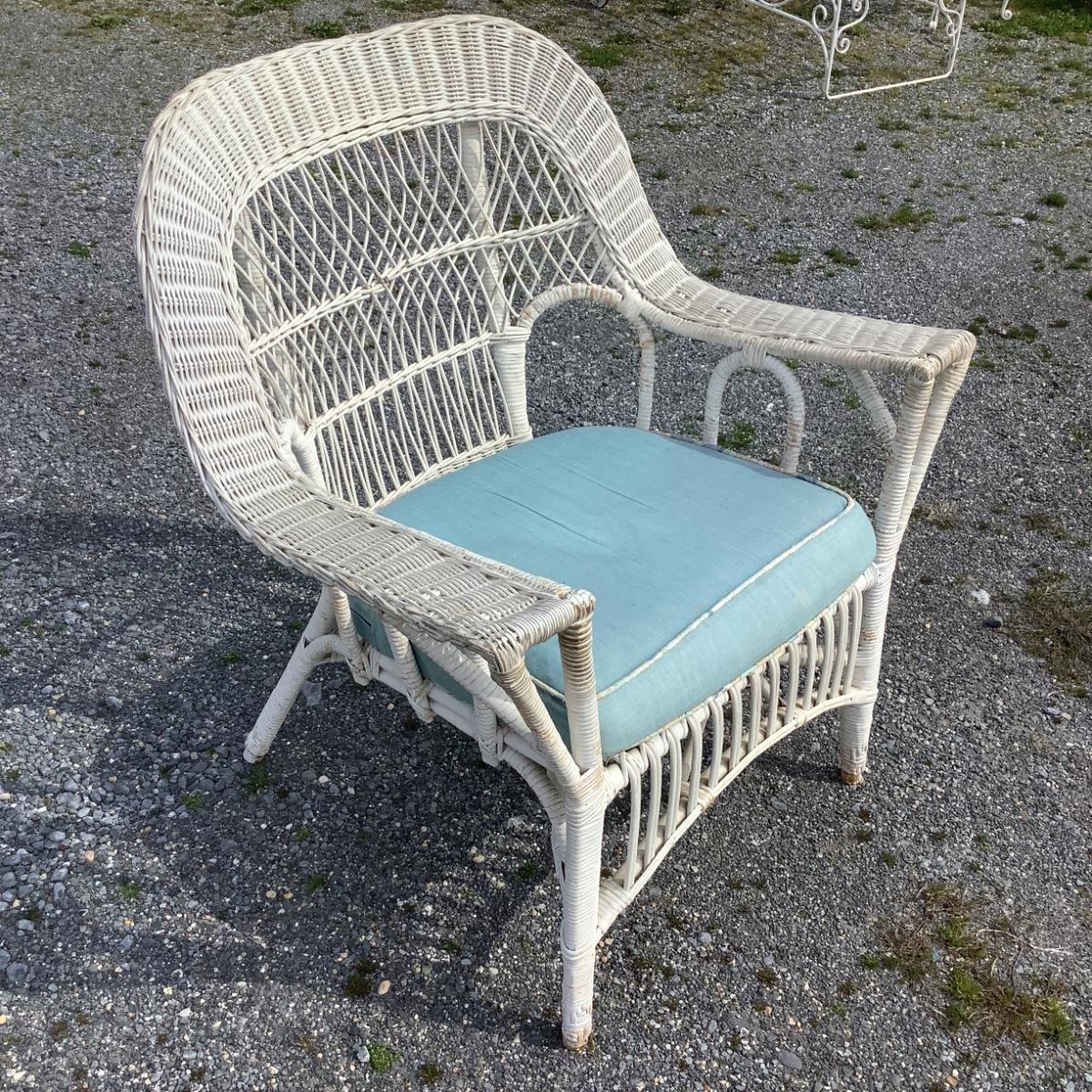 Vintage Wicker Arm Chair with Light Blue Cushion