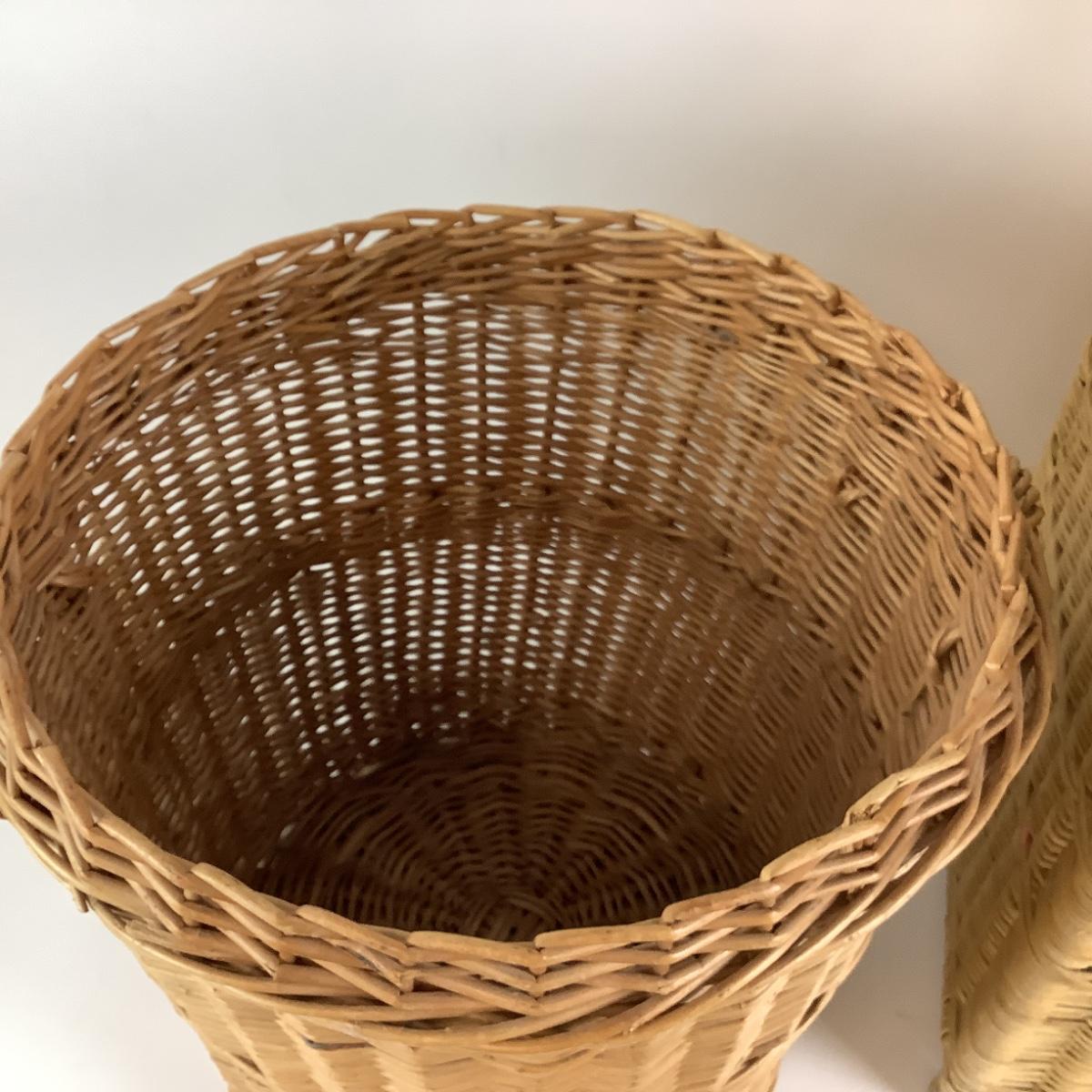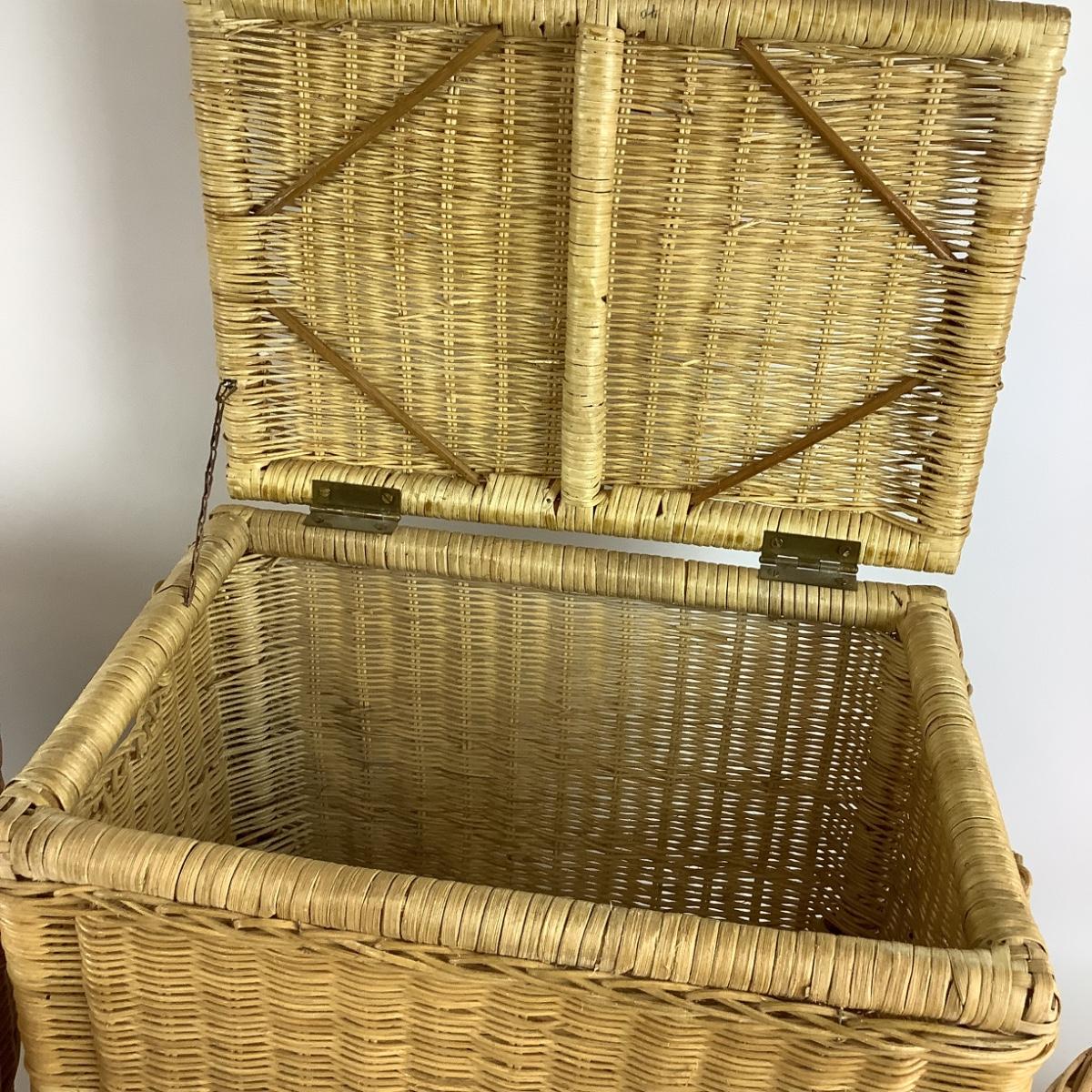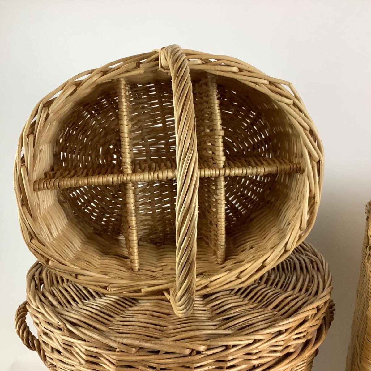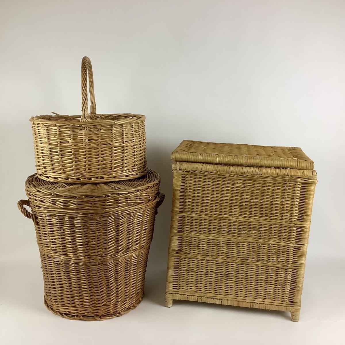 Lot of three wicker baskets. One rectangular hamper style with hinged lid measures 16"E, 11"D, 20"H, one round hamper style with removable lid measures 16" dia., 16"H, one open wine basket with handle and compartments.