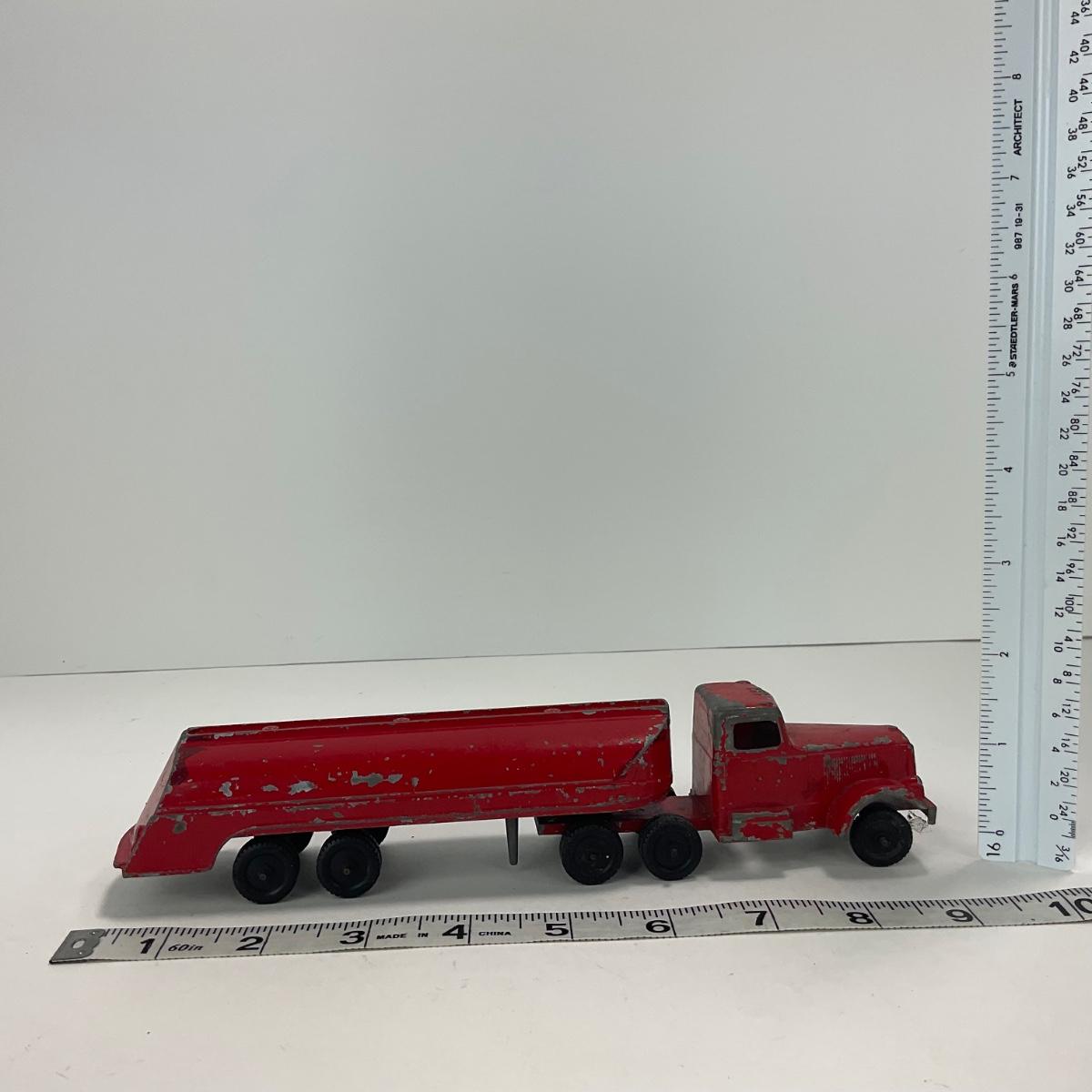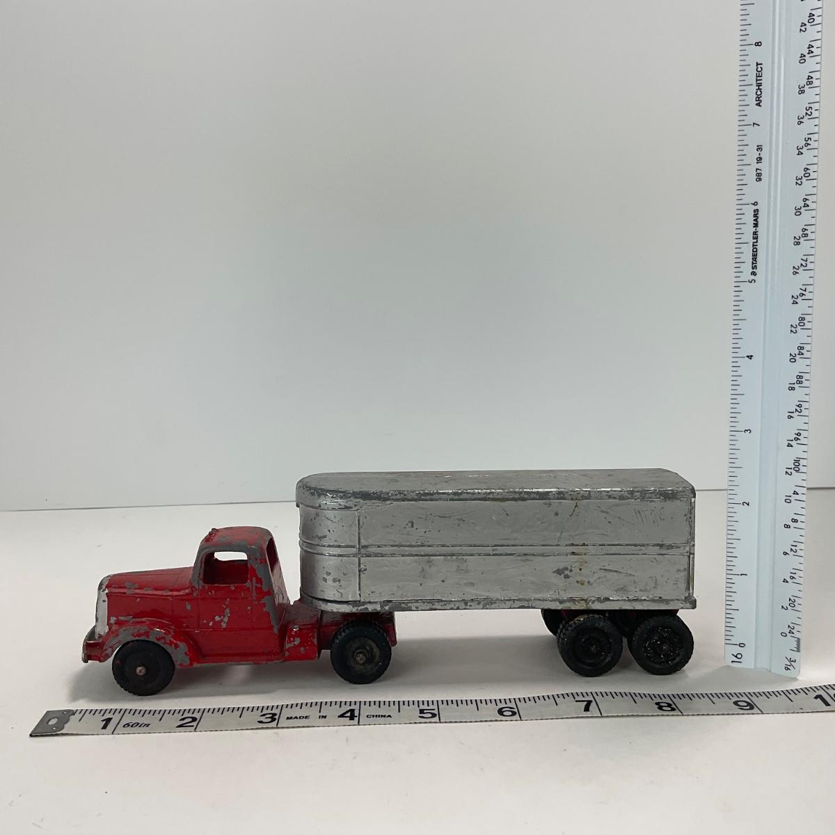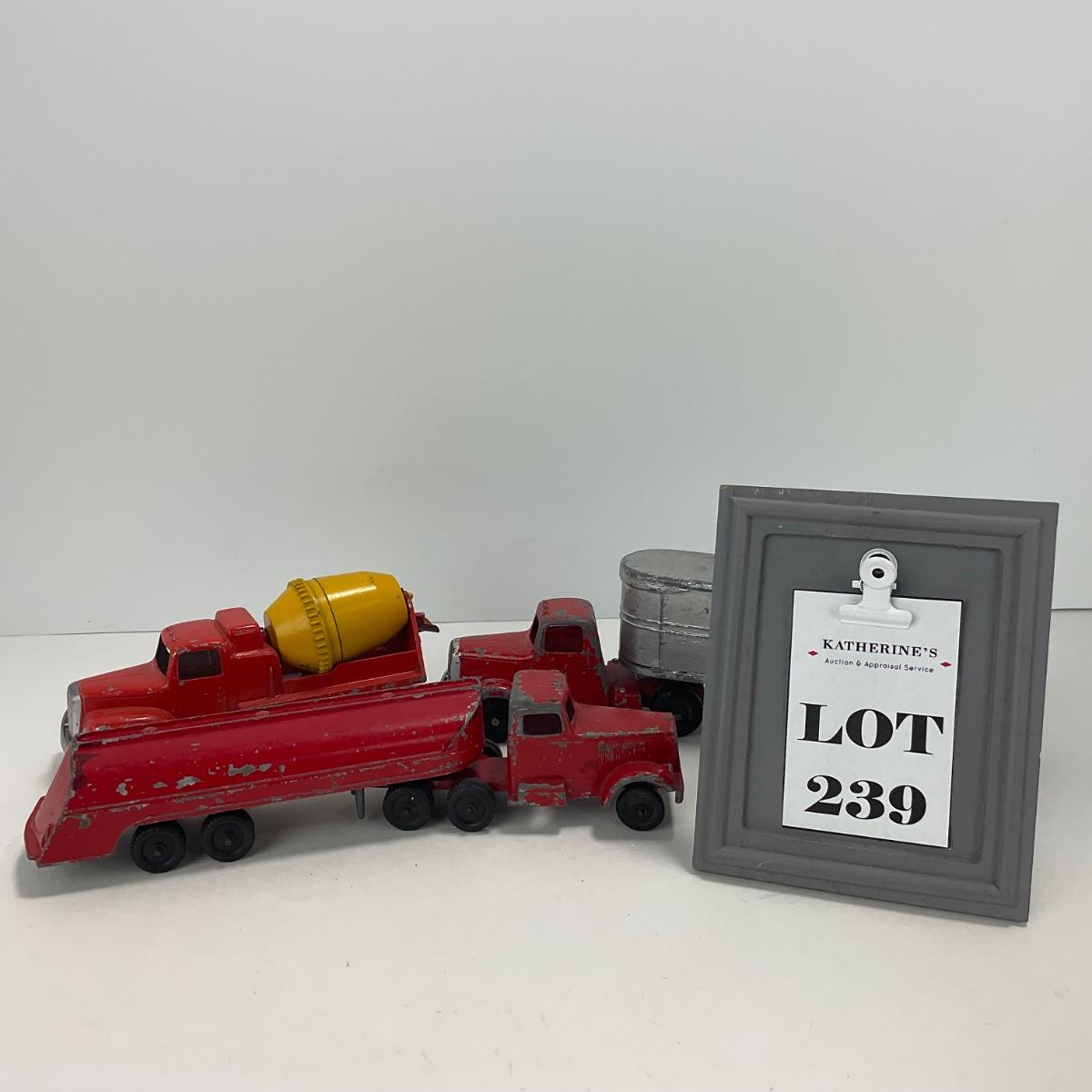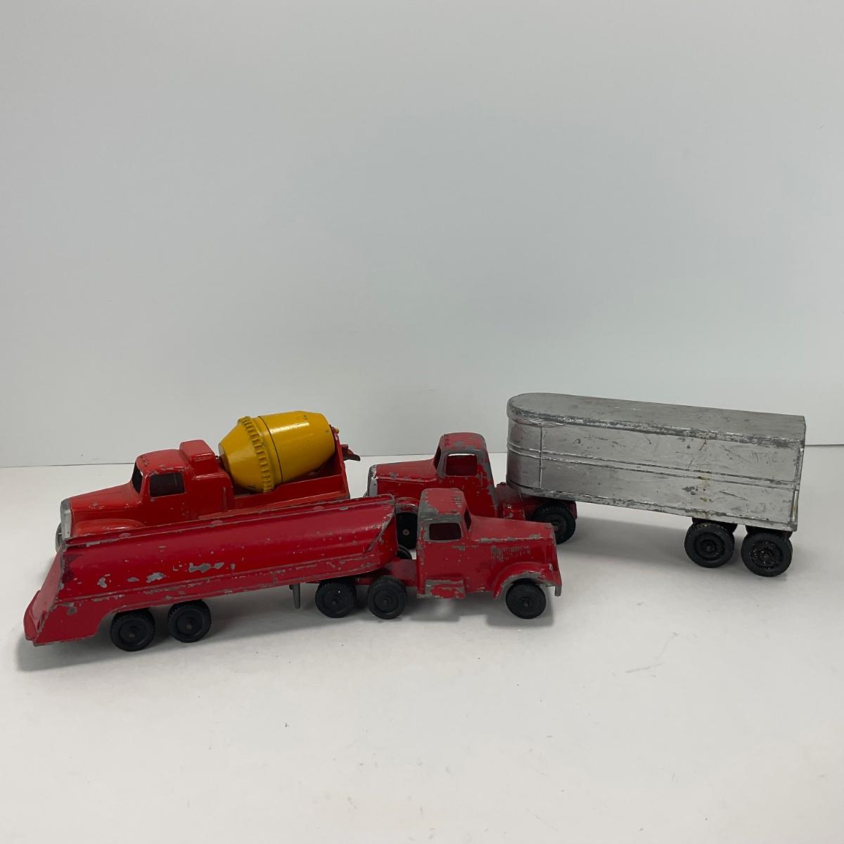 Three vintage 1950’s toy trucks. These pieces have been well loved and have some damage but would make a perfect addition to any collection. Please see photos for details and condition. ::: Shipping is available on this lot. If you require shipping you must let us know at the close of the auction. We will coordinate with you after the item has been won. Shipping fees will include insurance up to or exceeding the value of all items being mailed. If you have any questions regarding this lot please contact the auctioneer either via this website, by direct email or by phone. PICK UP TIMES and other important information can be found in the TERMS and DESCRIPTION of the auction. Please take a look for pertinent information. Thanks!