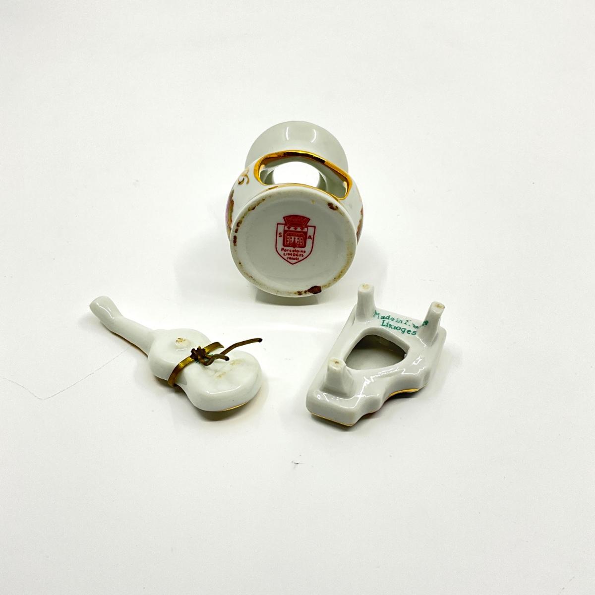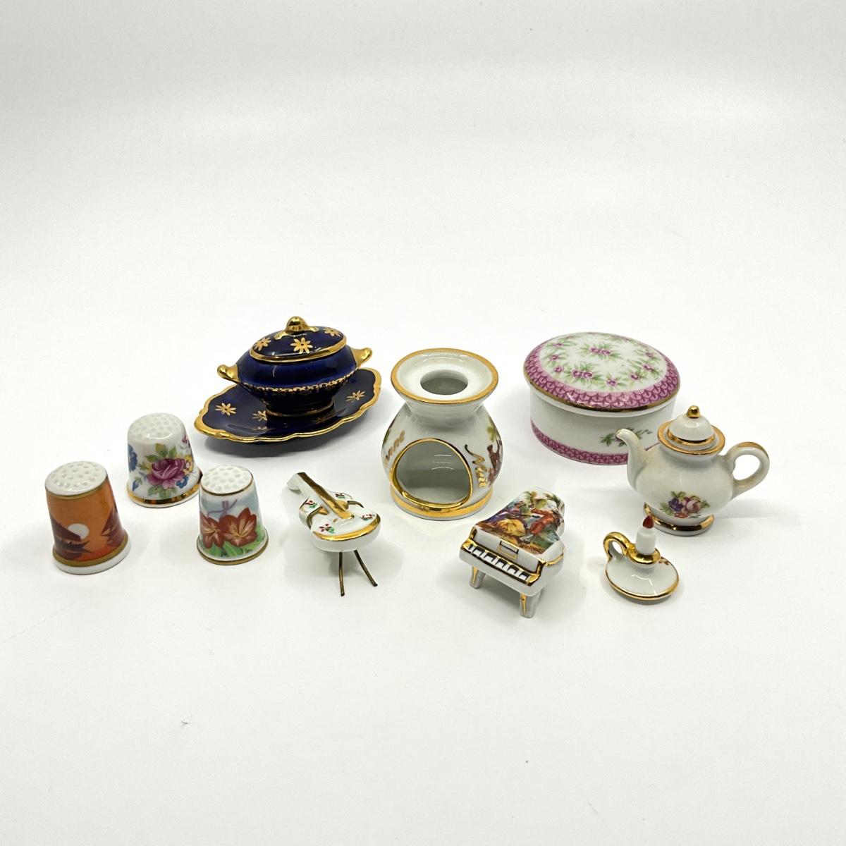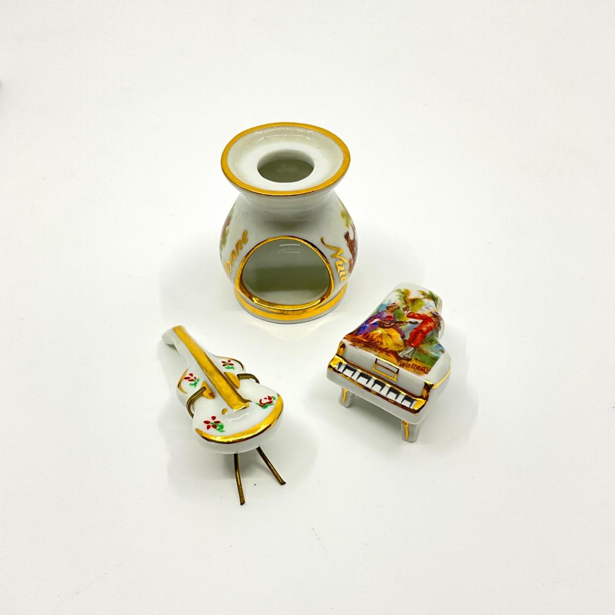 1930 mini-cello with stand, candlestick, 3 thimbles, Tart holder, Trinket Box, mini- piano