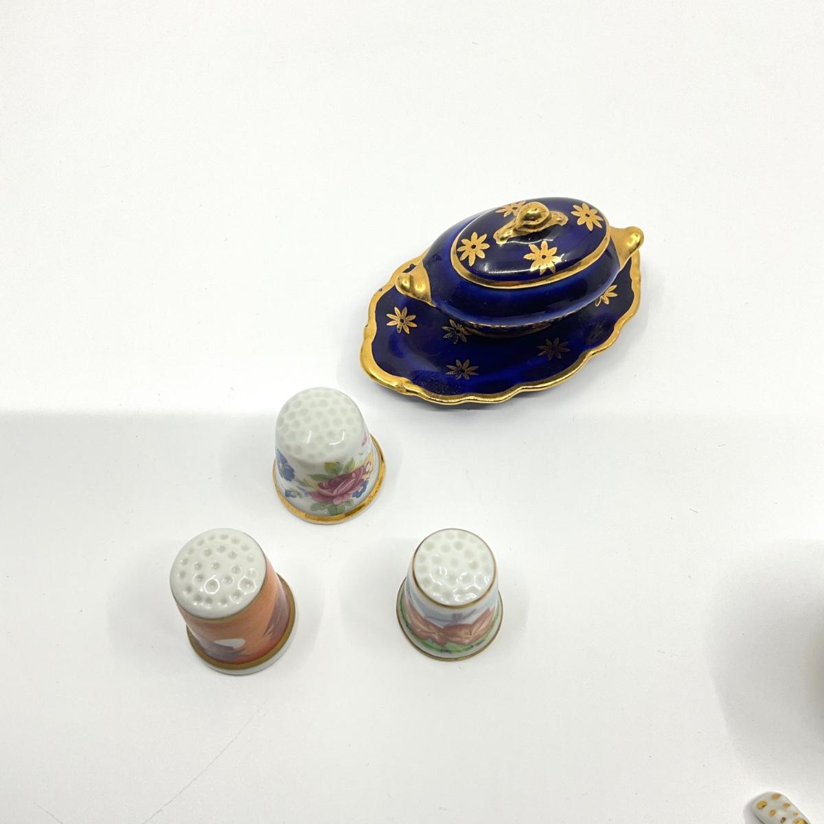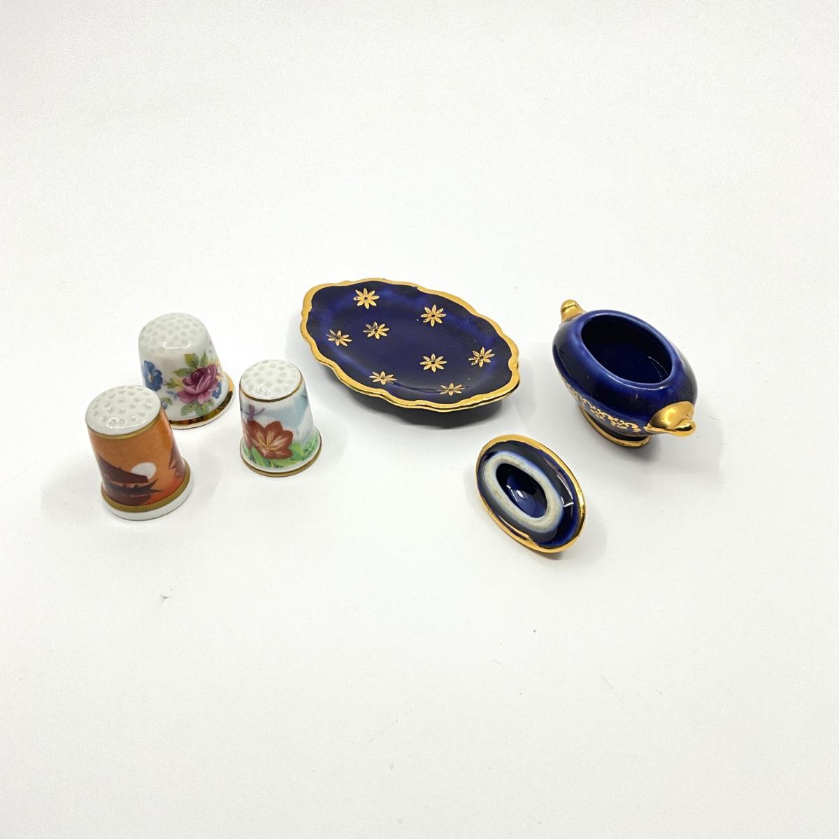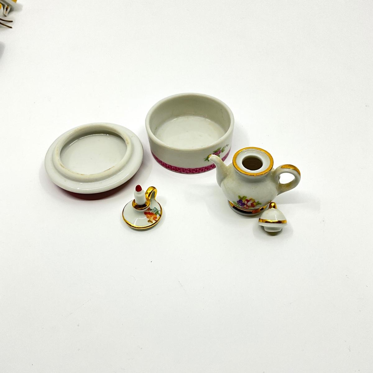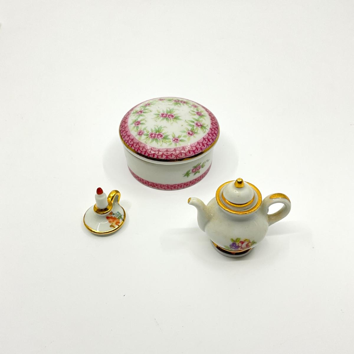 1930 mini-cello with stand, candlestick, 3 thimbles, Tart holder, Trinket Box, mini- piano
