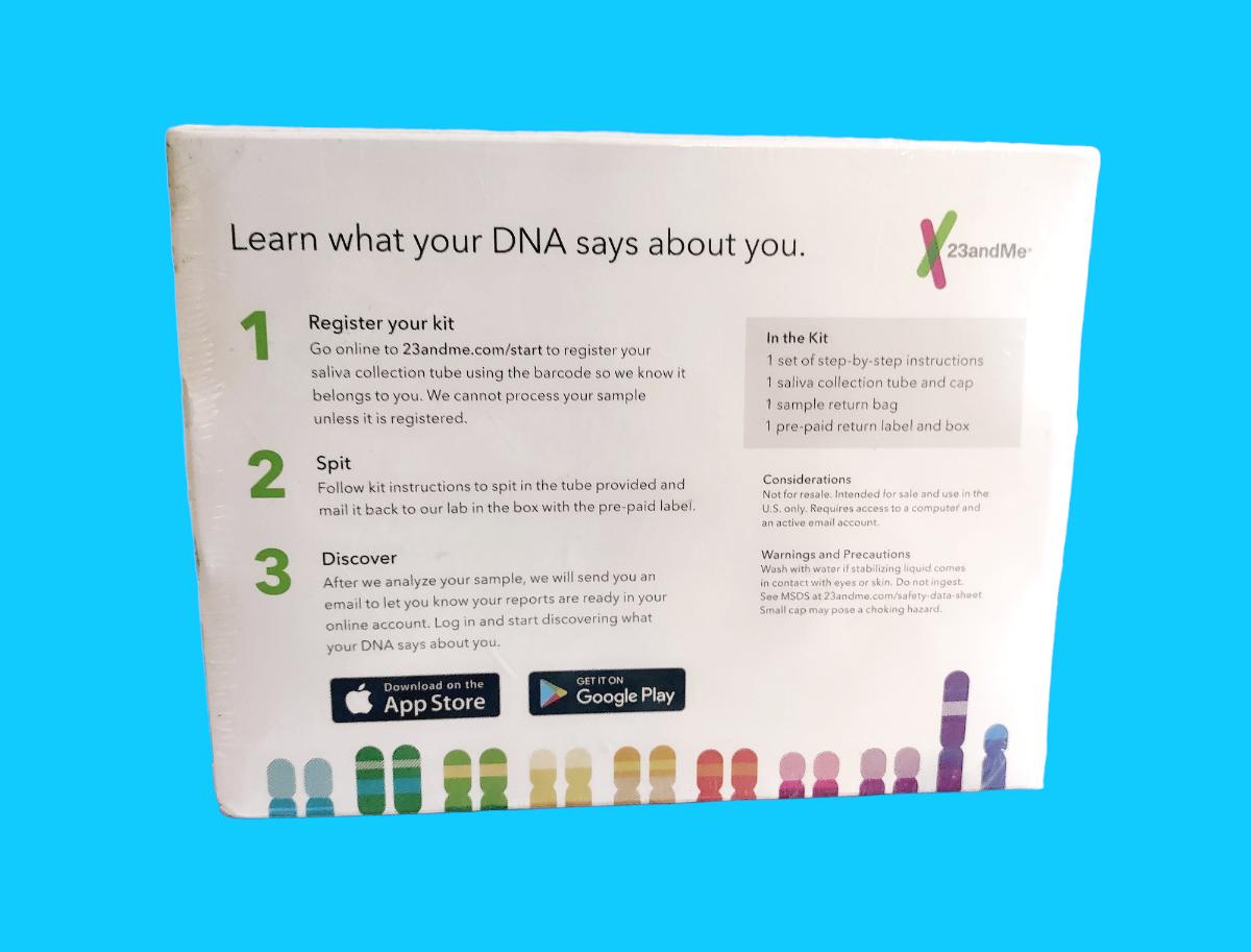 This kit has everything you need to collect your saliva DNA sample and send it off (prepaid mailing label included) to 23andMe. They will analyze your sample and give you a variety of information pertaining to your ancestry, traits and health history. The kit DOES NOT include the price of any report you wish to obtain from 23and Me; it only covers the collection and submission of your saliva for testing.