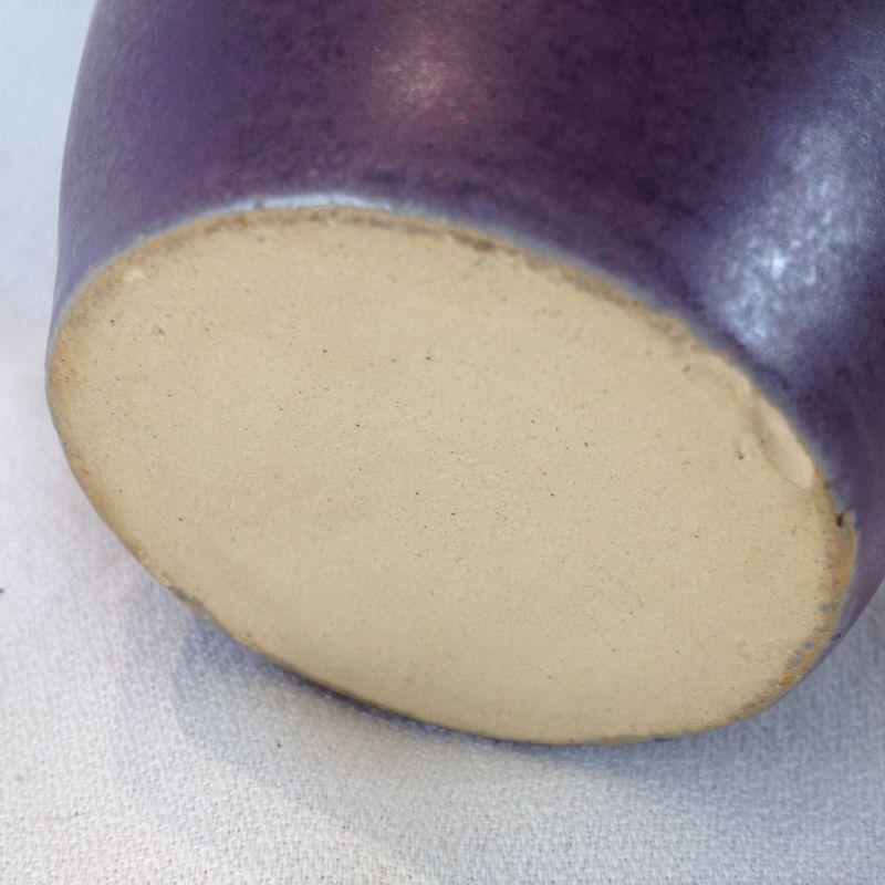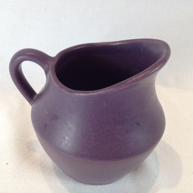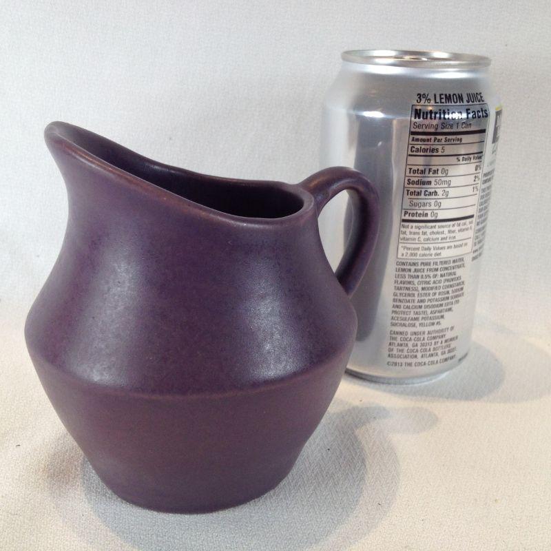 This lot is a for an Arts & Crafts Style Pitcher, it is unmarked and produced in a mat eggplant purple coloration. We feel confident that this pitcher was made as part of a line of tourist ware and distributed for souvenir sales to gift shops at locals such as Lincoln Homestead, Cumberland Falls and Mammoth Cave, by the Louisville Pottery Company which operated until around 1955 This piece measures about 3.5-inches in diameter, plus the handle X 4-inches high.