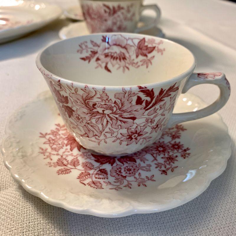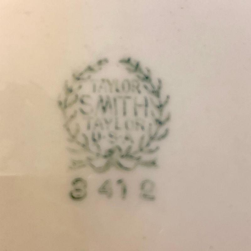 Taylor Smith Taylor dinnerware in a red & white. Made in USA Center red bouquet, garland edge.