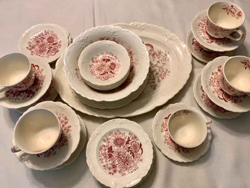#23 ANTIQUE PARTIAL SET RED & WHITE CENTER BOUQUET ETRUSCAN DINNERWARE