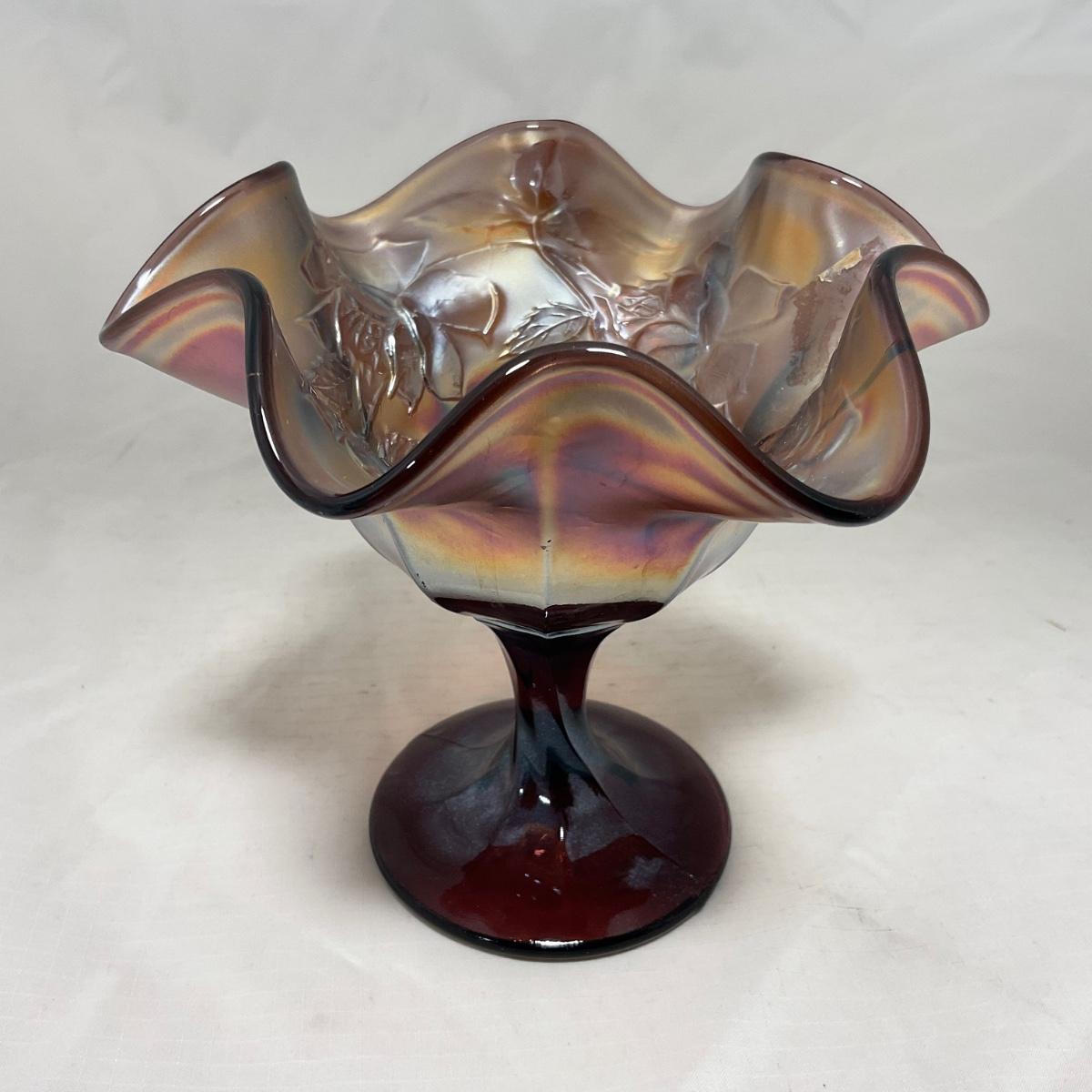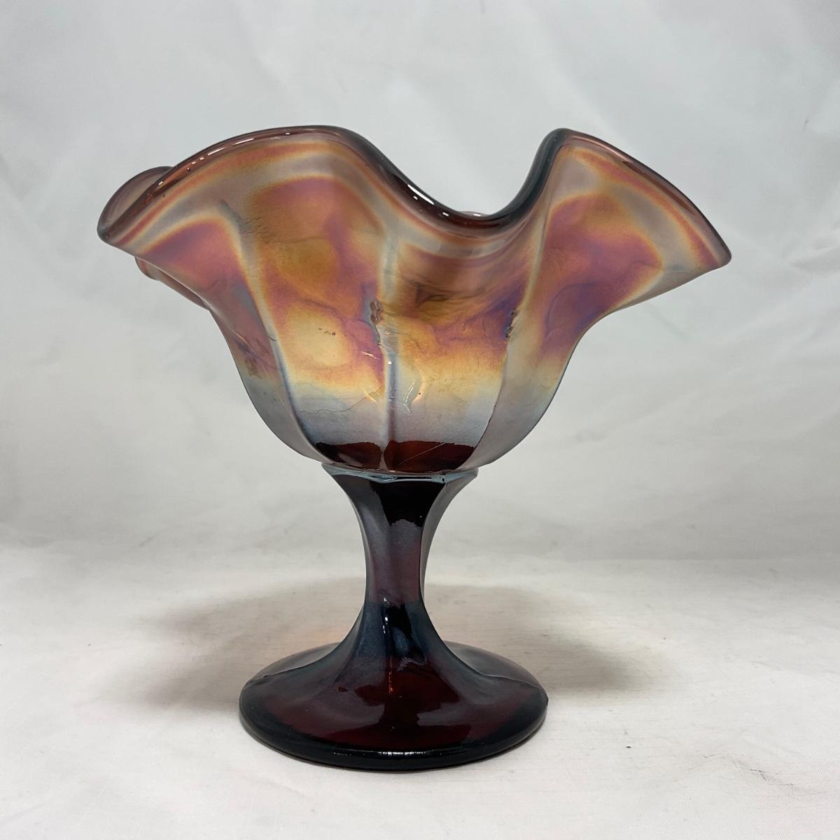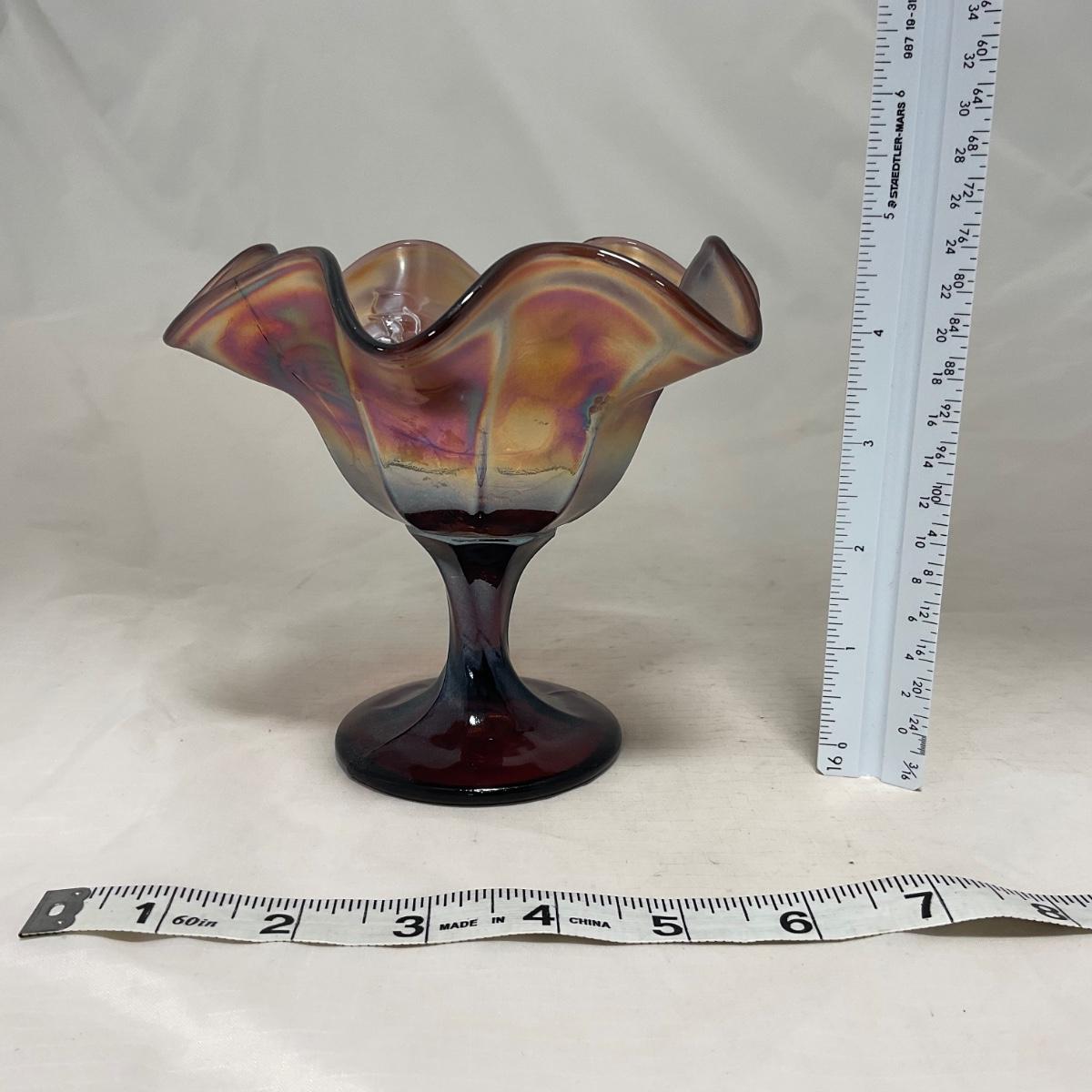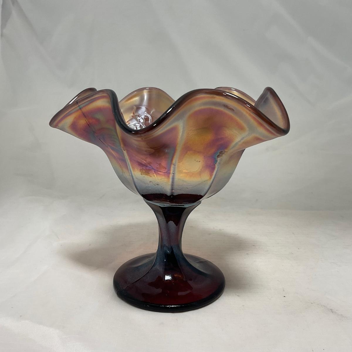 One dark colored with almost a purple, amber, orange iridescent shade carnival compote. In amazing shape and condition. Please see photos for details and condition. ::: Shipping is available on this lot. If you require shipping you must let us know at the close of the auction. We will coordinate with you after the item has been won. Shipping fees will include insurance up to or exceeding the value of all items being mailed. If you have any questions regarding this lot please contact the auctioneer either via this website, by direct email or by phone. PICK UP TIMES and other important information can be found in the TERMS and DESCRIPTION of the auction. Please take a look for pertinent information. Thanks!
