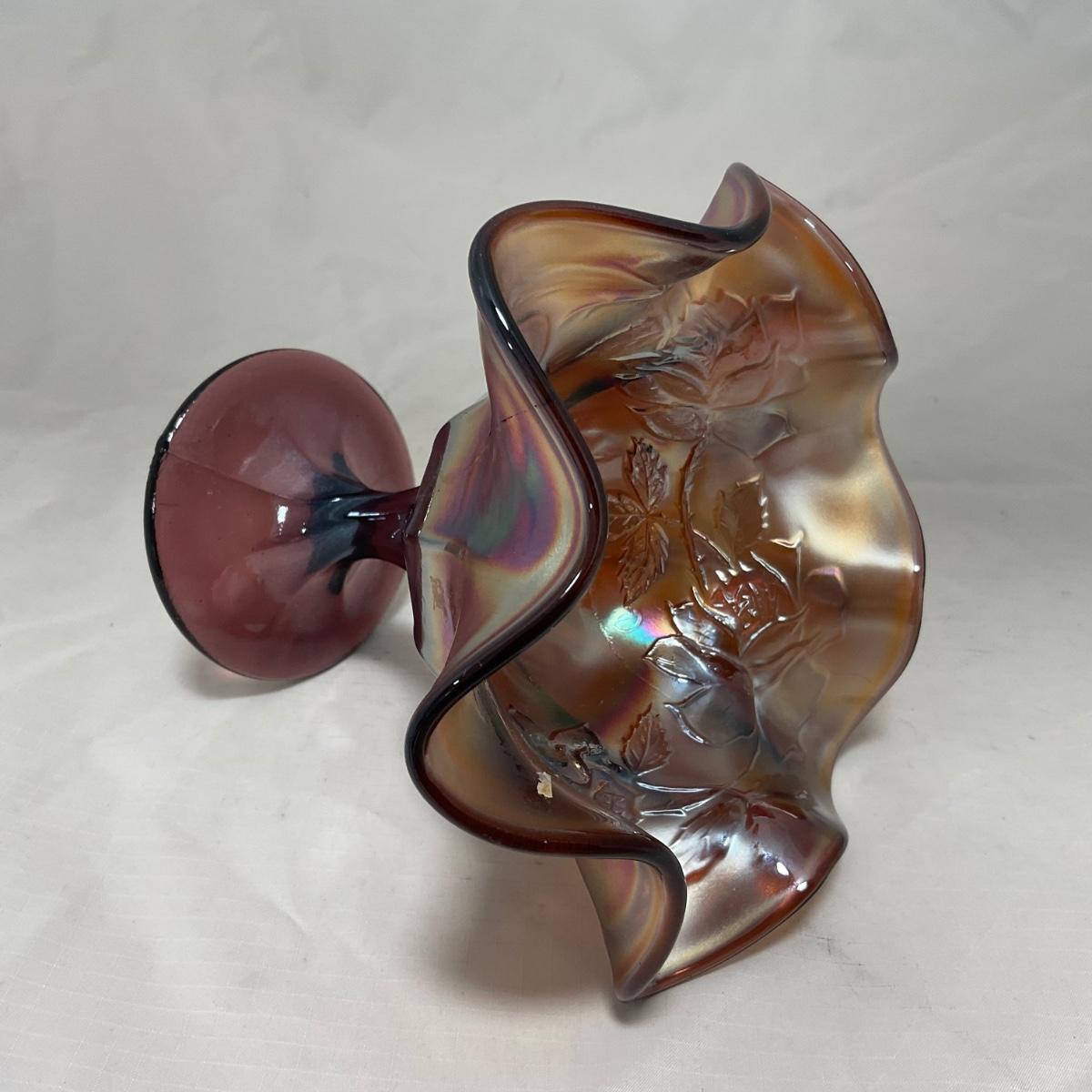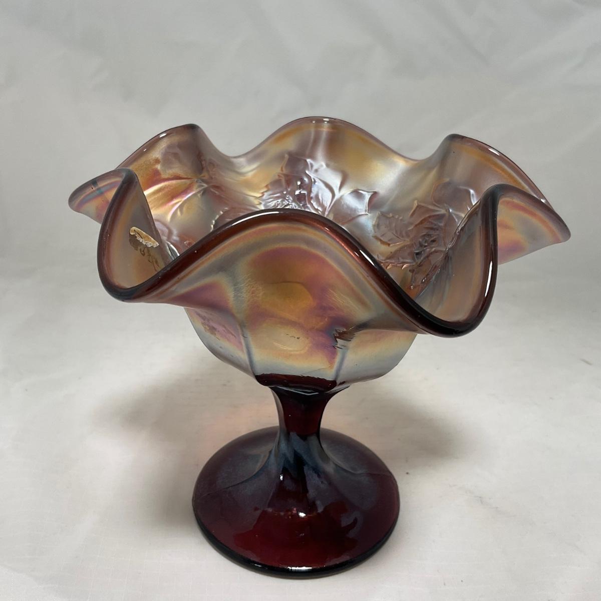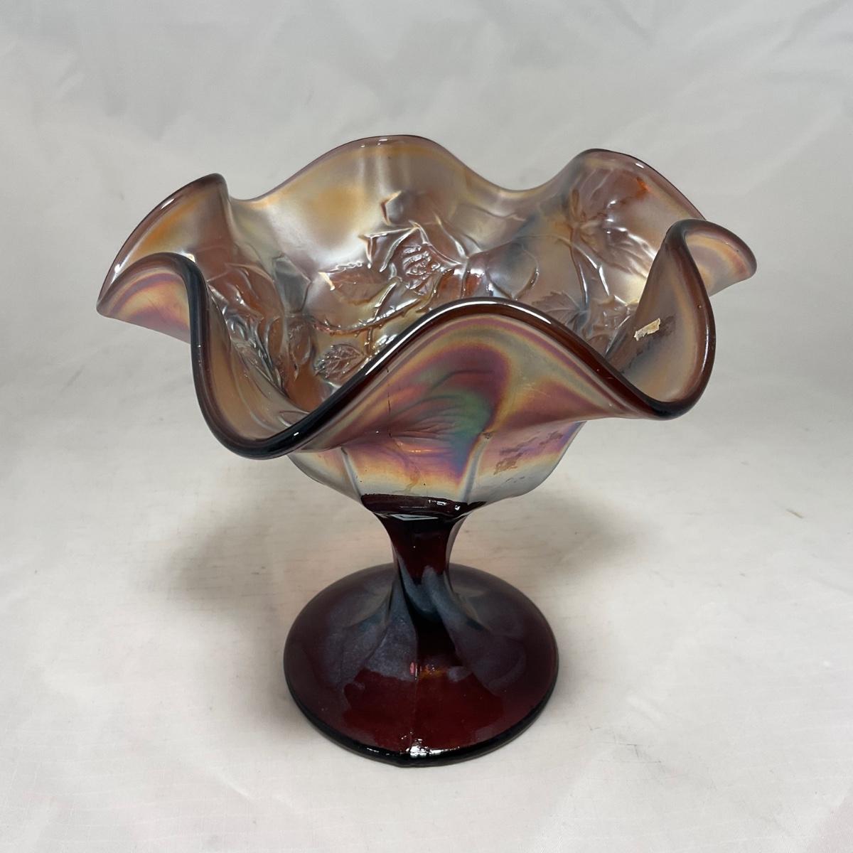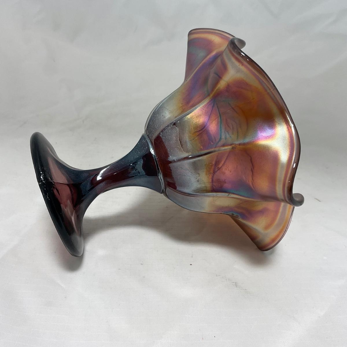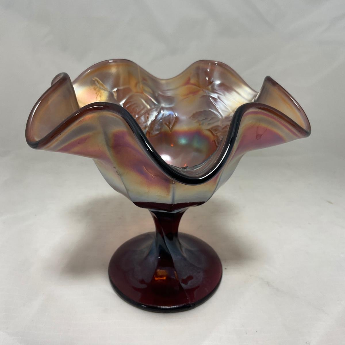 One dark colored with almost a purple, amber, orange iridescent shade carnival compote. In amazing shape and condition. Please see photos for details and condition. ::: Shipping is available on this lot. If you require shipping you must let us know at the close of the auction. We will coordinate with you after the item has been won. Shipping fees will include insurance up to or exceeding the value of all items being mailed. If you have any questions regarding this lot please contact the auctioneer either via this website, by direct email or by phone. PICK UP TIMES and other important information can be found in the TERMS and DESCRIPTION of the auction. Please take a look for pertinent information. Thanks!
