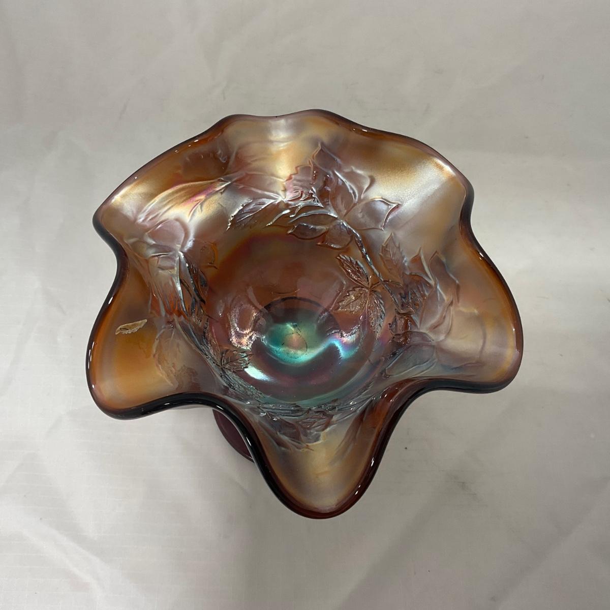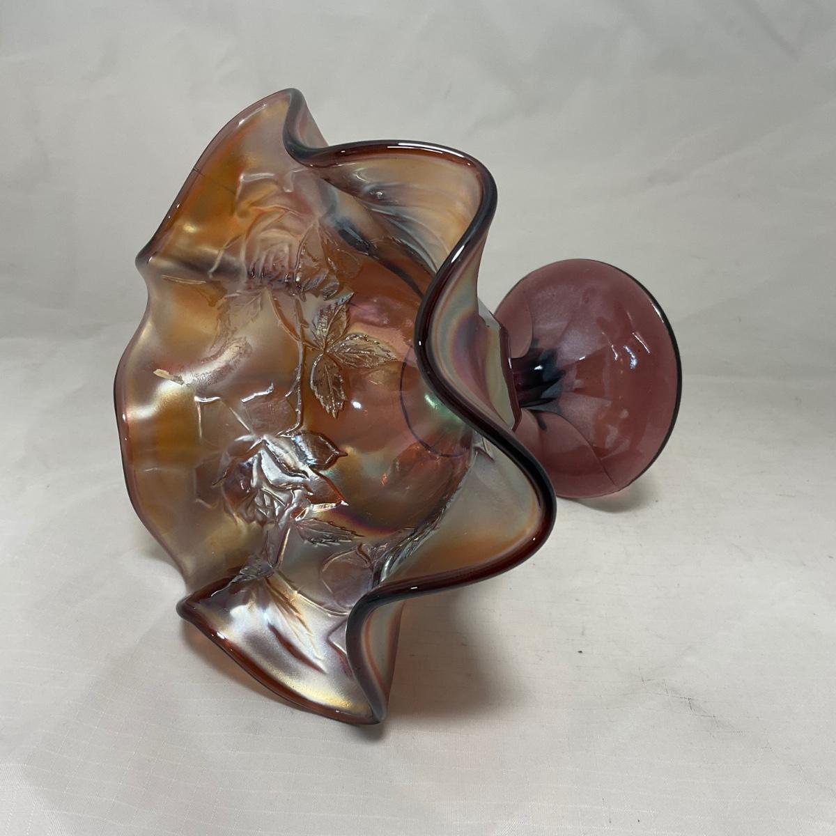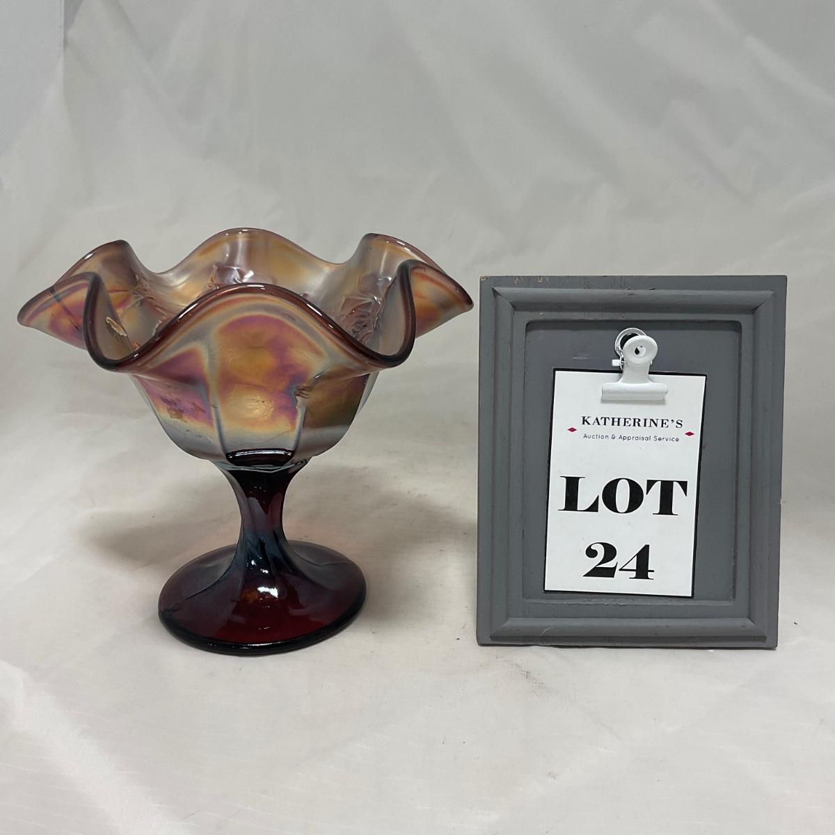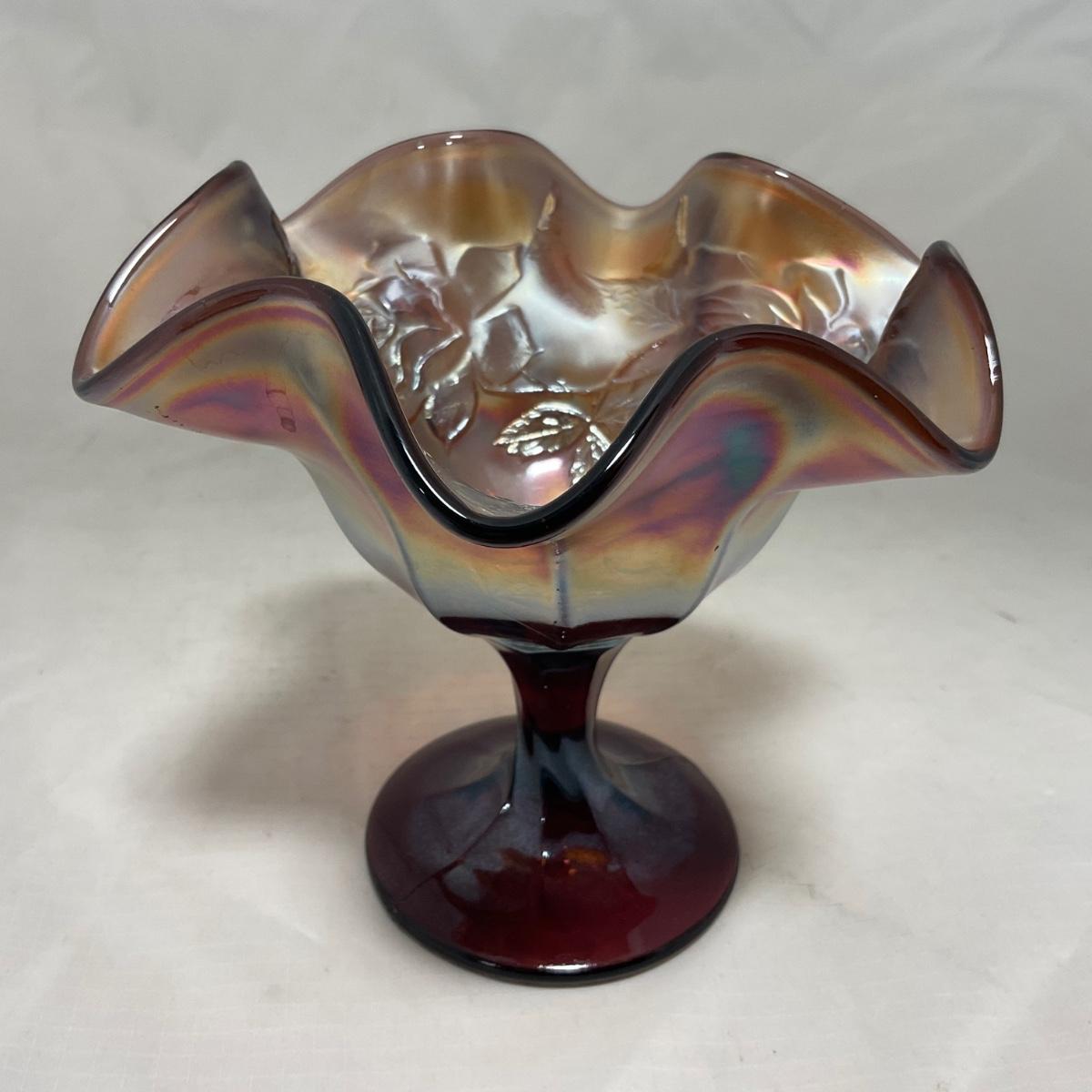 One dark colored with almost a purple, amber, orange iridescent shade carnival compote. In amazing shape and condition. Please see photos for details and condition. ::: Shipping is available on this lot. If you require shipping you must let us know at the close of the auction. We will coordinate with you after the item has been won. Shipping fees will include insurance up to or exceeding the value of all items being mailed. If you have any questions regarding this lot please contact the auctioneer either via this website, by direct email or by phone. PICK UP TIMES and other important information can be found in the TERMS and DESCRIPTION of the auction. Please take a look for pertinent information. Thanks!