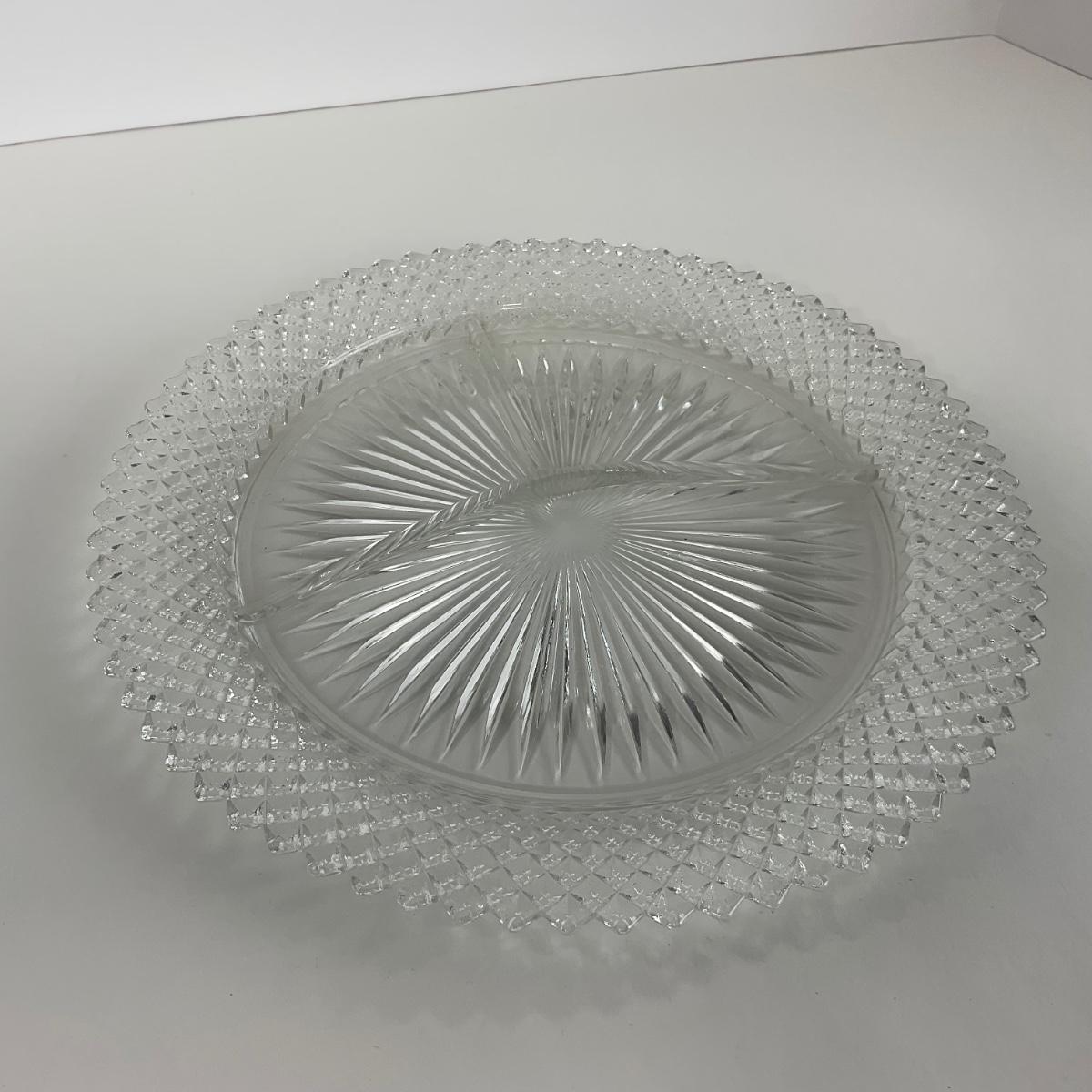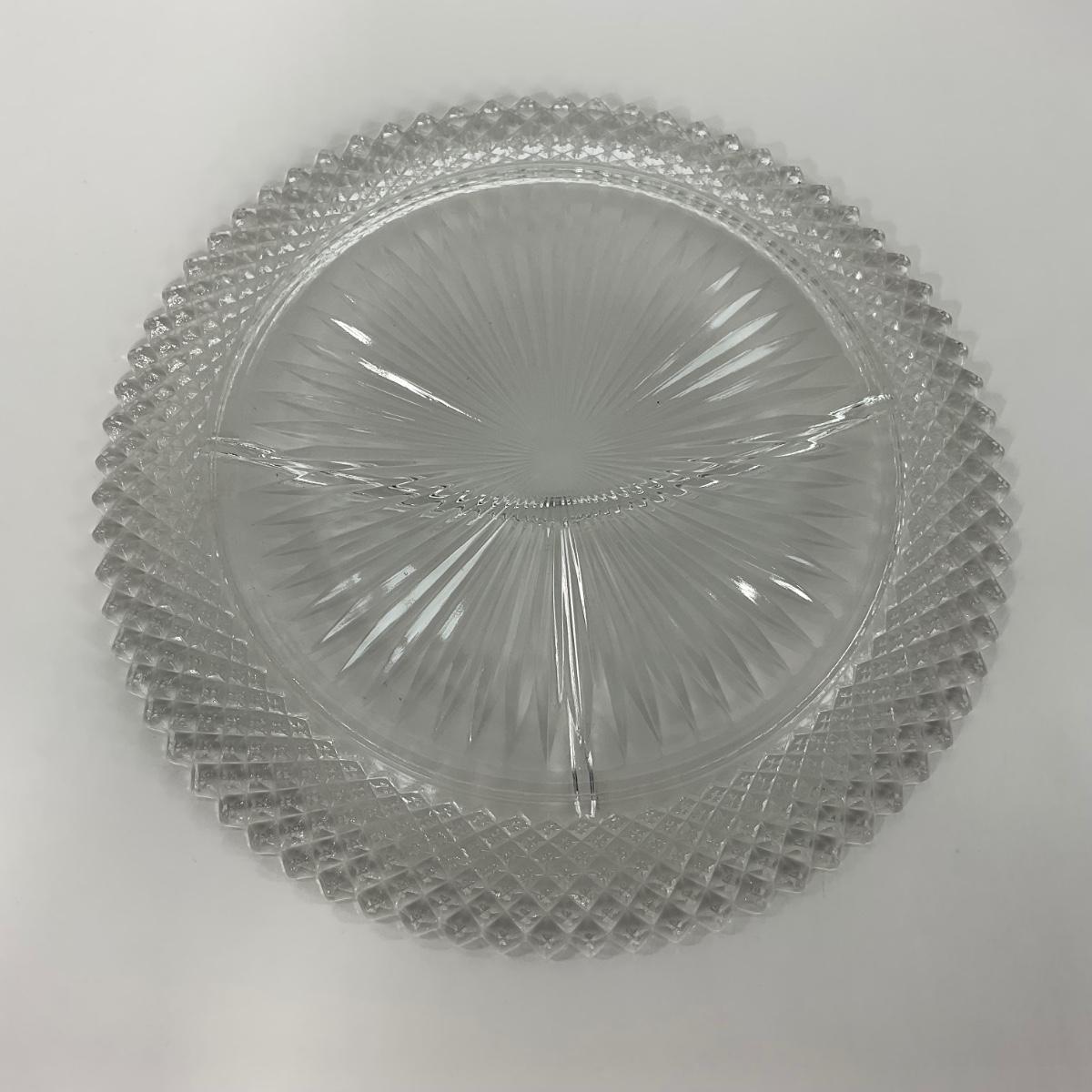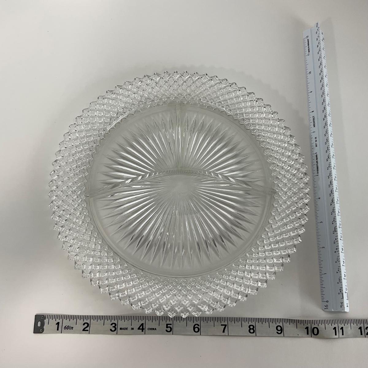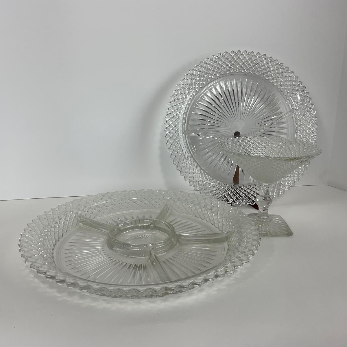 Three Miss America Hocking Glass Co. (1933-1937) pieces including one divided tray, one plate, and one compote. Please see photos for details and condition. ::: Shipping is available on this lot. If you require shipping you must let us know at the close of the auction. We will coordinate with you after the item has been won. Shipping fees will include insurance up to or exceeding the value of all items being mailed. If you have any questions regarding this lot please contact the auctioneer either via this website, by direct email or by phone. PICK UP TIMES and other important information can be found in the TERMS and DESCRIPTION of the auction. Please take a look for pertinent information. Thanks!