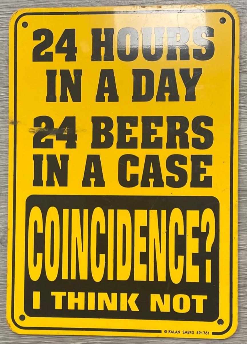 Description: 24 Hours/Beers a Day Coincidence? Sign. Measures approximately: 10 X 7 Inches. Material : Metal.