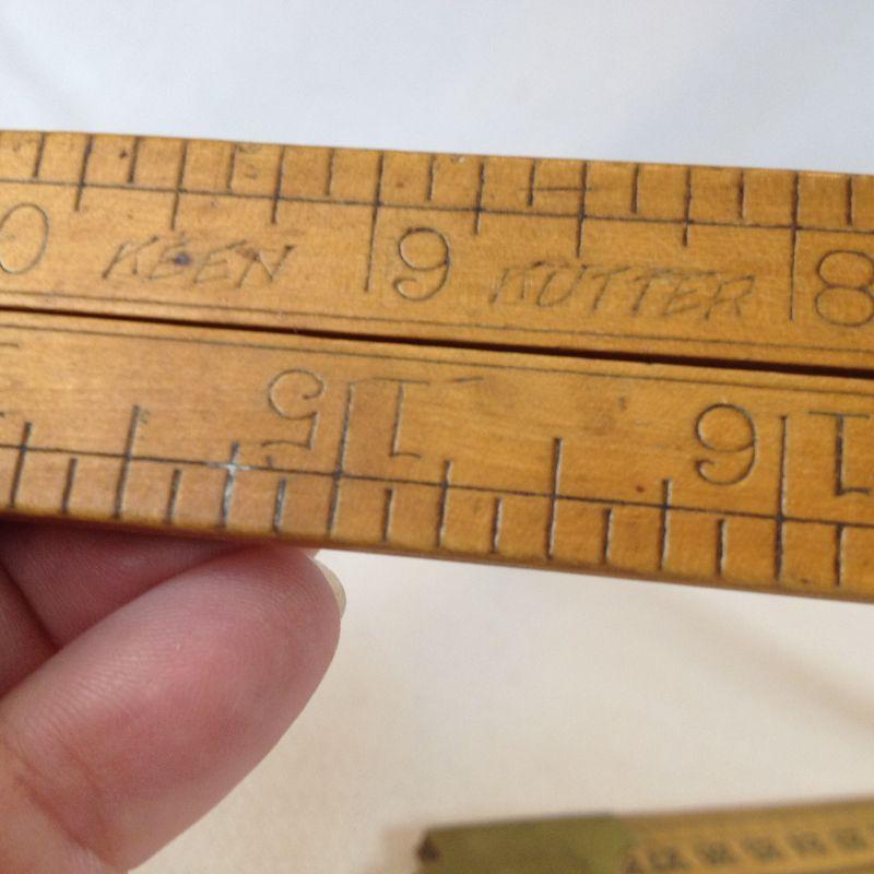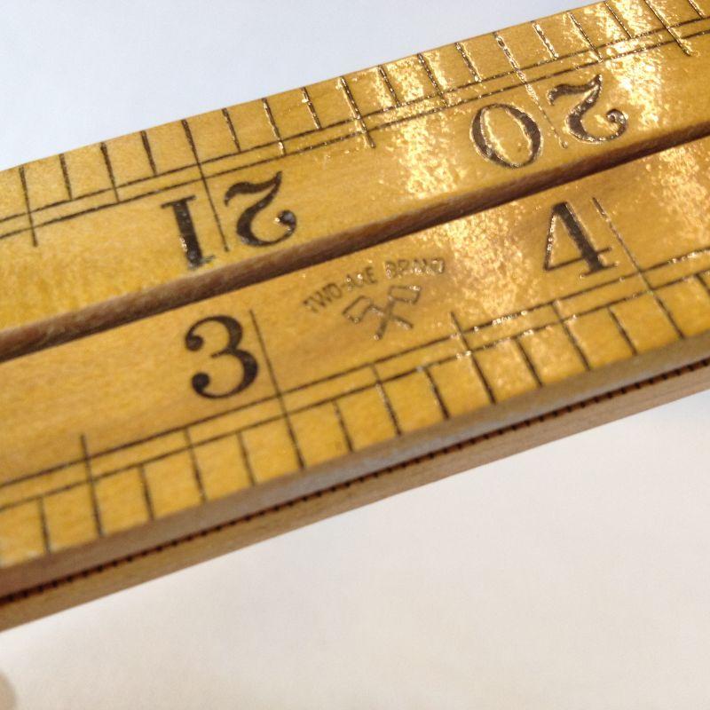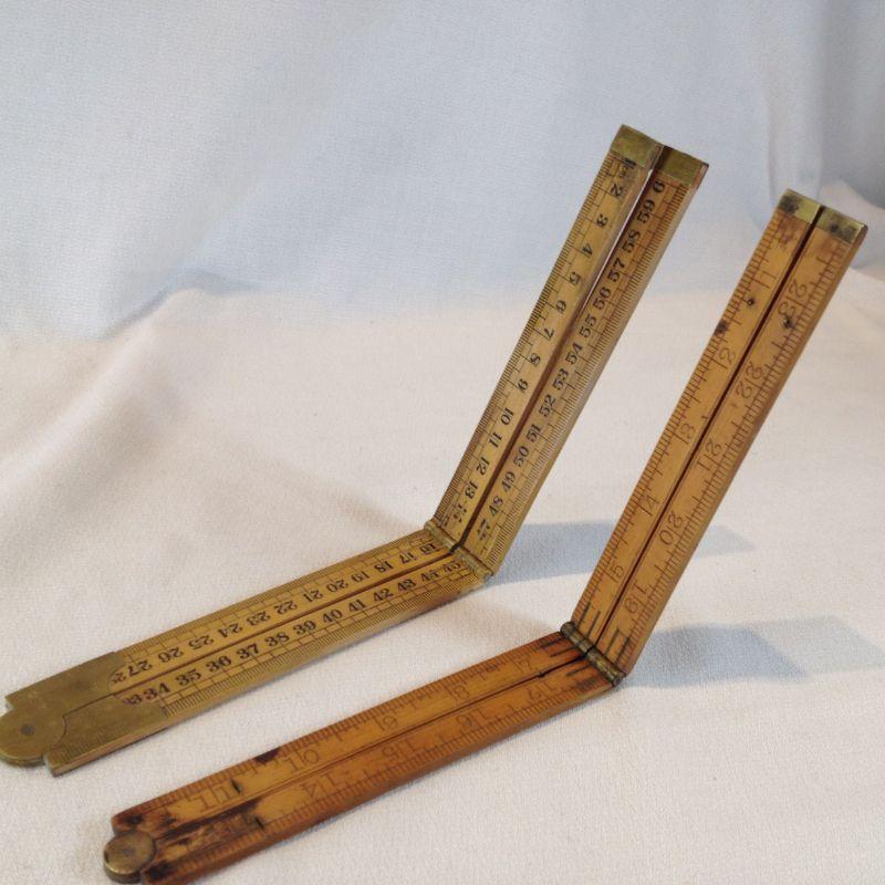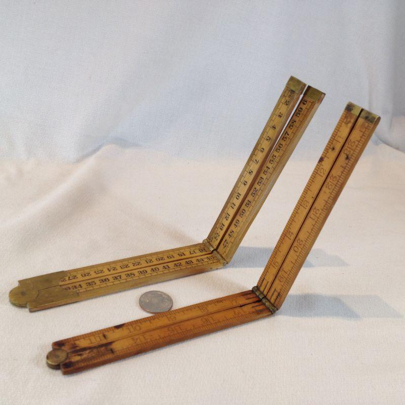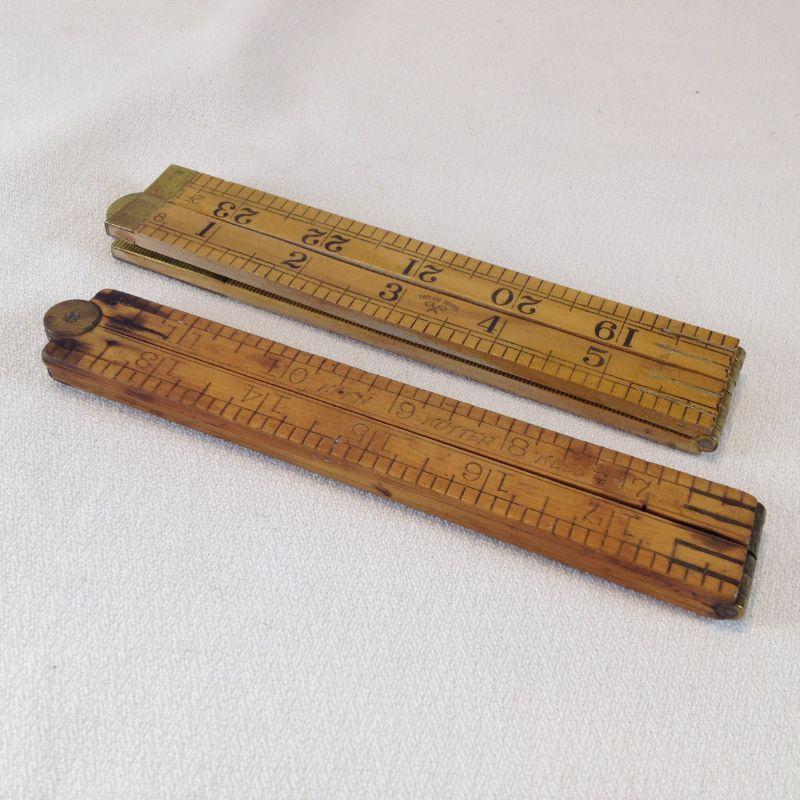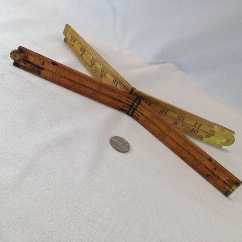 This lot is for a pair of vintage Double Fold Carpenter Rulers. These 24-inch folding rulers are made of brass and wood. One is marked Two Axe Bran #7032 and the other is Kleen Kutter #K680. Both are in good used condition. Reserve/Starting Price is $10.