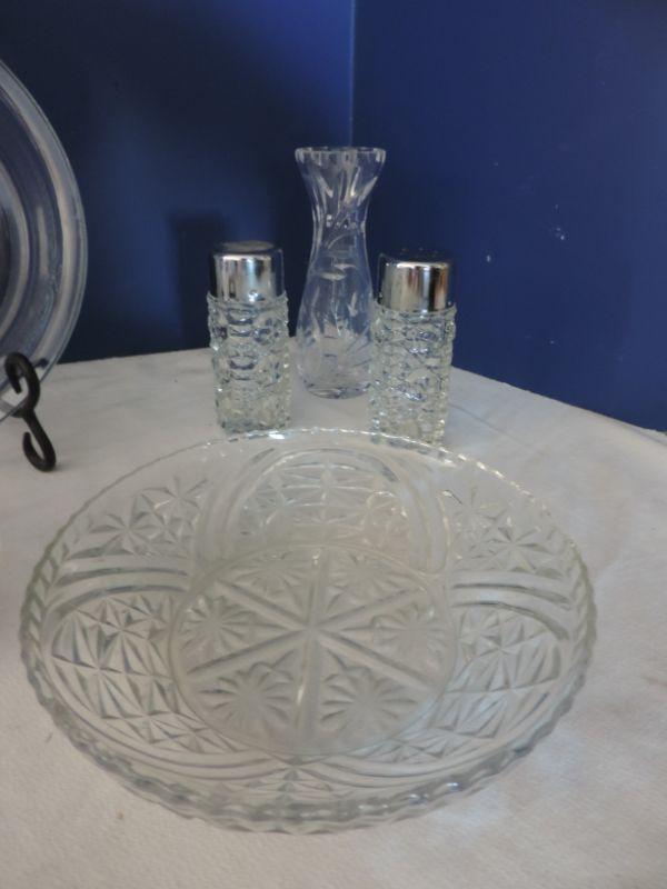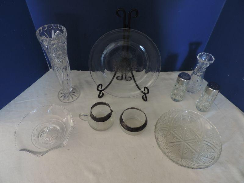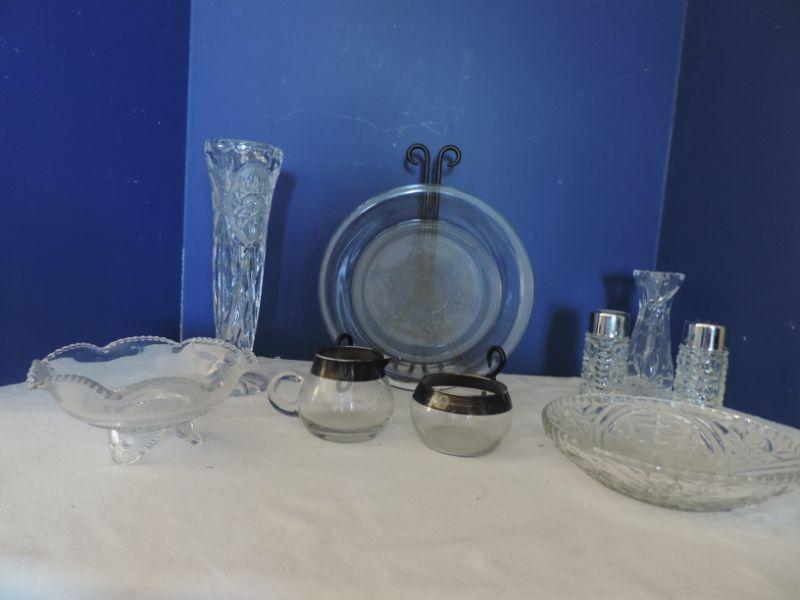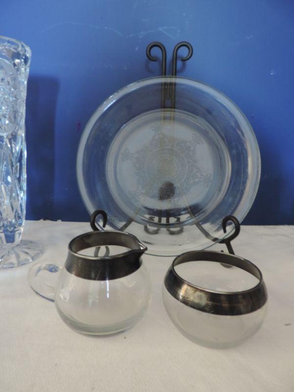 VINTAGE CRYSTAL AND GLASS PIECES TO MAKE ANY OCCASION MORE BEAUTIFUL. SILVER RIM TRIMMED SUGAR/CREAMER-SALT/PEPPER SHAKERS-DISH AND MORE