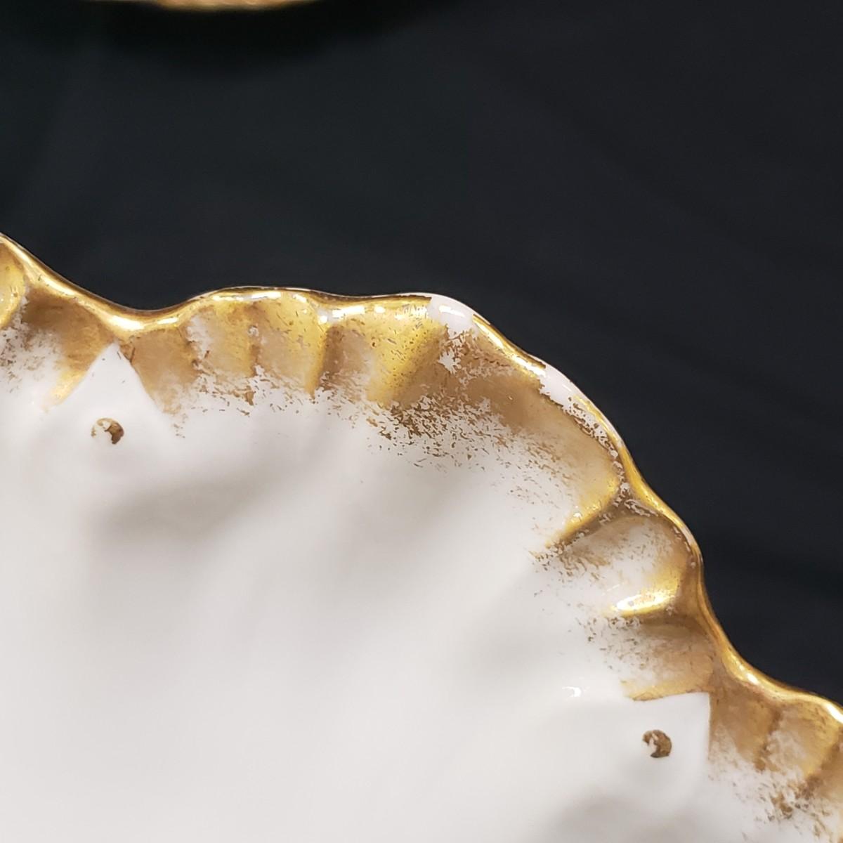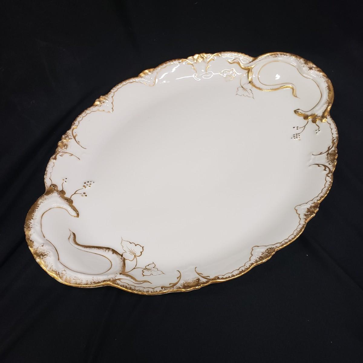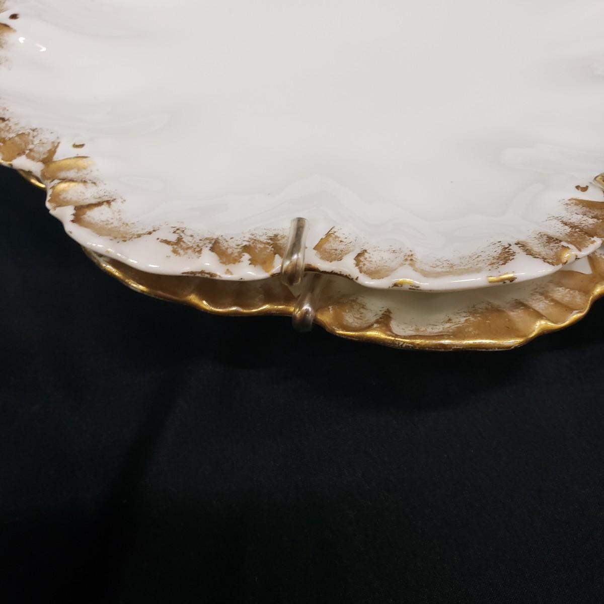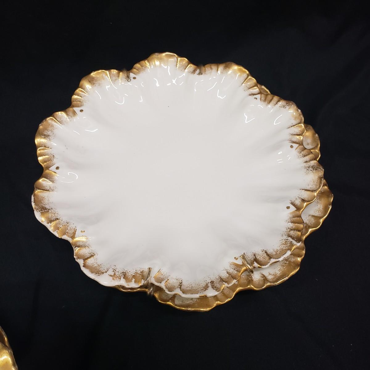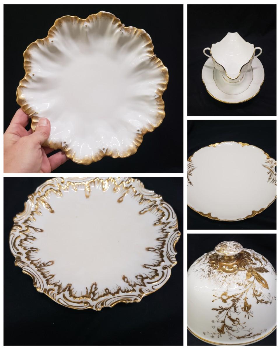 This beautiful gold and white mixed brand of china has 24 pieces. The largest platter with gold edging measures 14" x 10". The smaller Limoges plates have hanging brackets attached, but could easily be removed for serving. The five 9" plates with brackets appear to have some gold edging worn off. The gravy boat measures 10" x 7" x 4"H and is one solid piece. The only clear glass dish with gold features, does have some of the bottom gold worn, yet fill it with your favorite chocolate and viola!