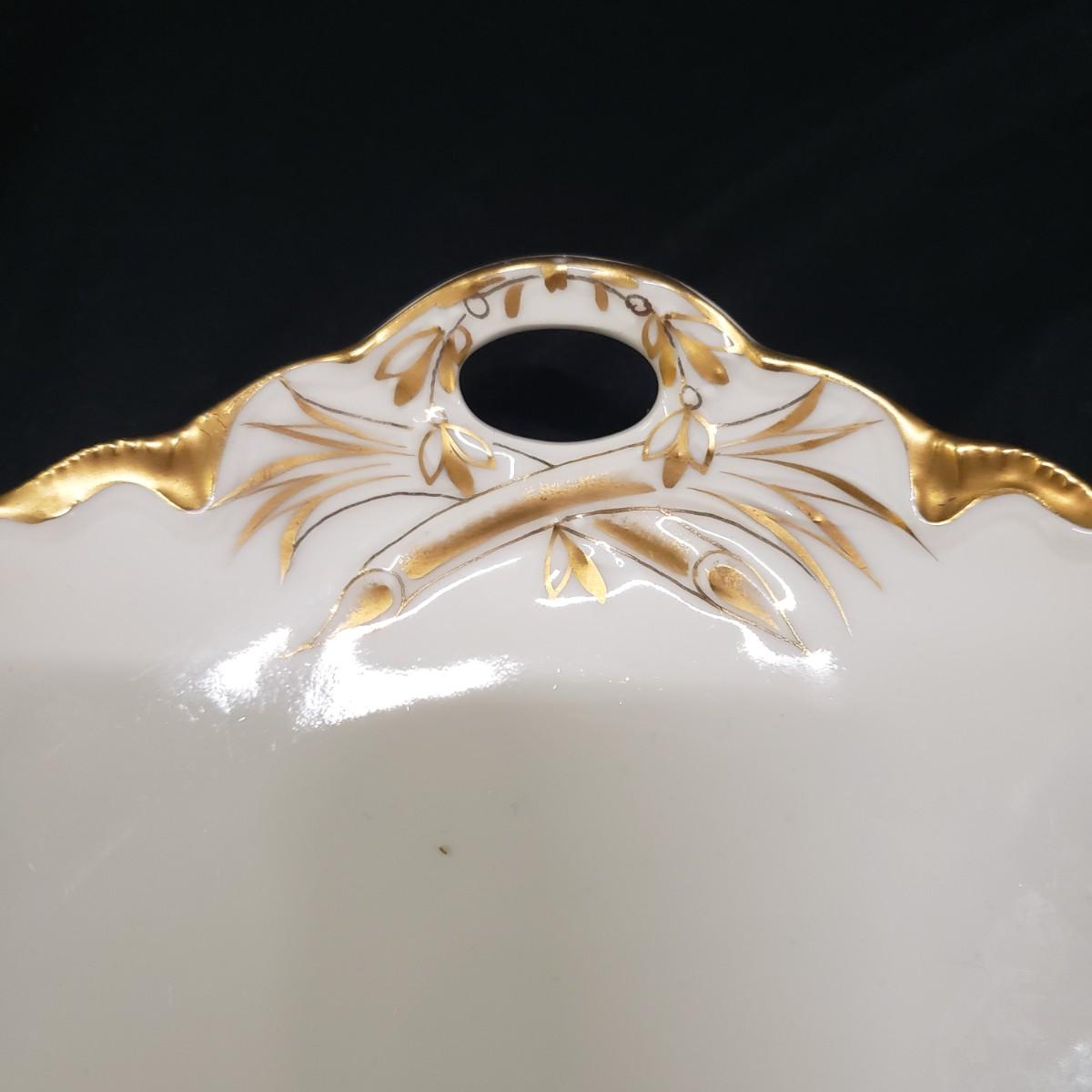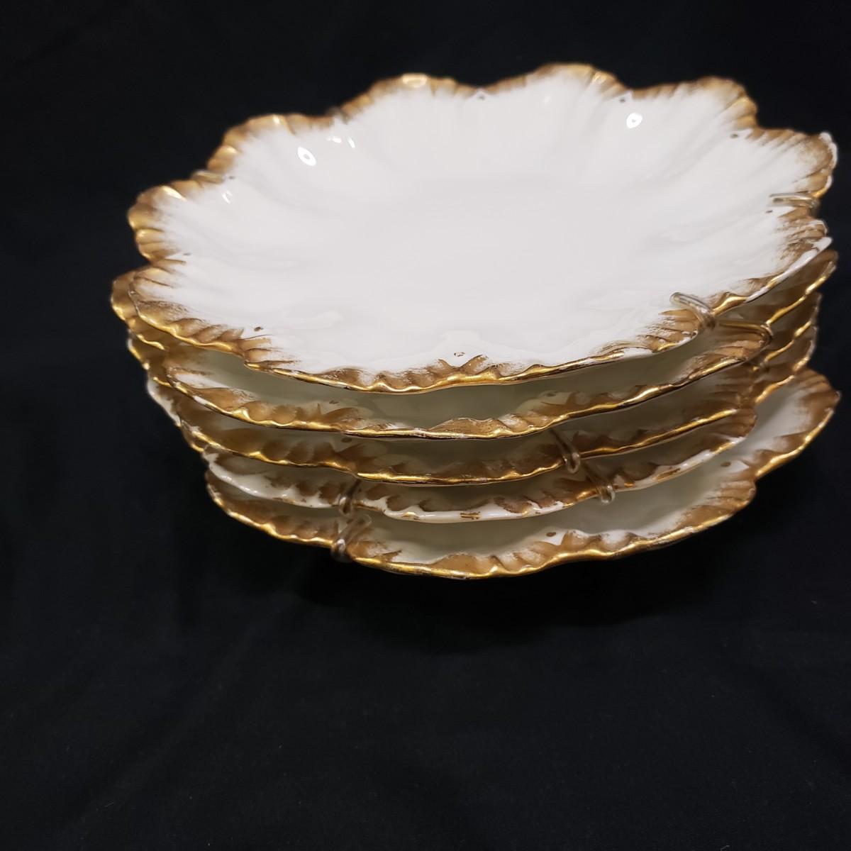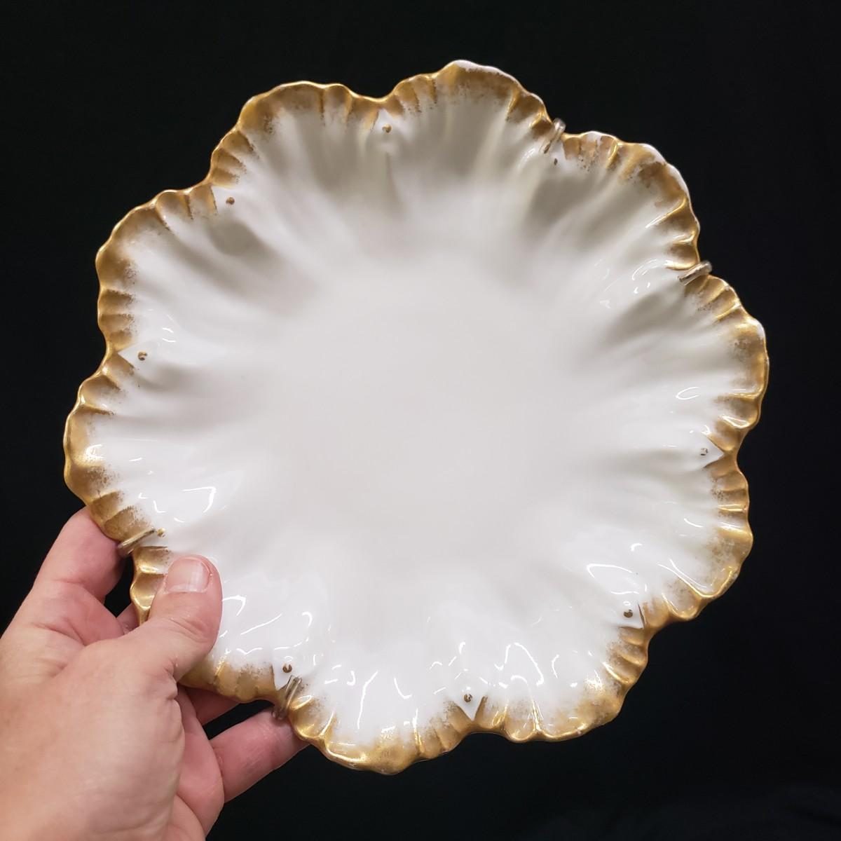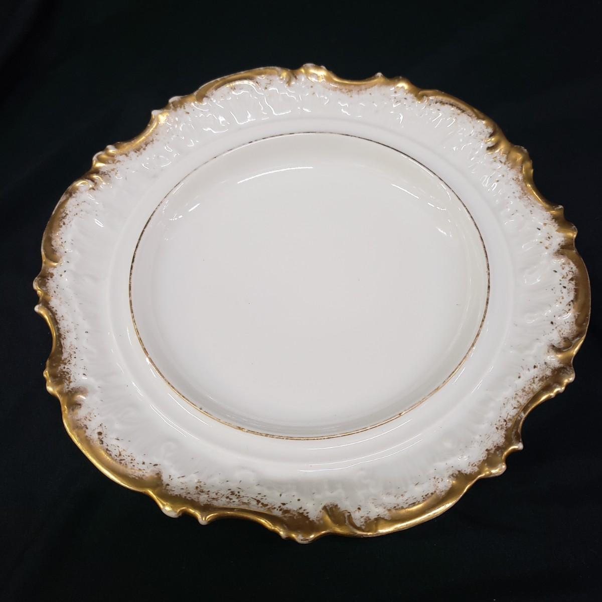This beautiful gold and white mixed brand of china has 24 pieces. The largest platter with gold edging measures 14" x 10". The smaller Limoges plates have hanging brackets attached, but could easily be removed for serving. The five 9" plates with brackets appear to have some gold edging worn off. The gravy boat measures 10" x 7" x 4"H and is one solid piece. The only clear glass dish with gold features, does have some of the bottom gold worn, yet fill it with your favorite chocolate and viola!