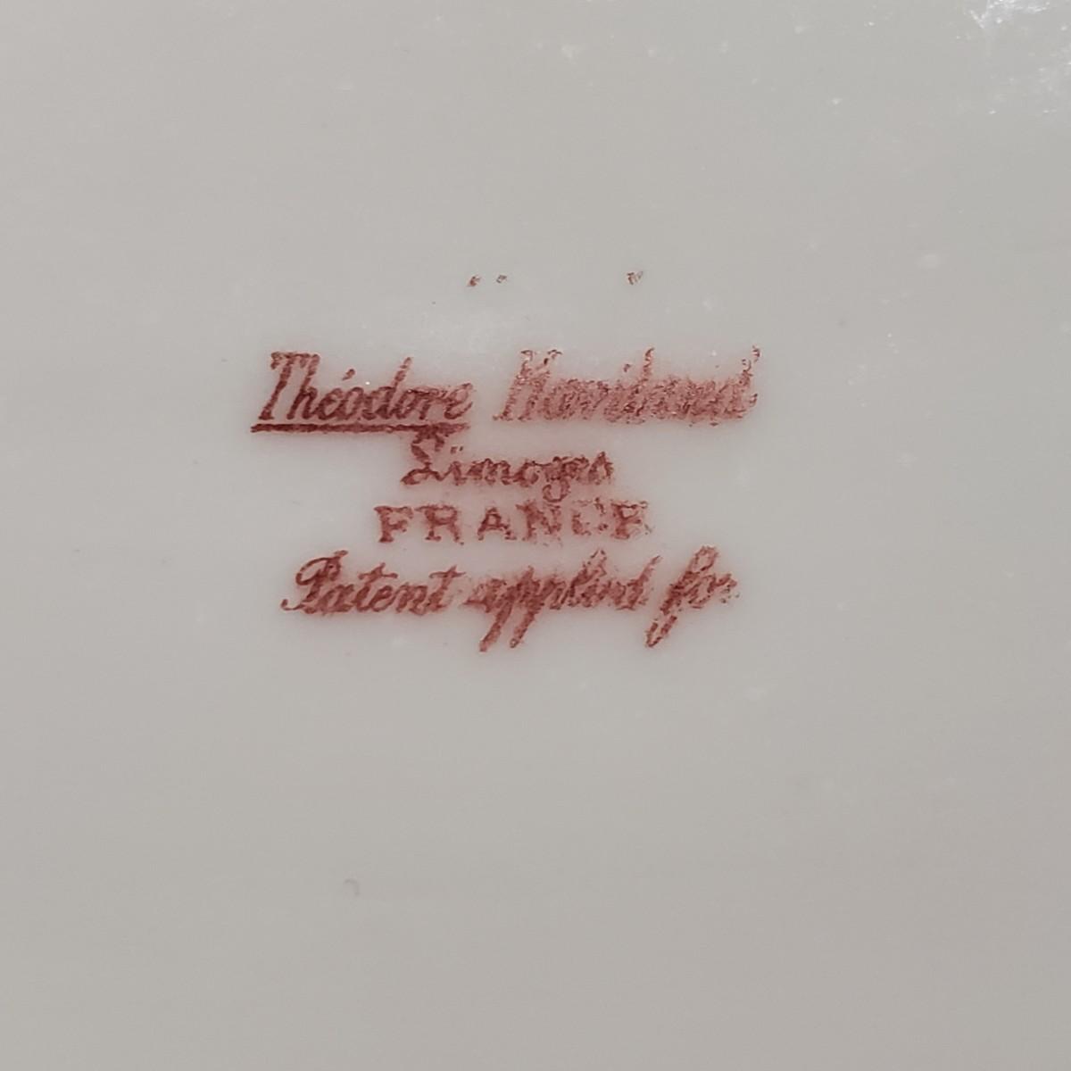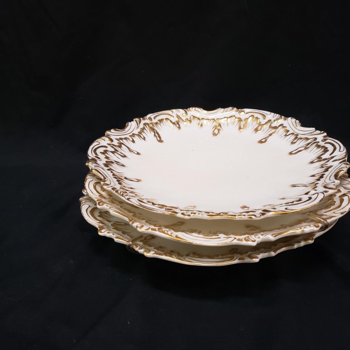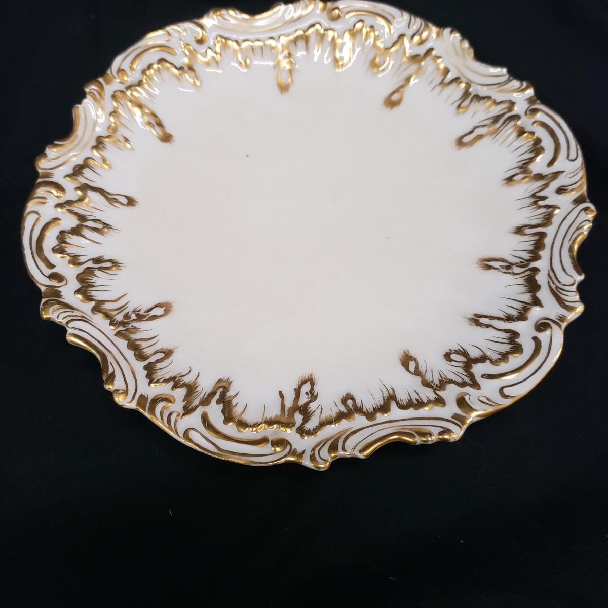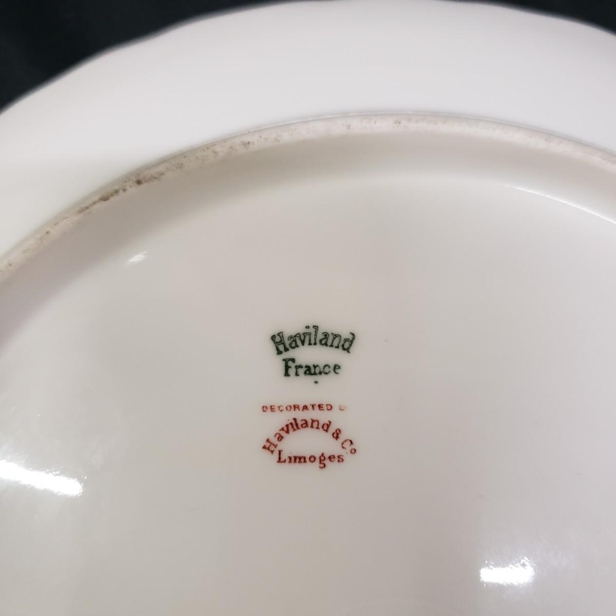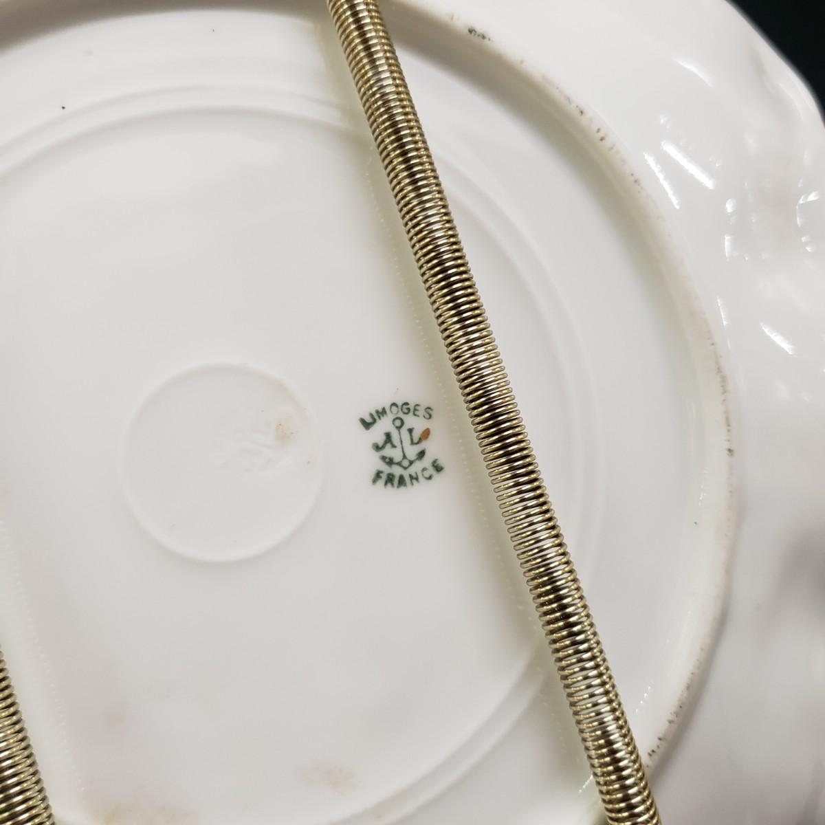 This beautiful gold and white mixed brand of china has 24 pieces. The largest platter with gold edging measures 14" x 10". The smaller Limoges plates have hanging brackets attached, but could easily be removed for serving. The five 9" plates with brackets appear to have some gold edging worn off. The gravy boat measures 10" x 7" x 4"H and is one solid piece. The only clear glass dish with gold features, does have some of the bottom gold worn, yet fill it with your favorite chocolate and viola!