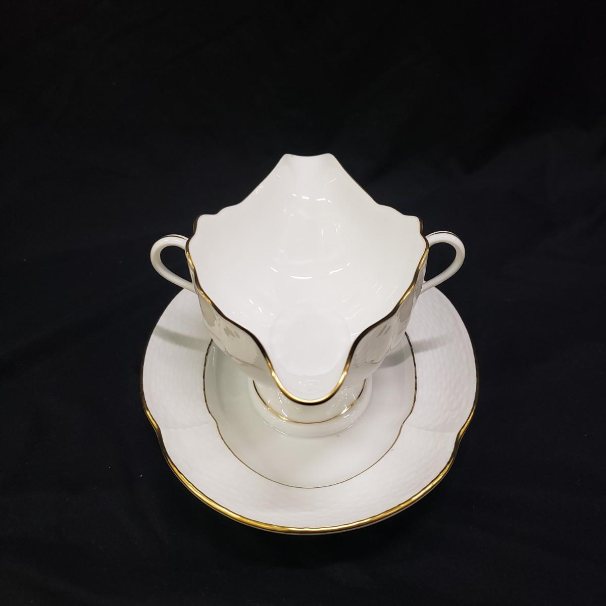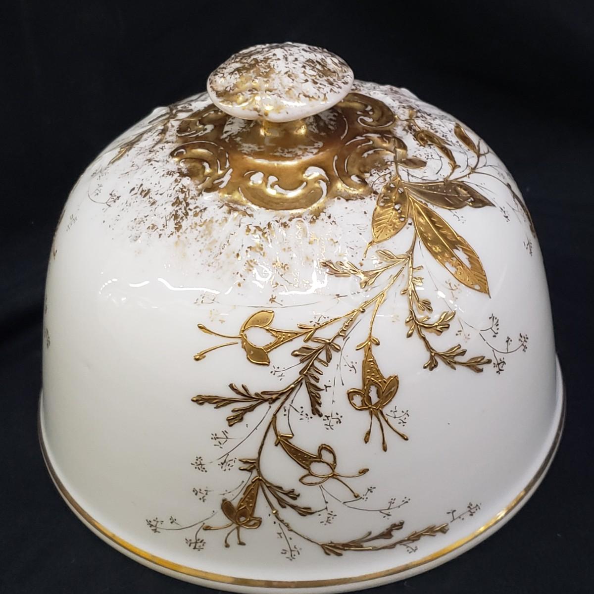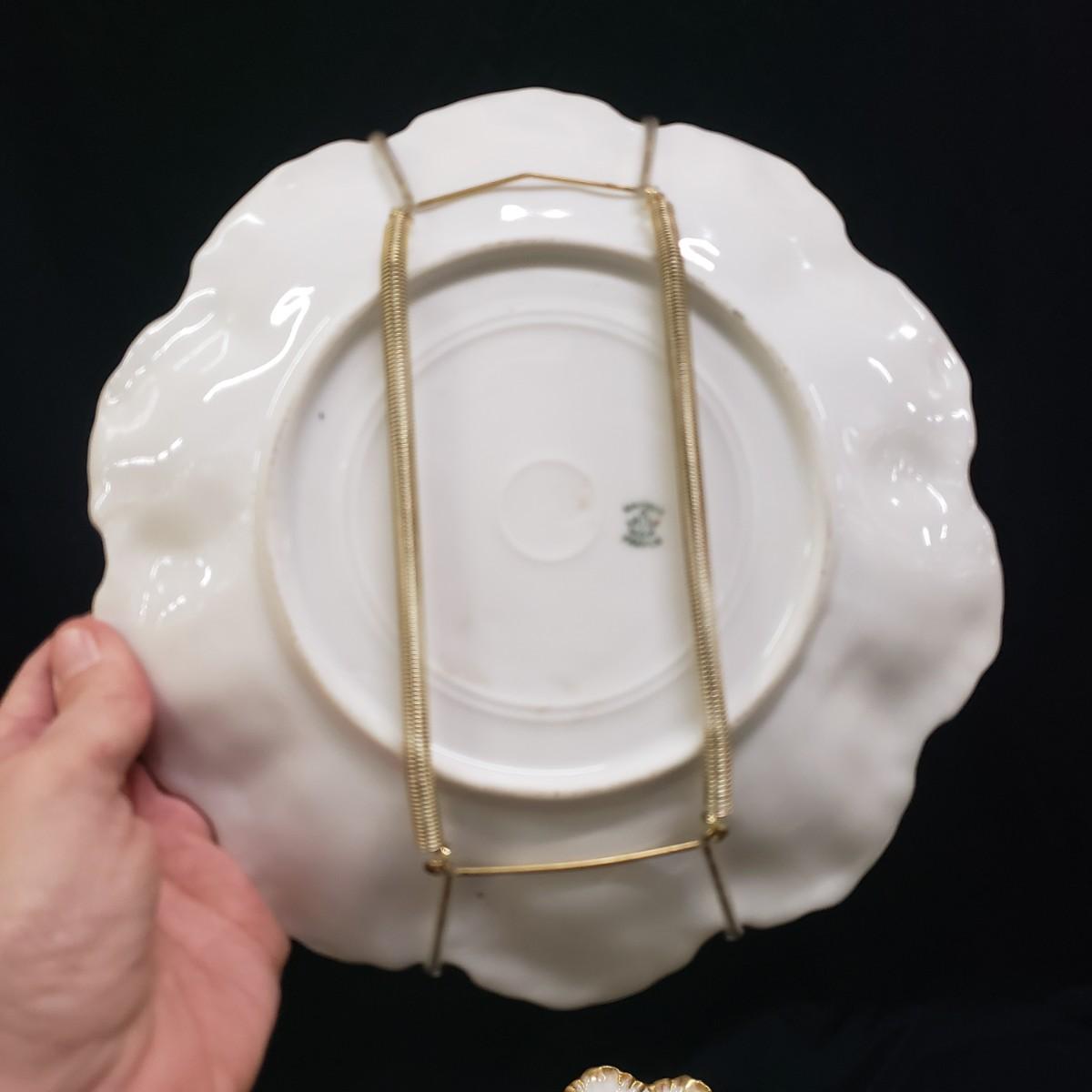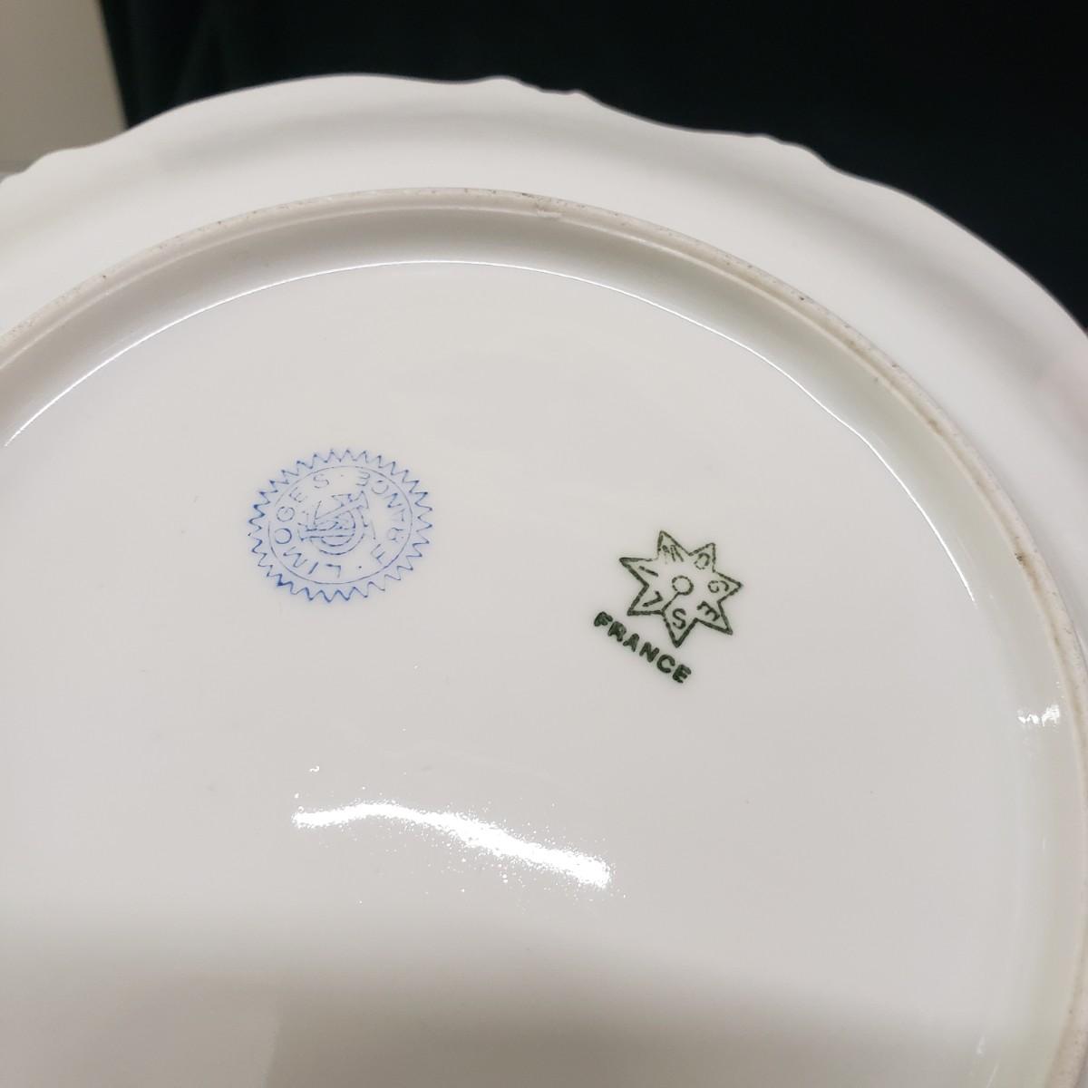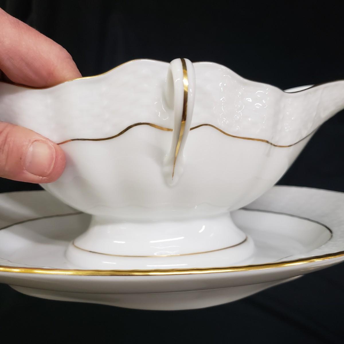 This beautiful gold and white mixed brand of china has 24 pieces. The largest platter with gold edging measures 14" x 10". The smaller Limoges plates have hanging brackets attached, but could easily be removed for serving. The five 9" plates with brackets appear to have some gold edging worn off. The gravy boat measures 10" x 7" x 4"H and is one solid piece. The only clear glass dish with gold features, does have some of the bottom gold worn, yet fill it with your favorite chocolate and viola!