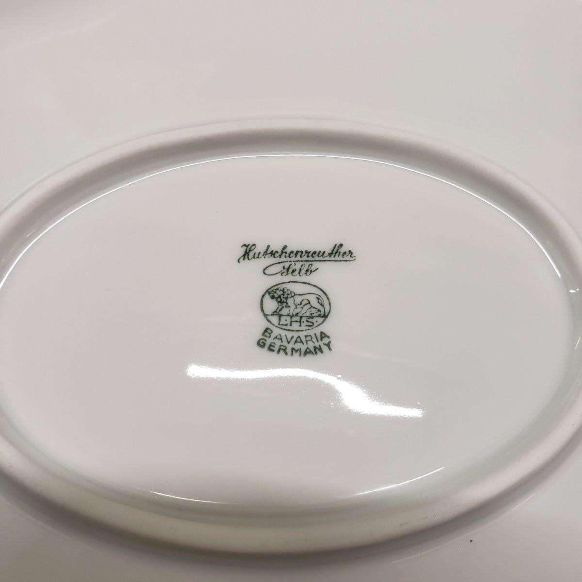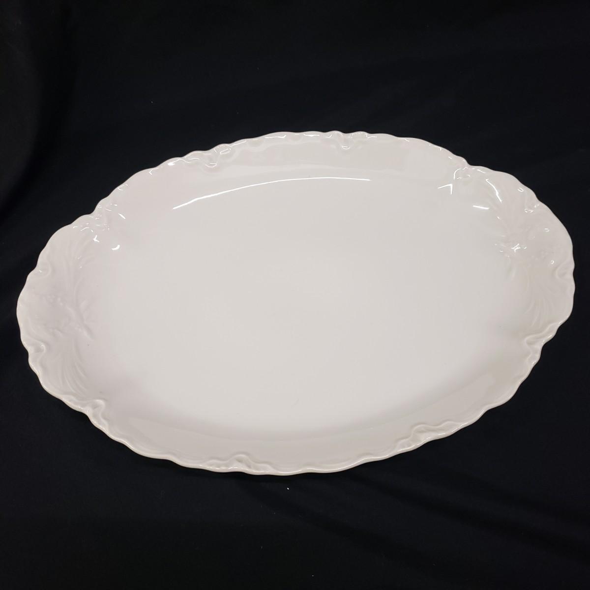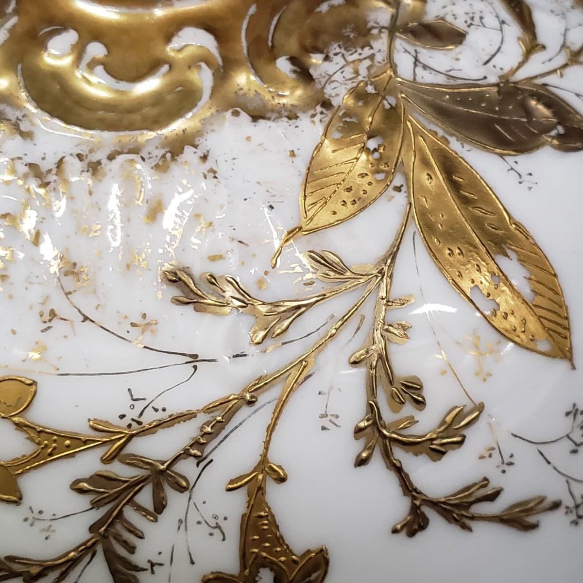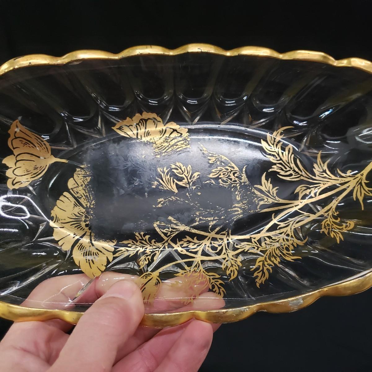 This beautiful gold and white mixed brand of china has 24 pieces. The largest platter with gold edging measures 14" x 10". The smaller Limoges plates have hanging brackets attached, but could easily be removed for serving. The five 9" plates with brackets appear to have some gold edging worn off. The gravy boat measures 10" x 7" x 4"H and is one solid piece. The only clear glass dish with gold features, does have some of the bottom gold worn, yet fill it with your favorite chocolate and viola!