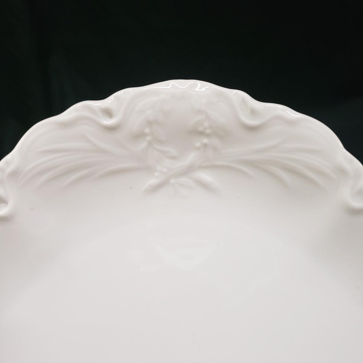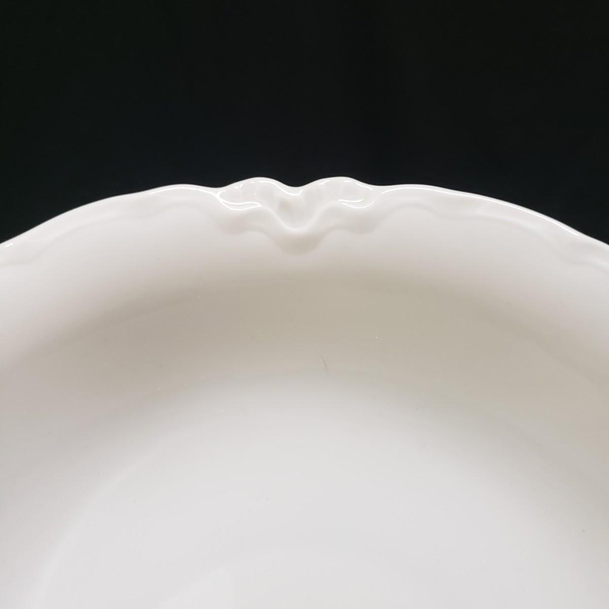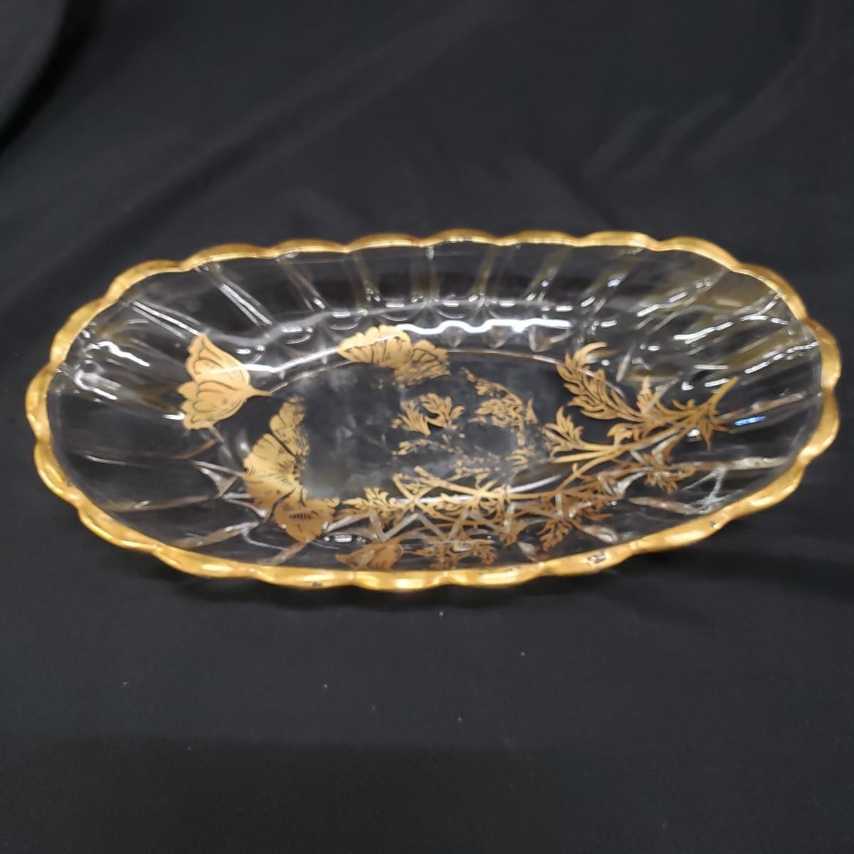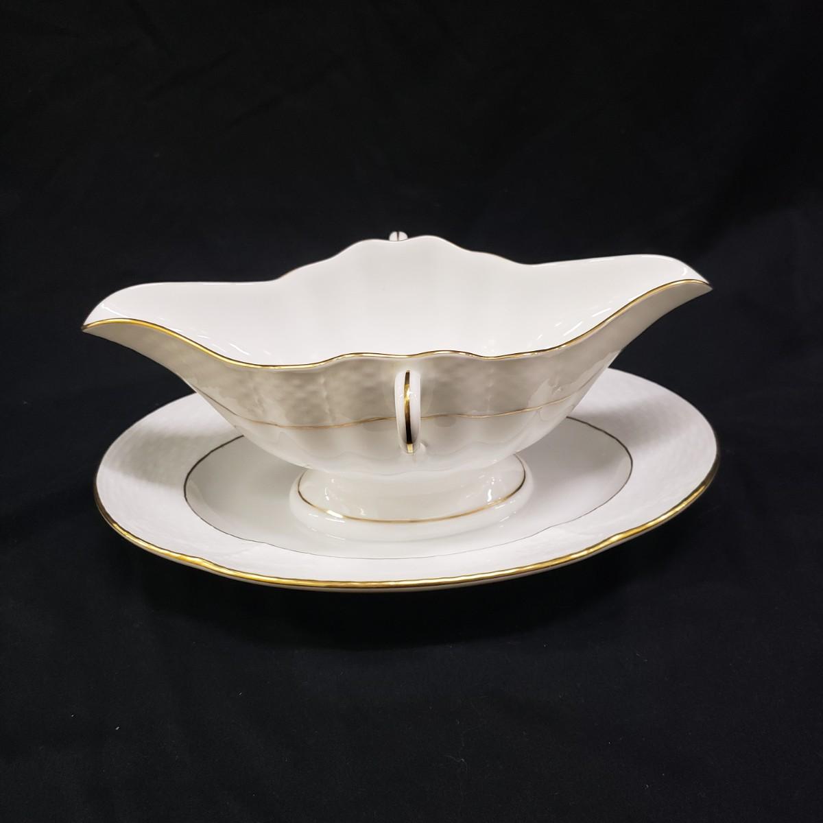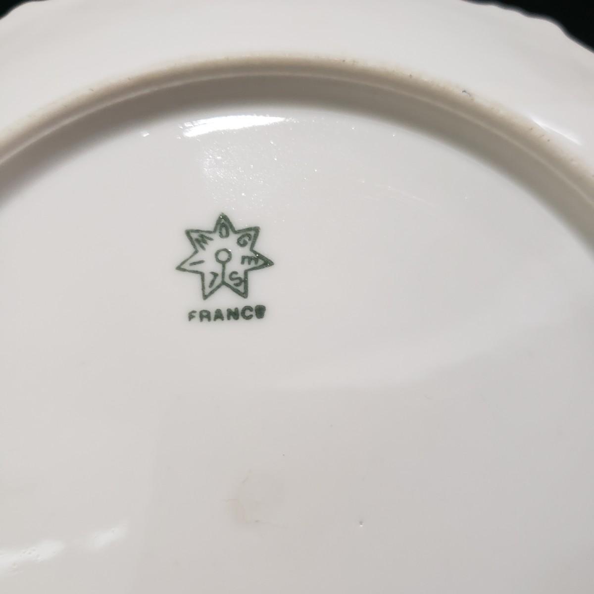 This beautiful gold and white mixed brand of china has 24 pieces. The largest platter with gold edging measures 14" x 10". The smaller Limoges plates have hanging brackets attached, but could easily be removed for serving. The five 9" plates with brackets appear to have some gold edging worn off. The gravy boat measures 10" x 7" x 4"H and is one solid piece. The only clear glass dish with gold features, does have some of the bottom gold worn, yet fill it with your favorite chocolate and viola!