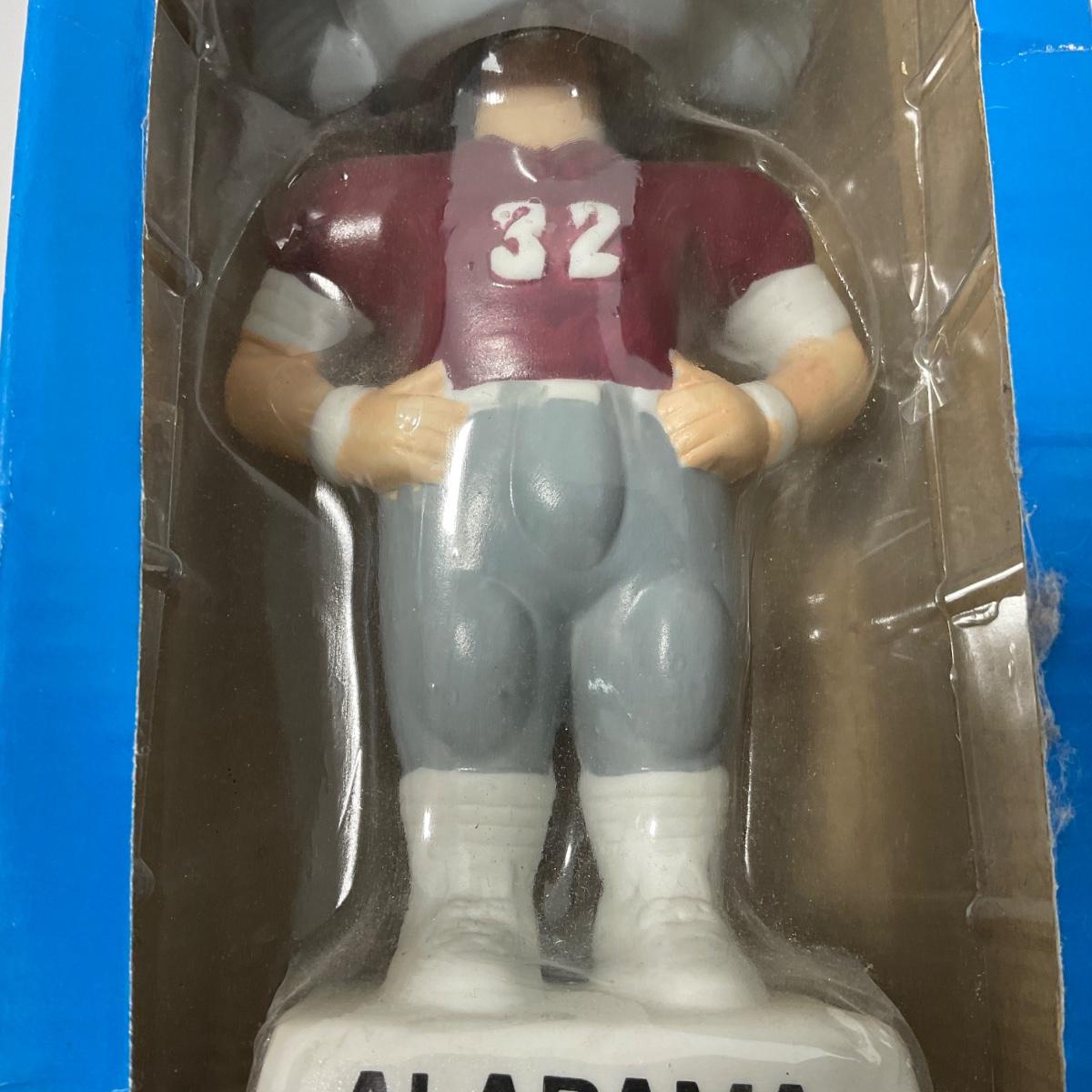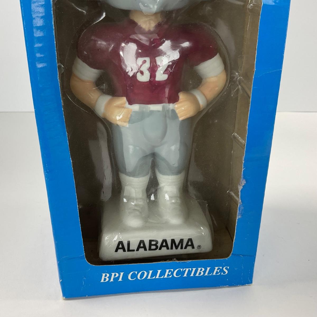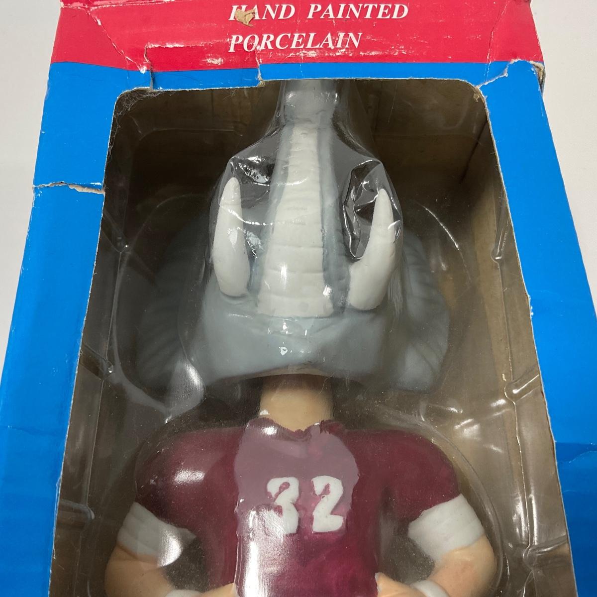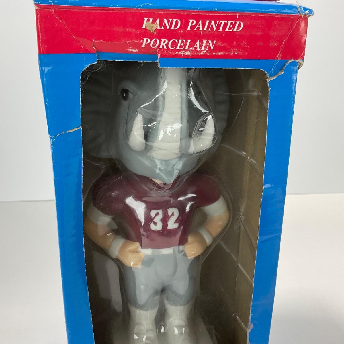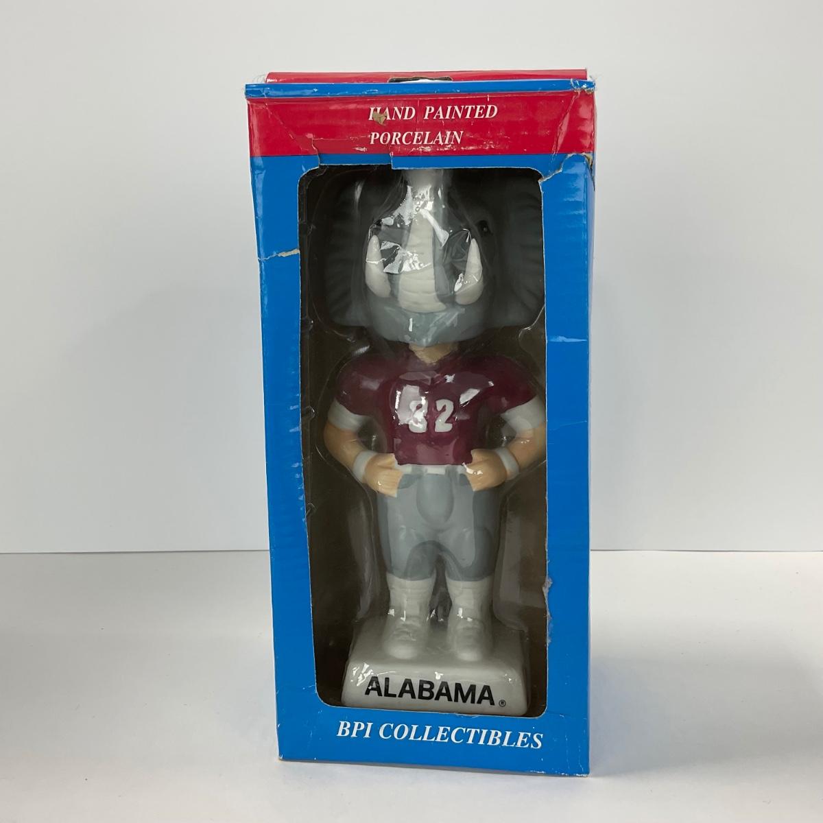 One vintage hand painted Alabama Crimson college Mascot BPI nodder bobbled head in box. Box does have some damage. 5 inches by 10 inches. Please see photos for details and condition. ::: Shipping is available on this lot. If you require shipping you must let us know at the close of the auction. We will coordinate with you after the item has been won. Shipping fees will include insurance up to or exceeding the value of all items being mailed. If you have any questions regarding this lot please contact the auctioneer either via this website, by direct email or by phone. PICK UP TIMES and other important information can be found in the TERMS and DESCRIPTION of the auction. Please take a look for pertinent information. Thanks!