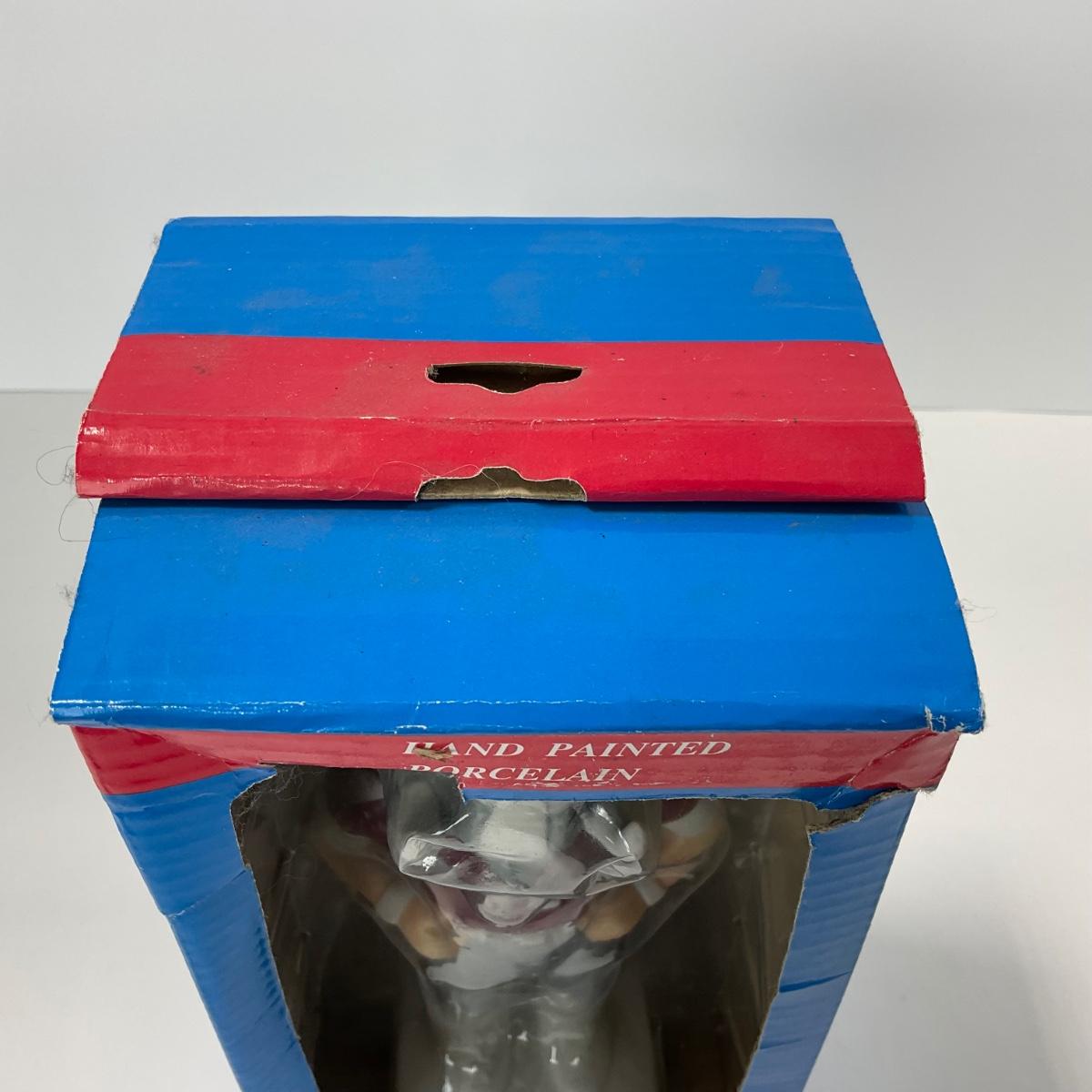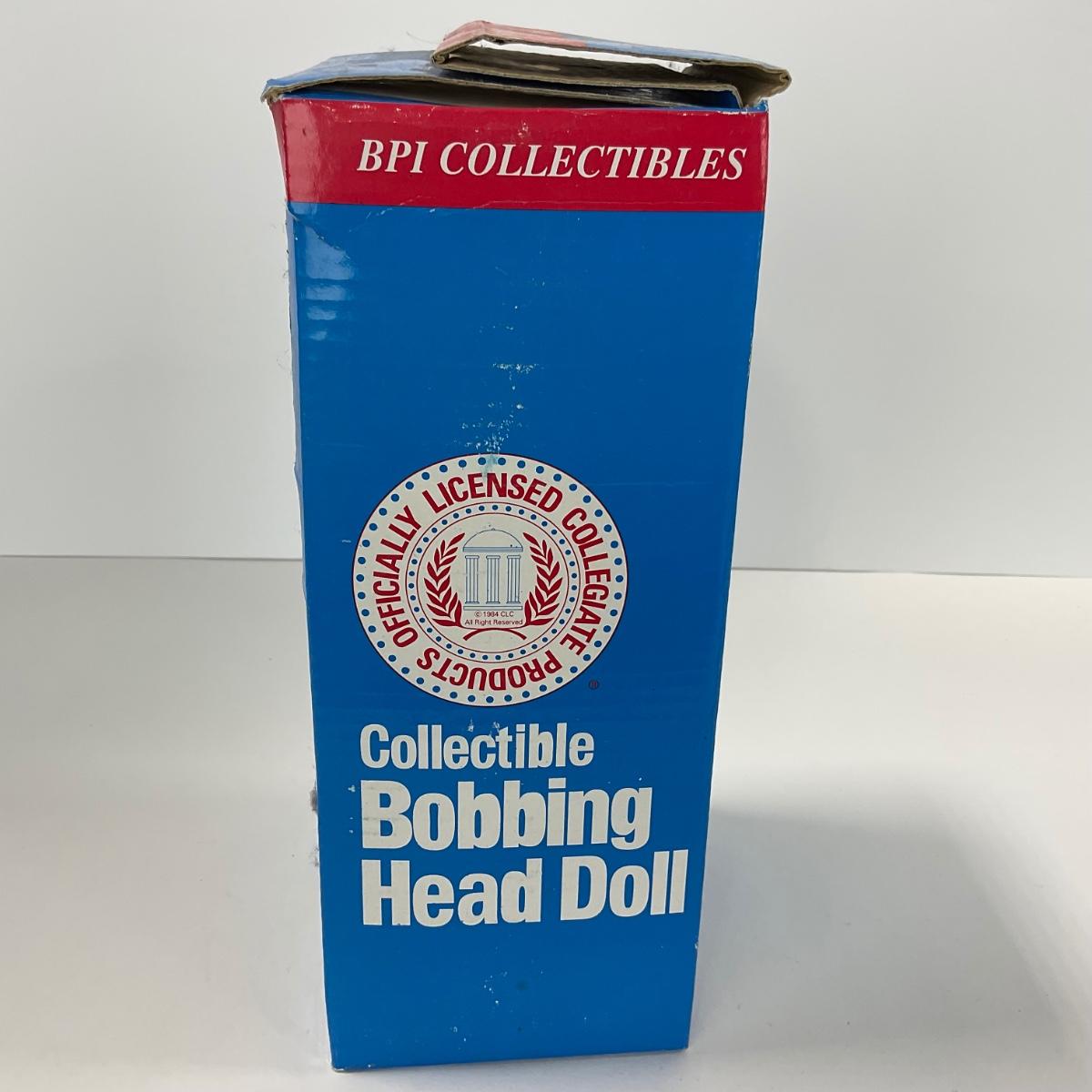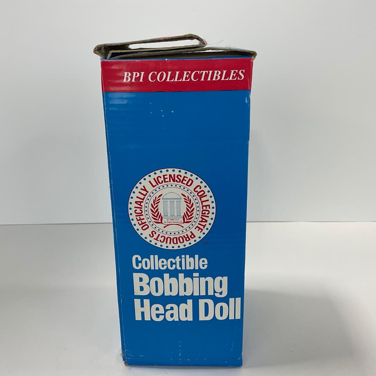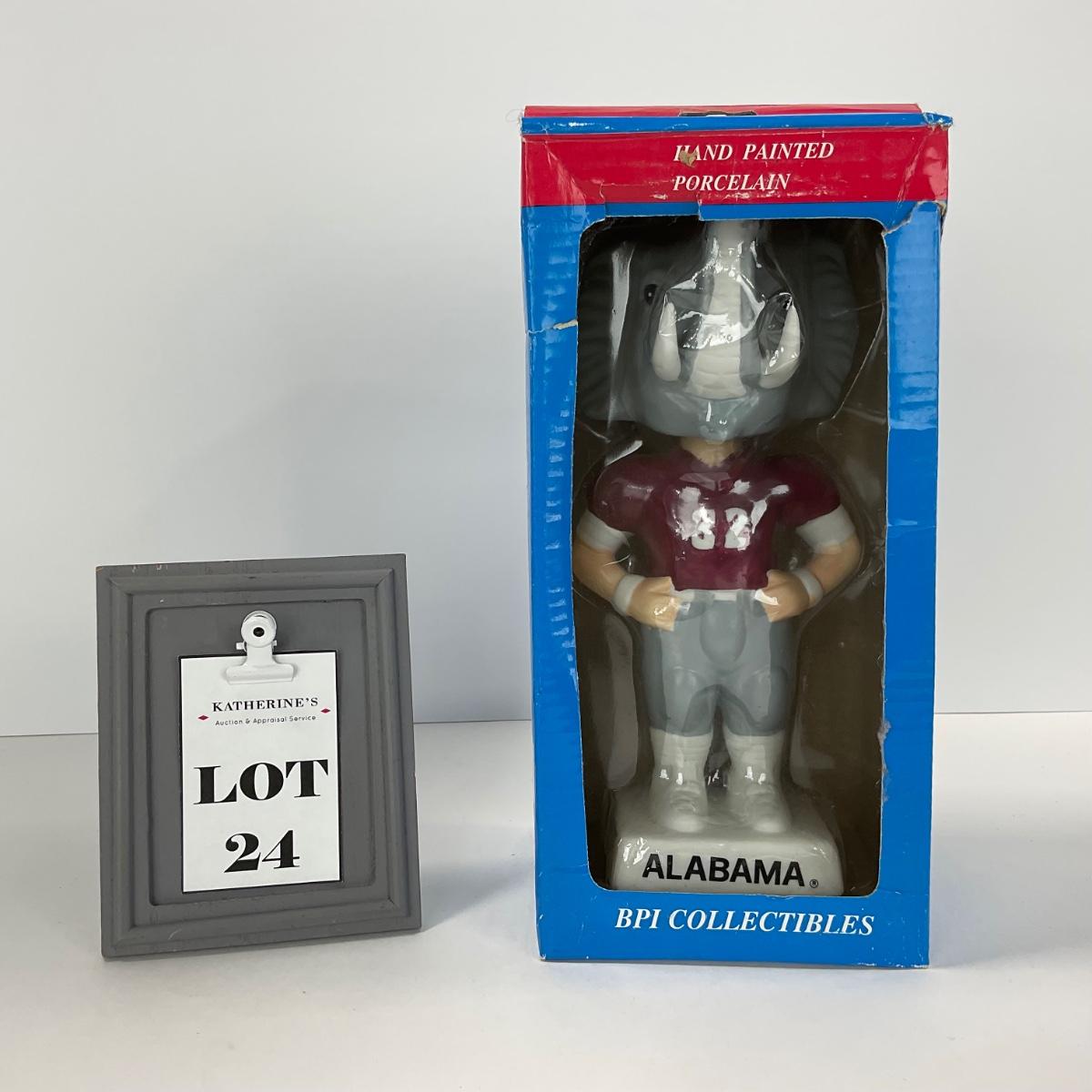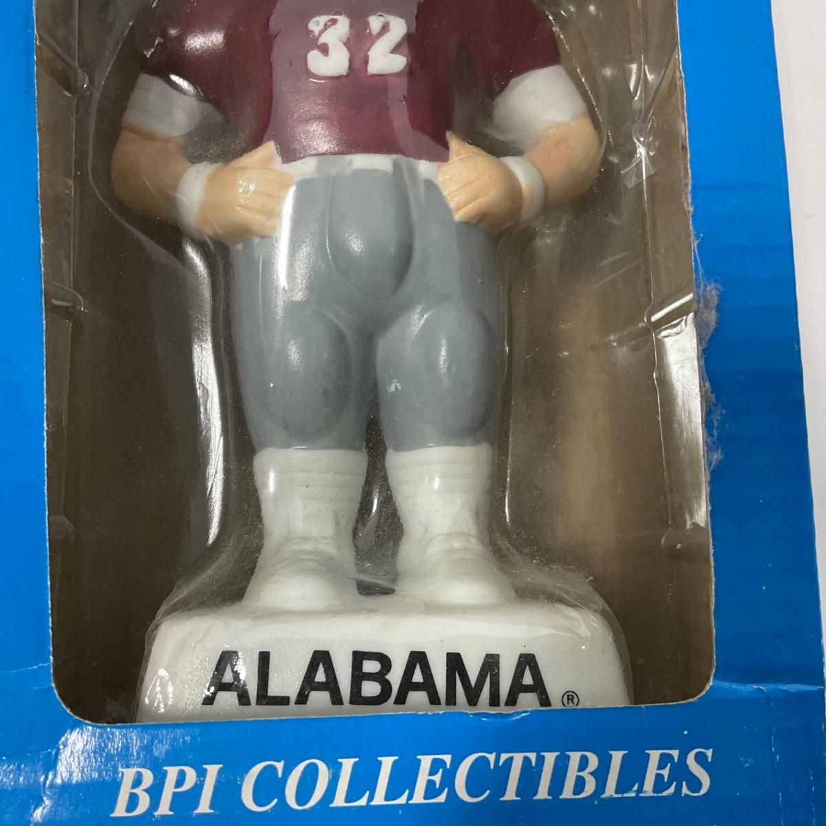 One vintage hand painted Alabama Crimson college Mascot BPI nodder bobbled head in box. Box does have some damage. 5 inches by 10 inches. Please see photos for details and condition. ::: Shipping is available on this lot. If you require shipping you must let us know at the close of the auction. We will coordinate with you after the item has been won. Shipping fees will include insurance up to or exceeding the value of all items being mailed. If you have any questions regarding this lot please contact the auctioneer either via this website, by direct email or by phone. PICK UP TIMES and other important information can be found in the TERMS and DESCRIPTION of the auction. Please take a look for pertinent information. Thanks!