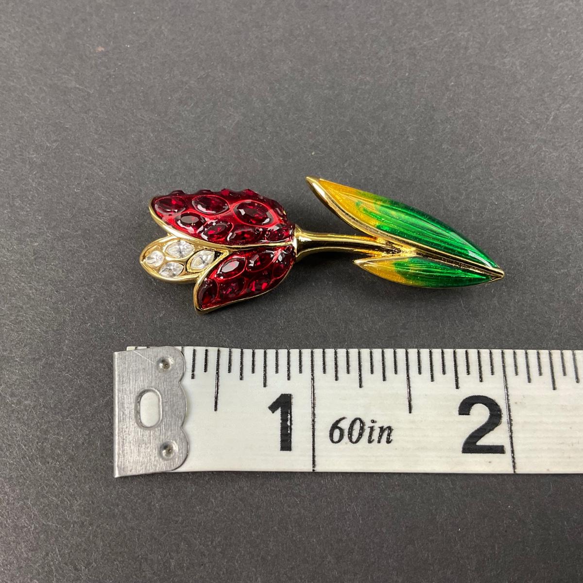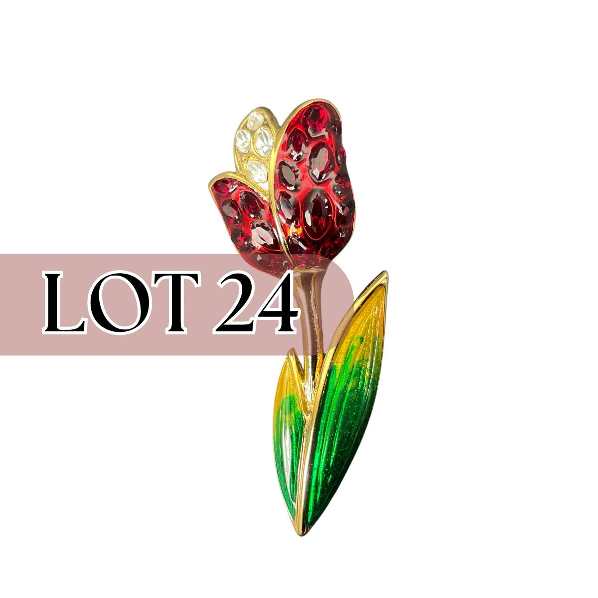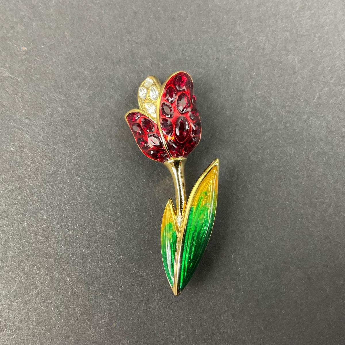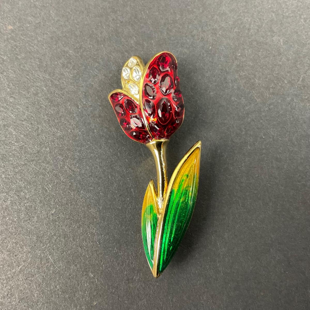 One vintage Swarovski pave crystal tulip flower red and green in color brooch. This piece has no damage, and appears to be in great shape with no visable chips, cracks, or broken pieces. Please see photos for details and condition. Any condition statement is given as a courtesy to a client, is an opinion, and should not be treated as a statement of fact. Reference to condition written, oral or within a condition report shall not be regarded as a full account of condition and may not include all defects, alterations, or restorations. Absence of a condition report does not imply a lot is flawless or lacking imperfections or damage. Katherine’s Auction & Appraisal Service shall have no responsibility for any error or omission. Returns shall not be accepted on the basis of condition. ::: Shipping is available on this lot. If you require shipping you must let us know at the close of the auction. We will coordinate with you after the item has been won. Shipping fees will include insurance up to or exceeding the value of all items being mailed. If you have any questions regarding this lot please contact the auctioneer either via this website, by direct email or by phone. PICK UP TIMES and other important information can be found in the TERMS and DESCRIPTION of the auction. Please take a look for pertinent information. Thanks!